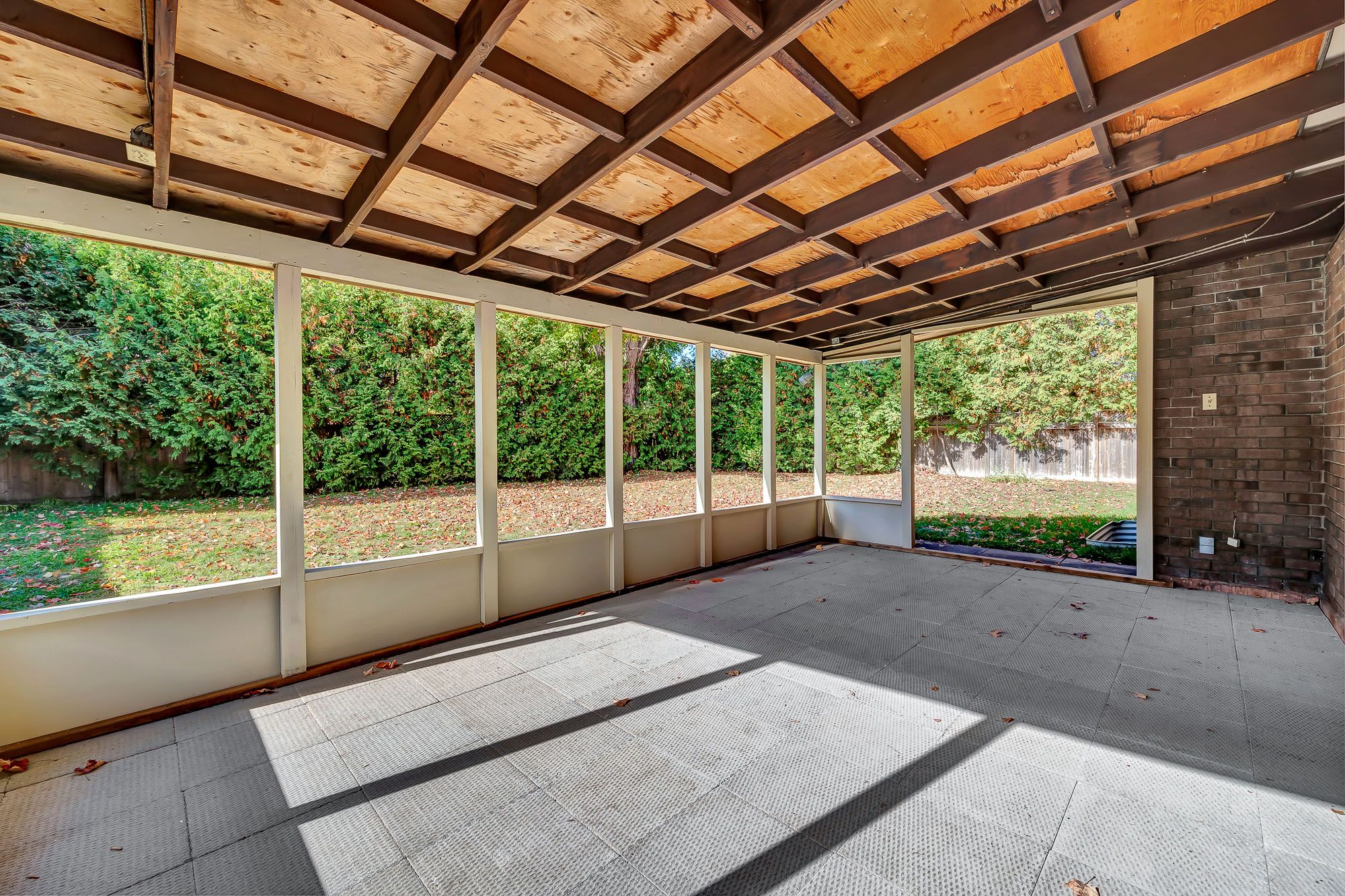 • Sunny backyard with covered patio, perfect for relaxation or work.