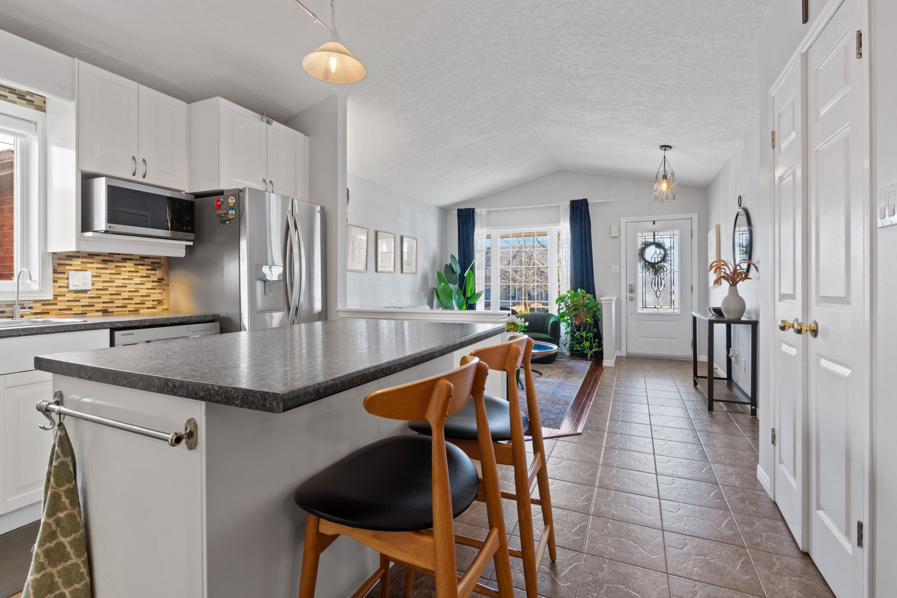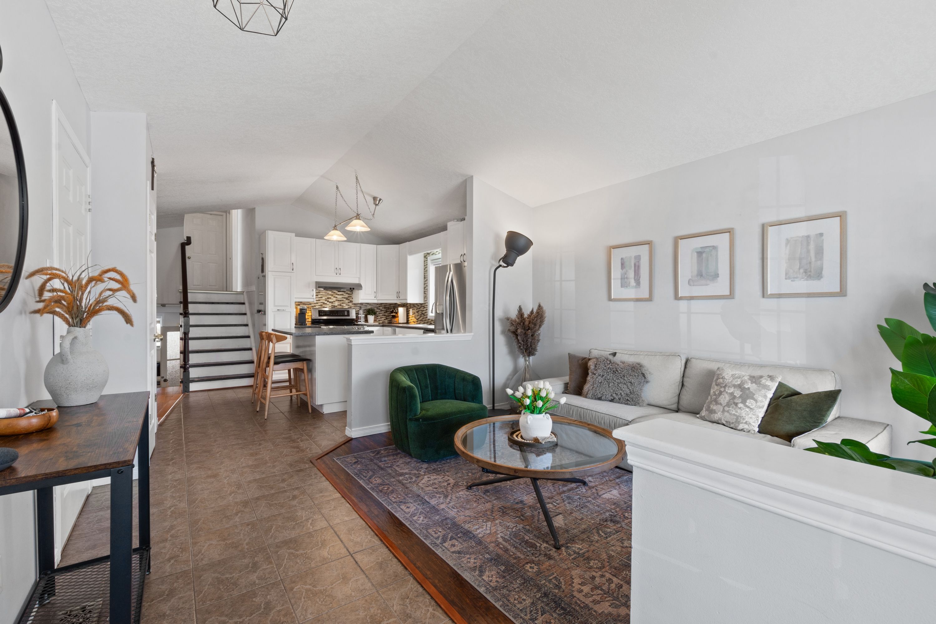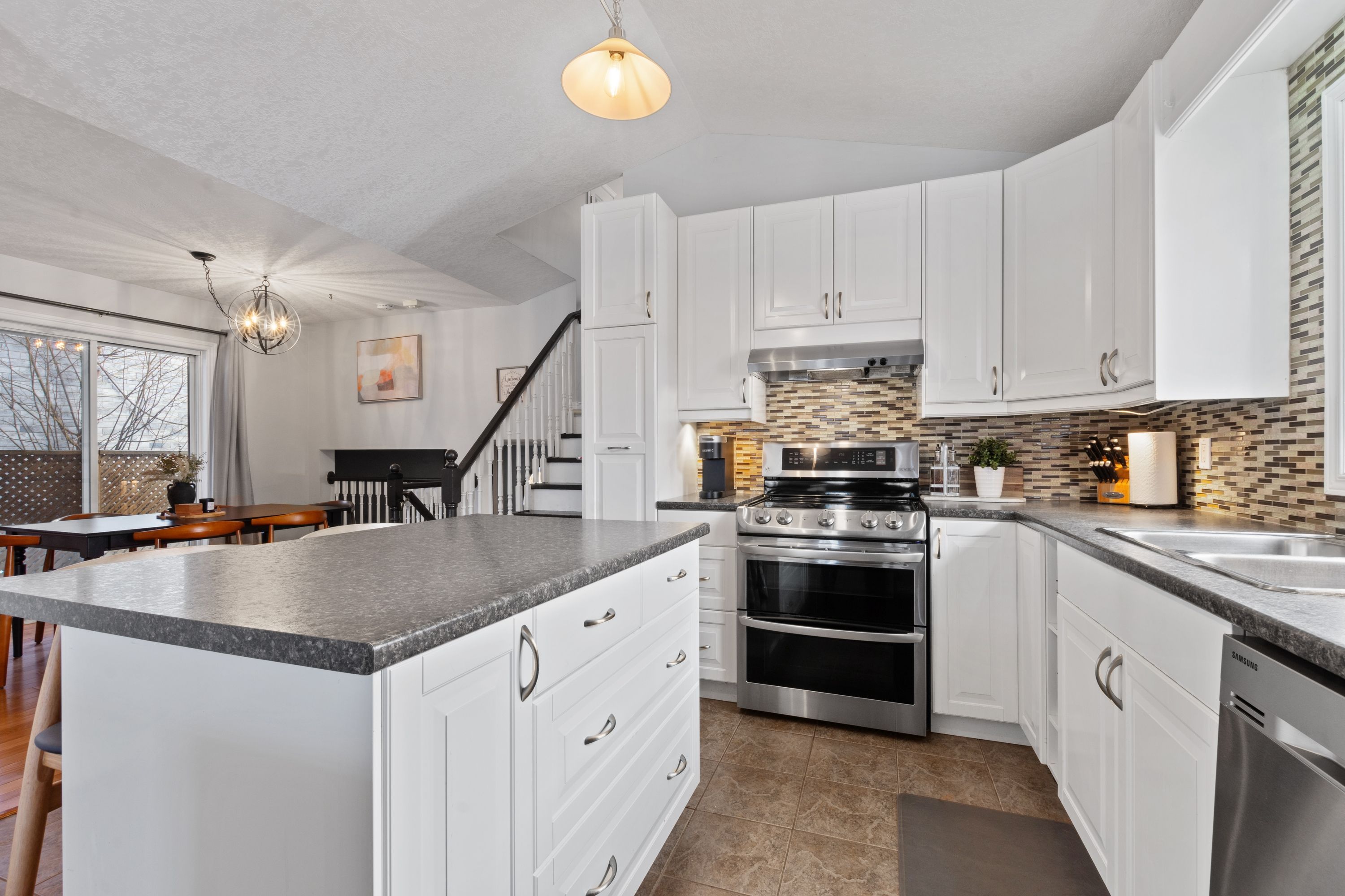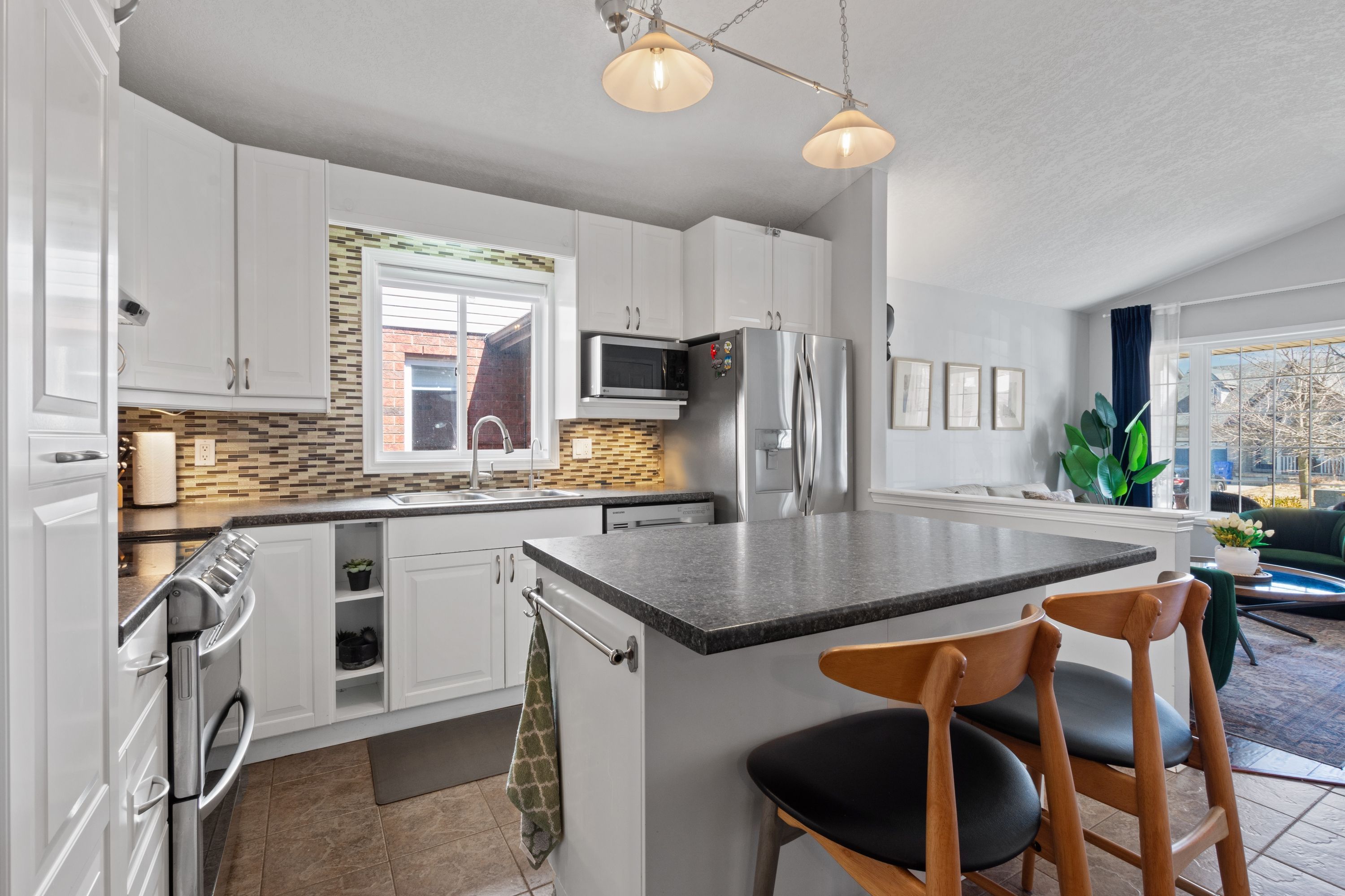 • Bright living room and airy kitchen with stainless steel appliances.