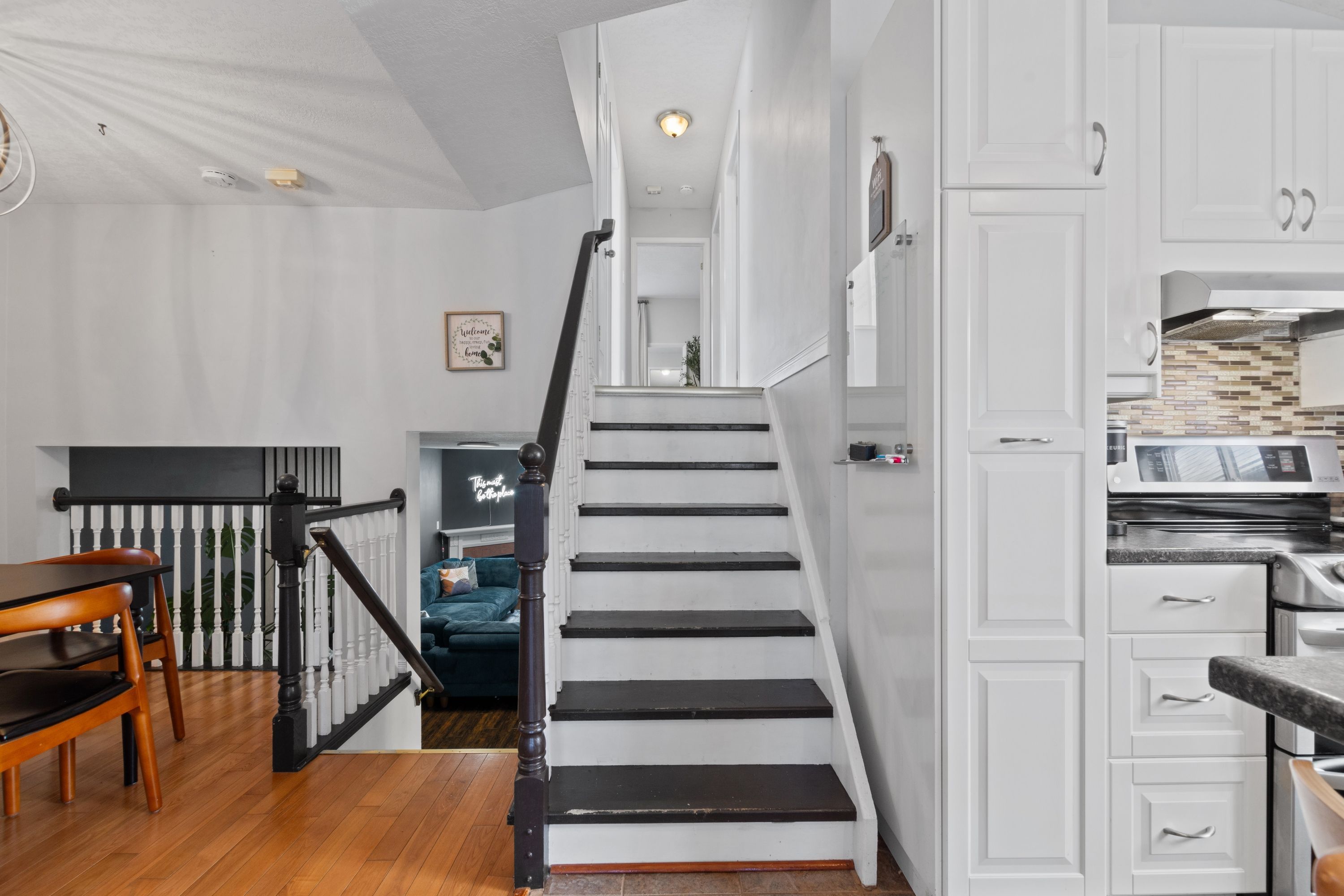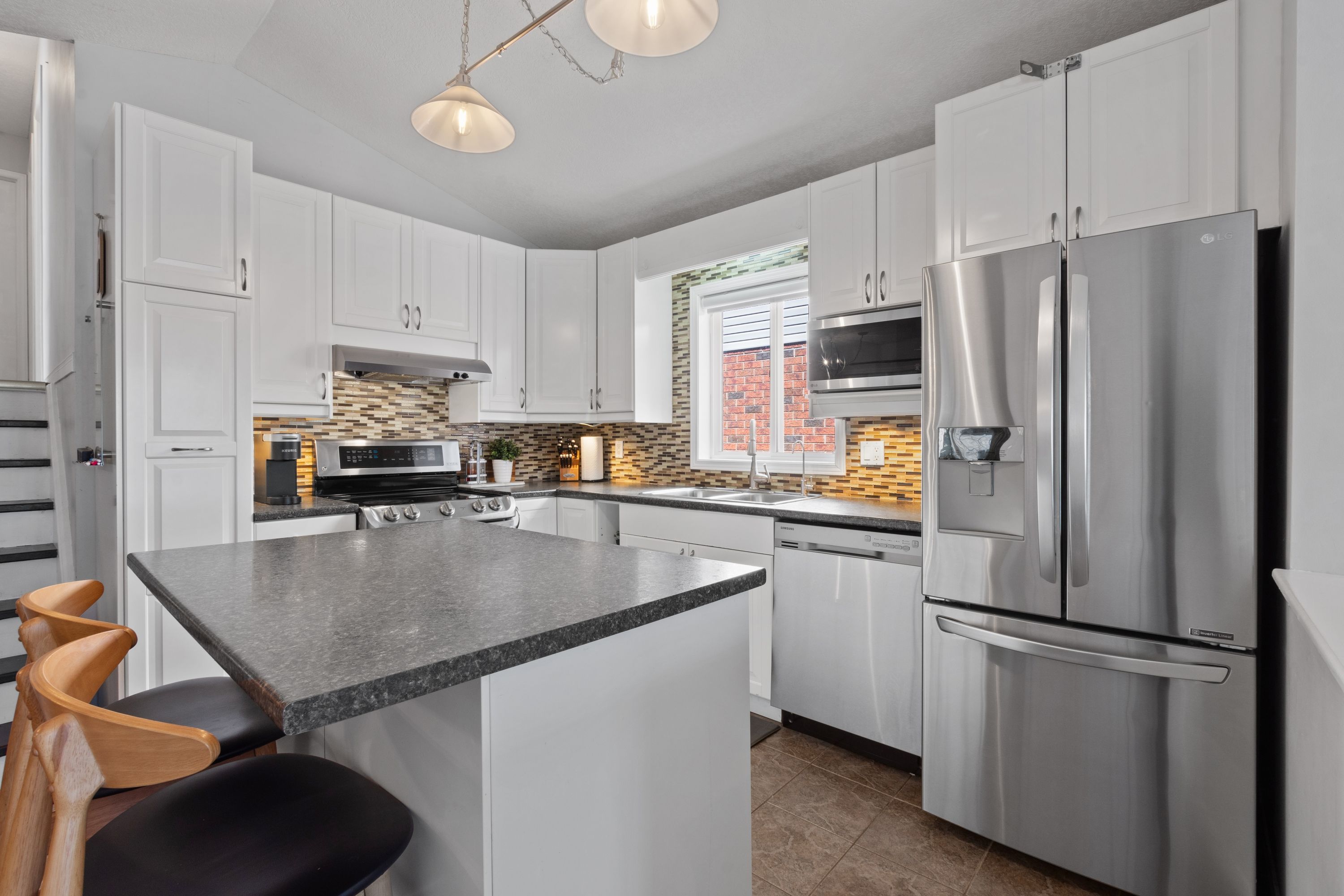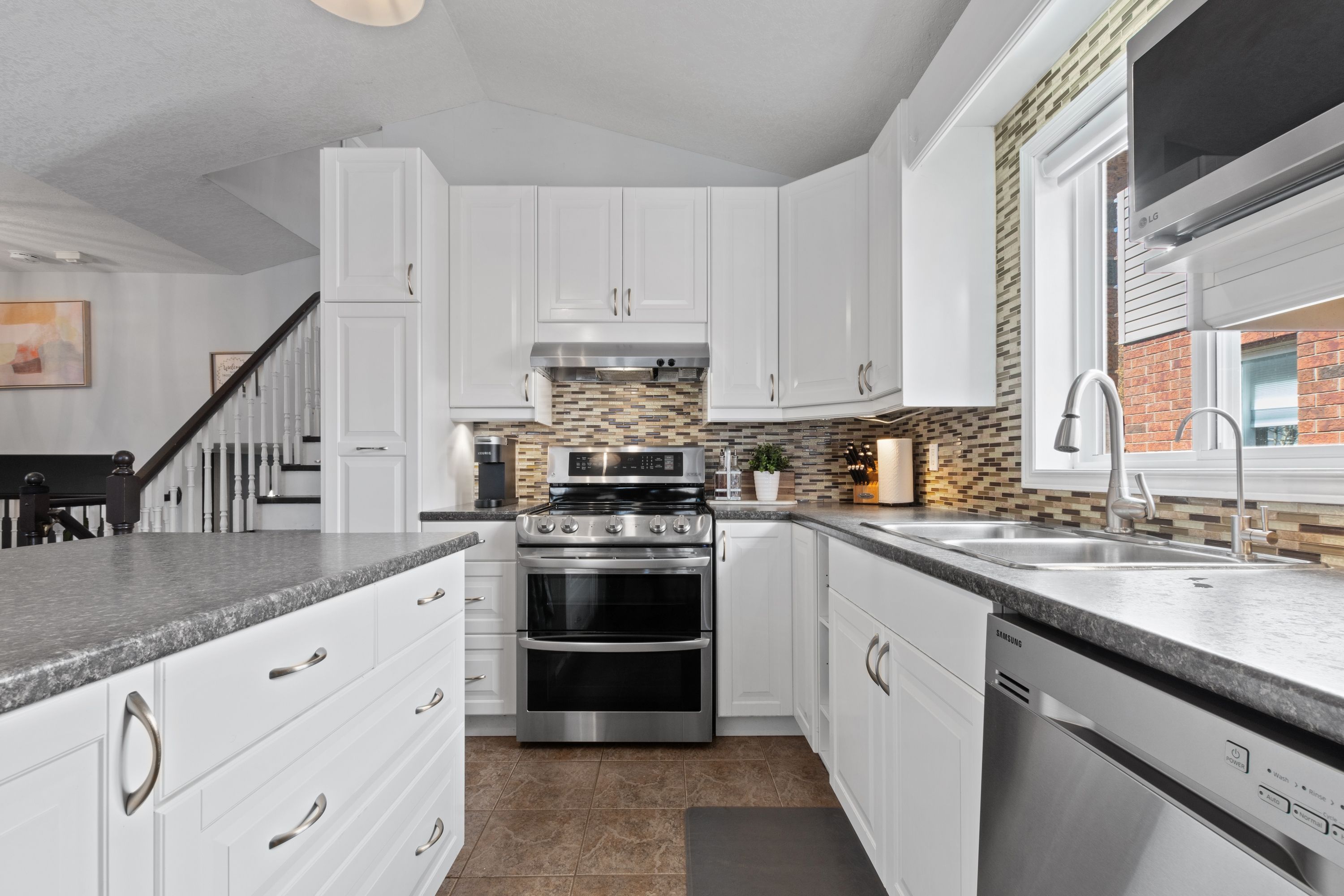 • Bright living room and airy kitchen with stainless steel appliances.