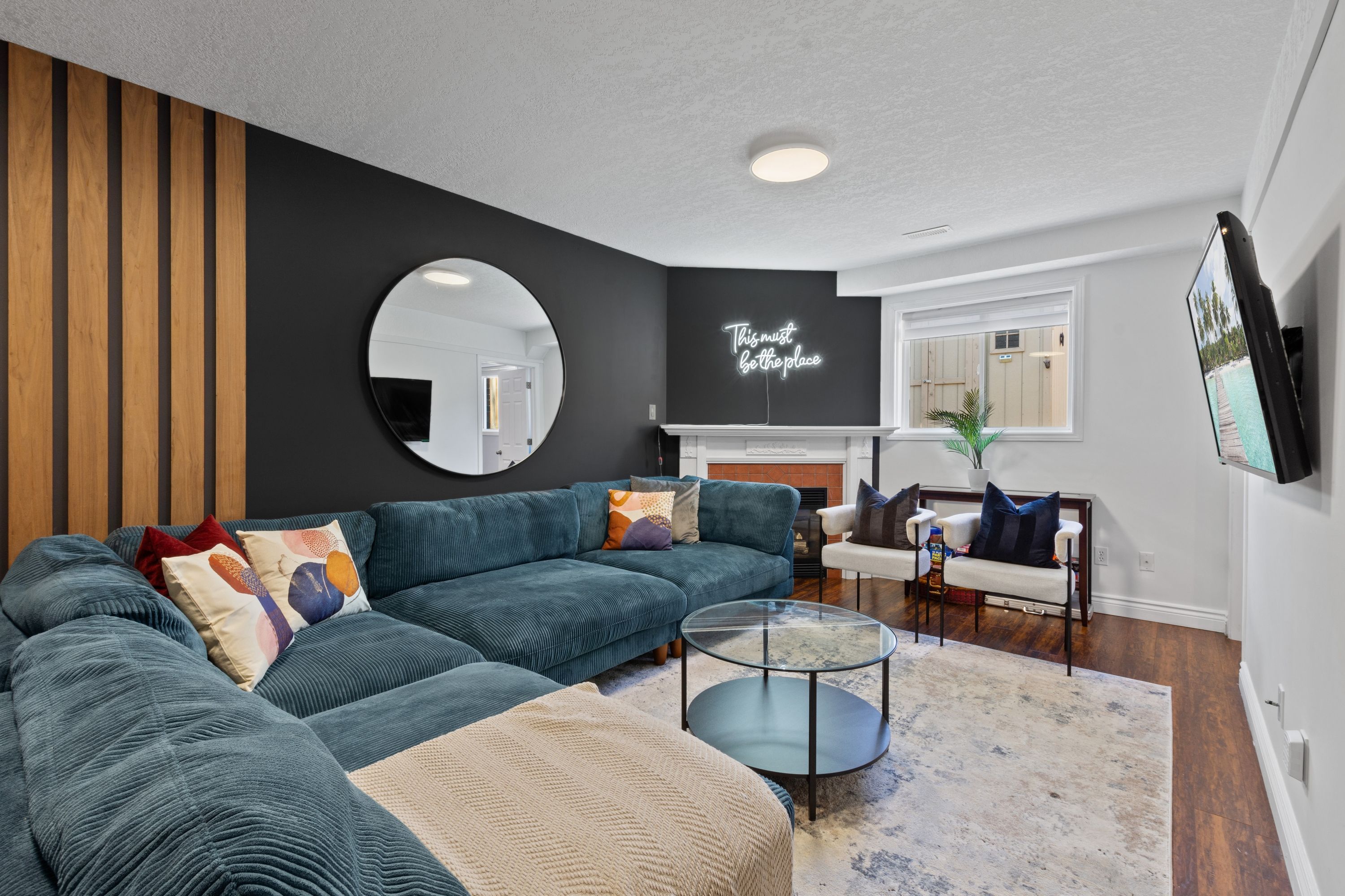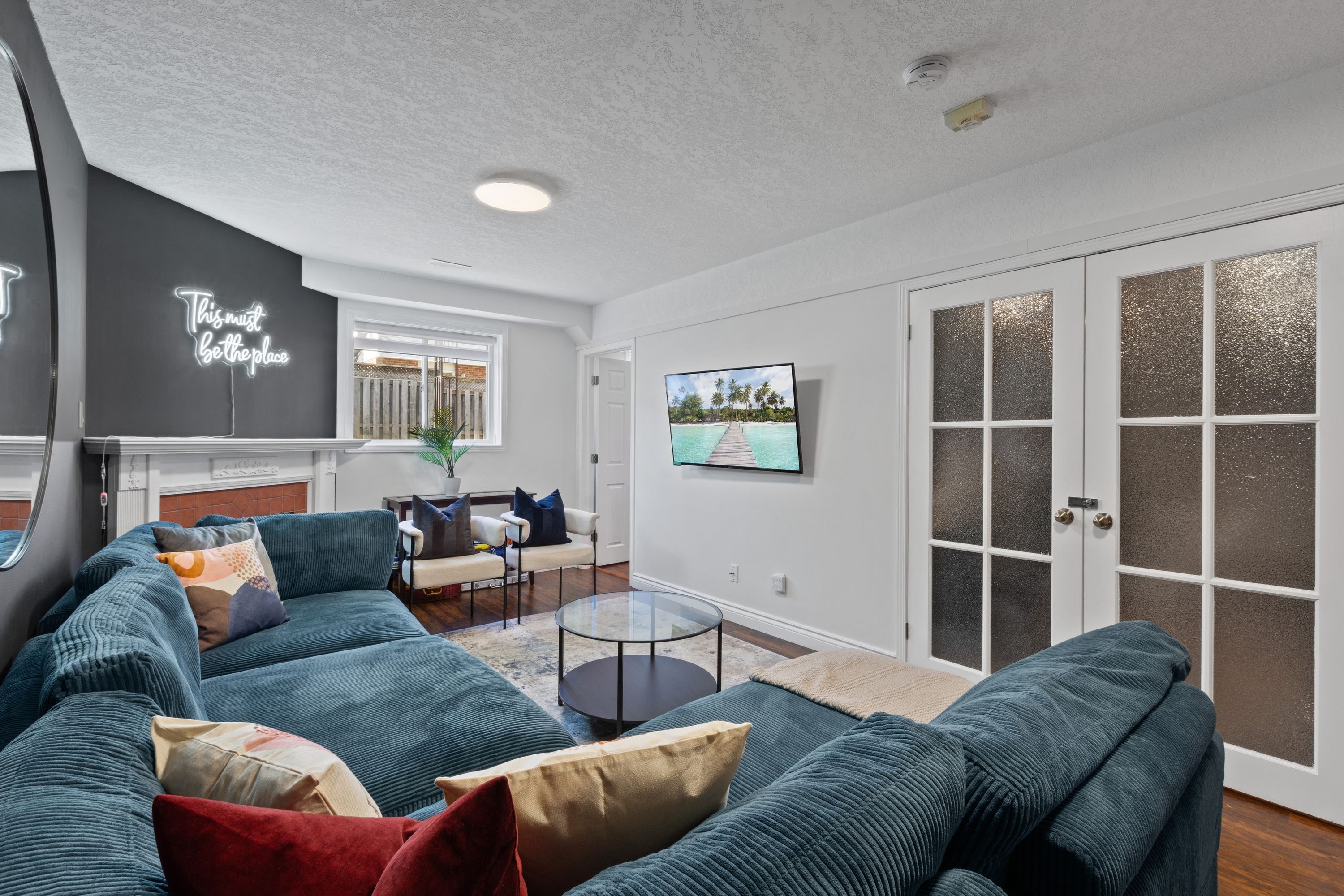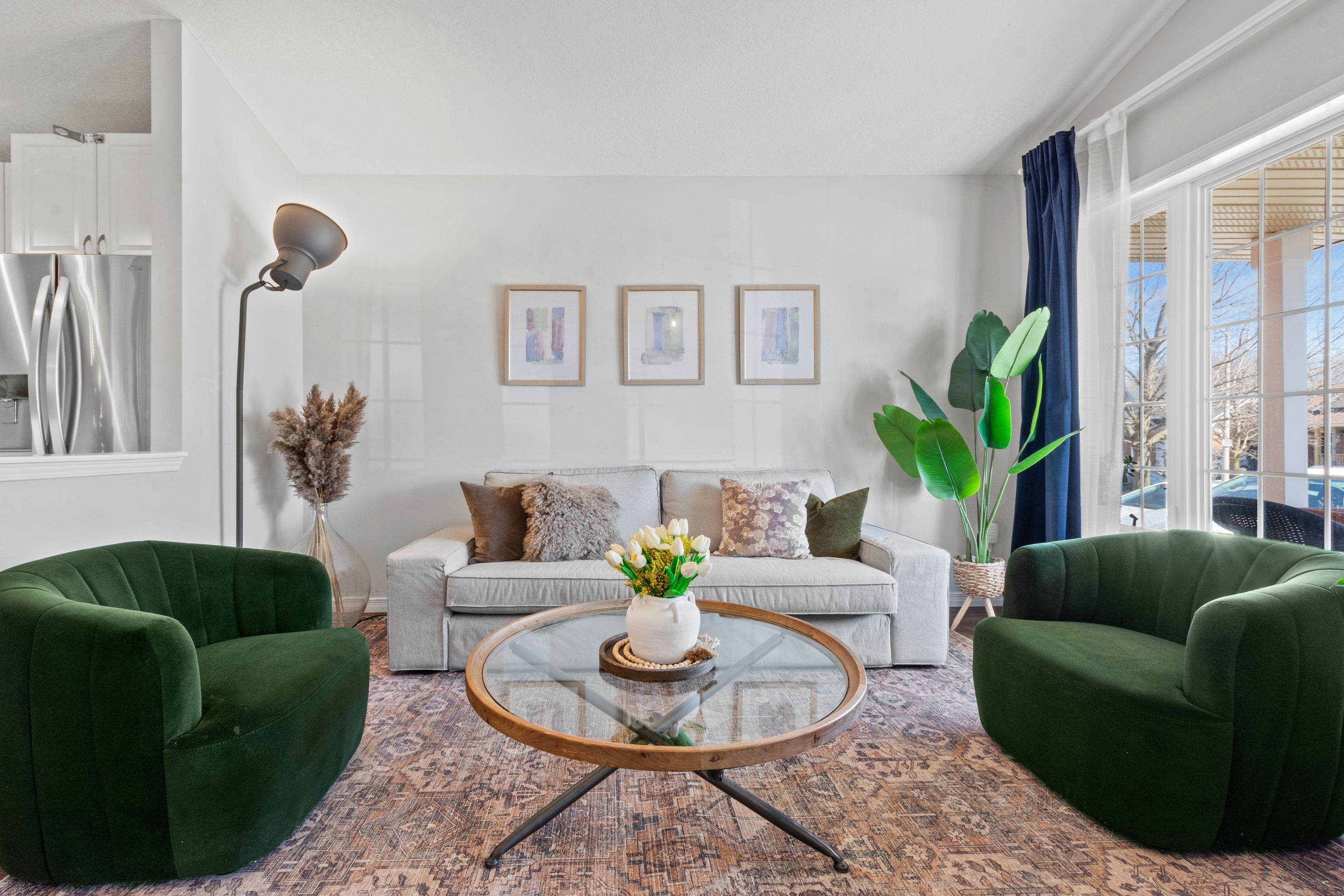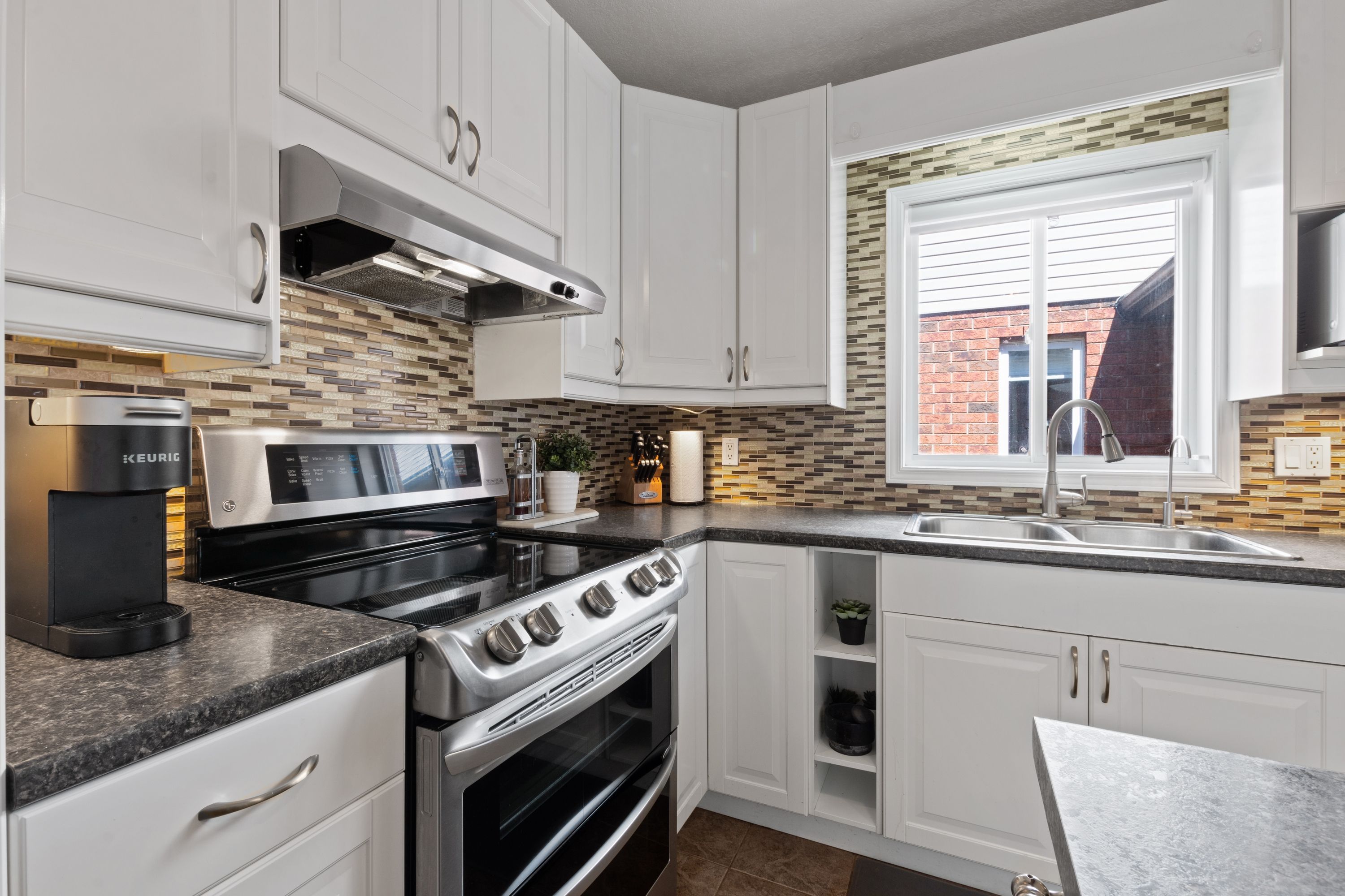 • Bright living room and airy kitchen with stainless steel appliances.