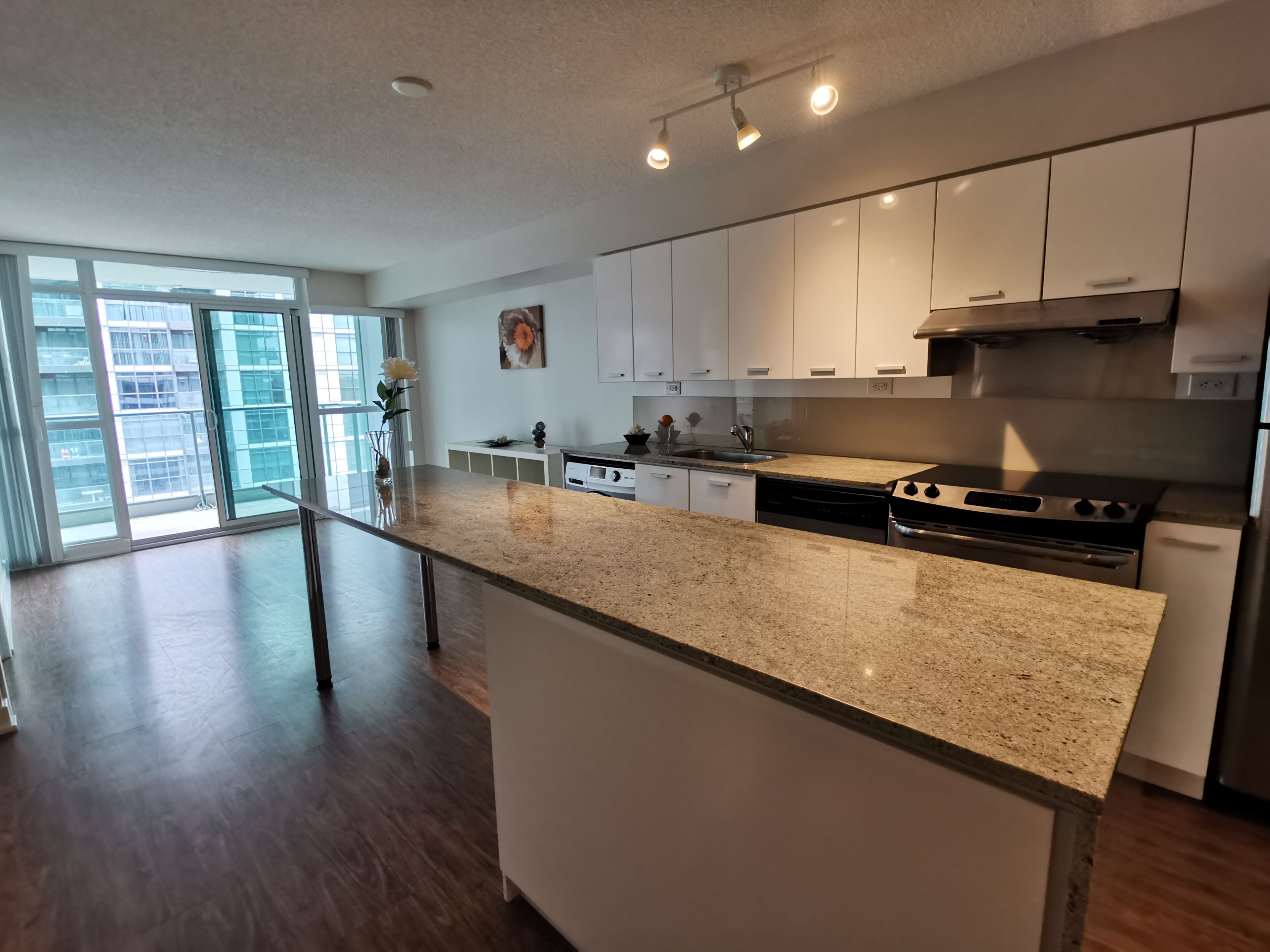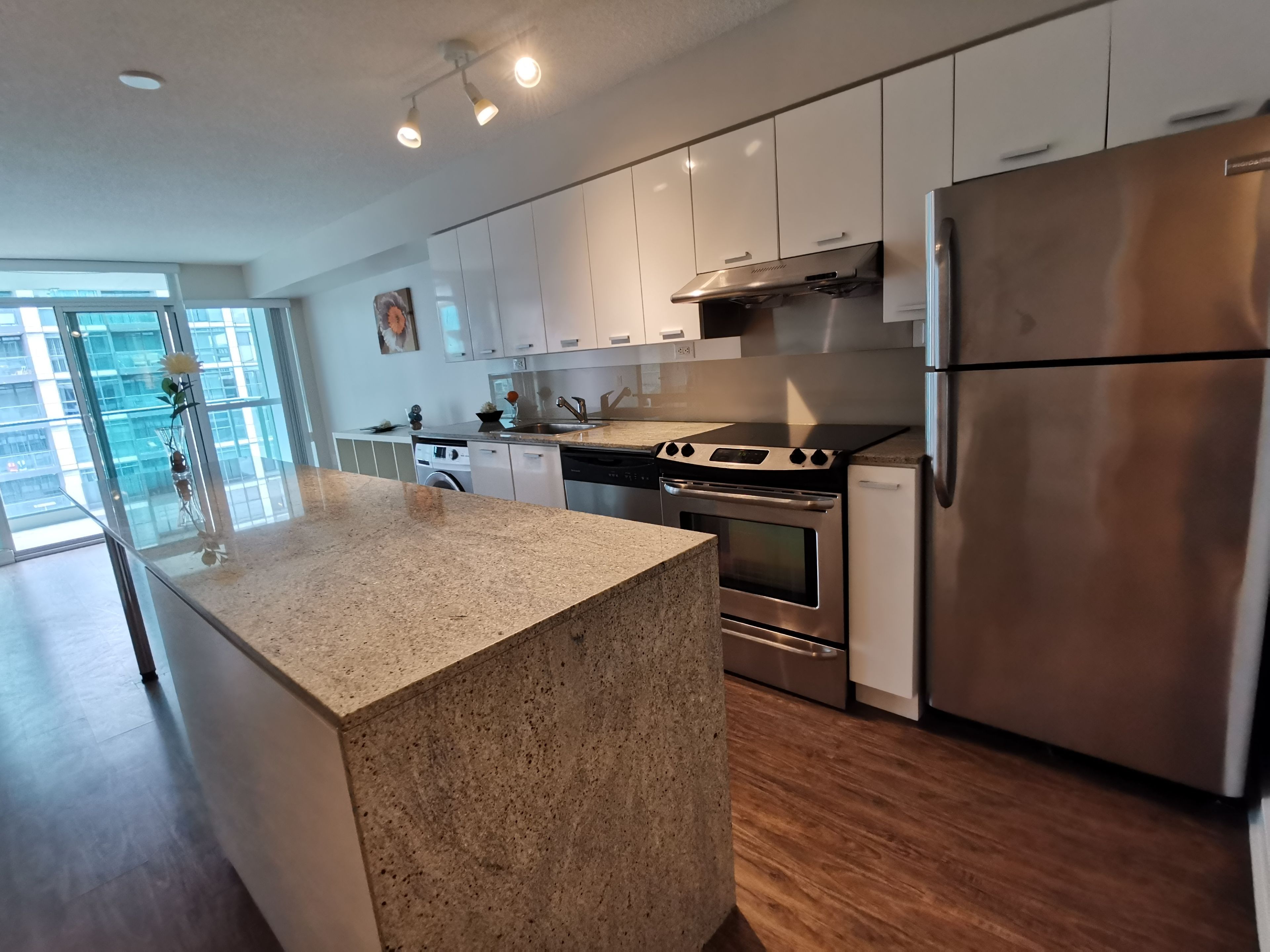 • Modern kitchen with a large granite island for cooking.