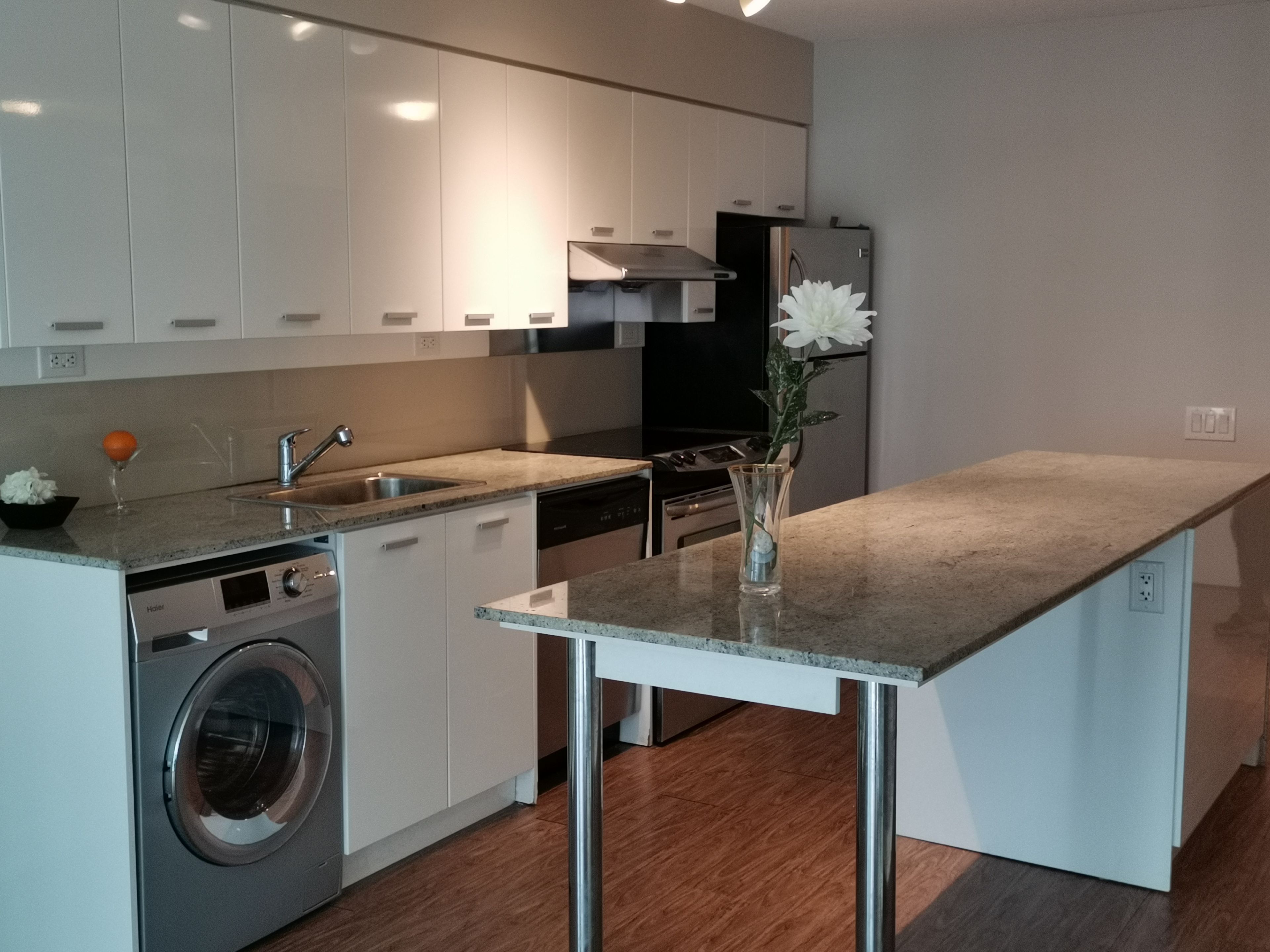 • Modern kitchen with large granite center island for cooking.