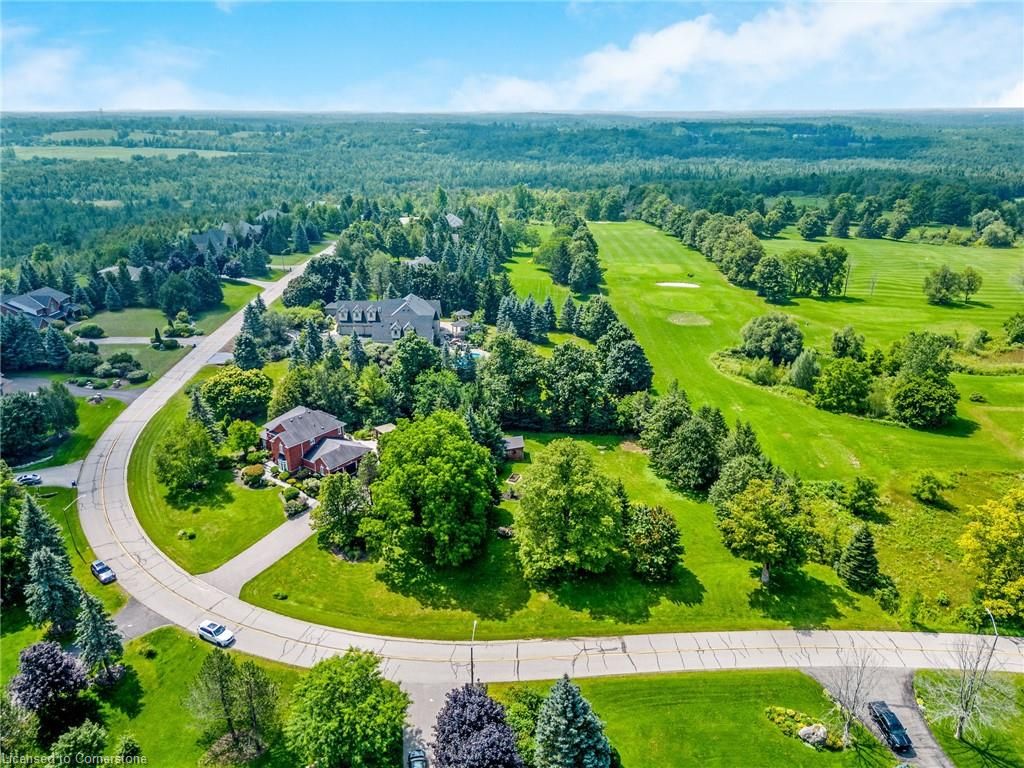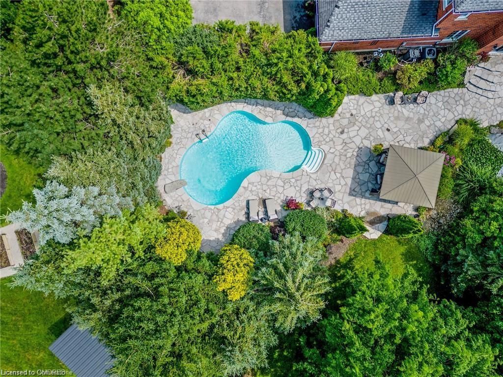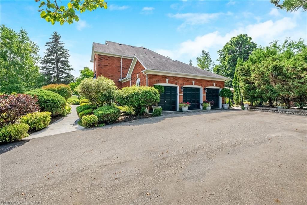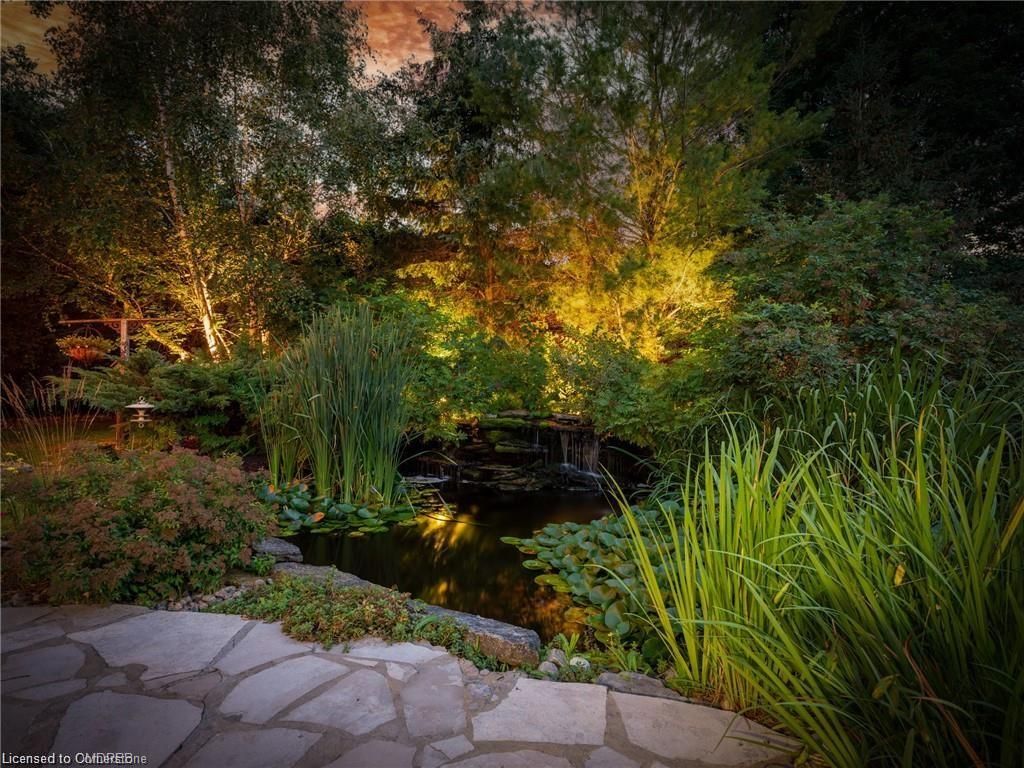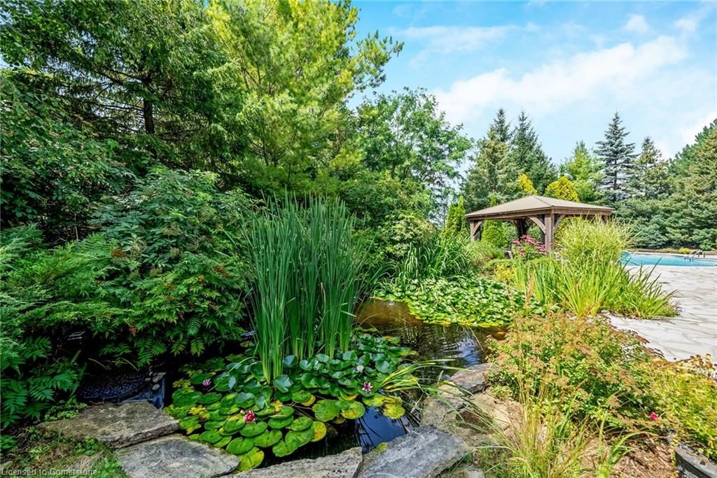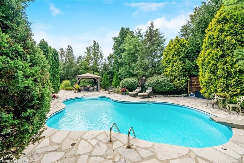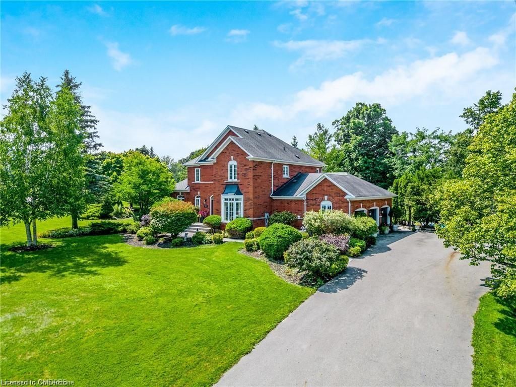 Welcome to this ultra-private secret garden - a rare executive country estate property backing onto blue springs golf club (home of pga canada) w/ the most stunning yard that will rival any luxury resort. This prestigious all-brick home features open concept living + fully finished basement. It is nestled on a stunning 1. 38-acre lot (including a beautiful side lot for added privacy) in a quiet enclave of distinguished executive homes. There is a sense of space as you enter the grand foyer w/ its 9' ceilings and curved staircase. The heart of this home is the gourmet ei kitchen which overlooks the wo to the stunning yard and living room w/ vaulted ceiling, fireplace and additional wo to the yard. There is a main level office located off the front entrance and convenient main level laundry w/ tub. The upper floor has 3 generous bedrooms (there were 4 - can easily convert back), one being the primary bedroom w/ his/her closets and 5-pc ensuite. The basement features an over-sized 4th bedroom, ri for bathroom, a 2nd office, gym, family room and workshop. The dream yard will take your breath away and includes a pavilion for dining al fresco, heated pool, koi pond w/ waterfall, golf-themed bar, screened-in pergola, extensive hardscaping (2000+ sf of flagstone installed on 3 of concrete for stability) and professional low-maintenance landscaping - the ultimate space for entertaining. Additional features: 3-car garage, parking for 10+ in the driveway, garage entry to home, replaced exterior doors, no rentals, energy efficient gas pool heater (2018), new pool liner and cover (2025), furnace (2017), well pump (2024); water softener, uv system, hwt all owned; all windows replaced and home re-insulated, extensive ug sprinklers (including side lot), 12 x 16 double-sided pine mennonite-built shed. Peaceful location close to golf, trails, lake, 15 minutes to 401. This is your opportunity to finally make a luxury move to the country. Thank you for showing our listing!