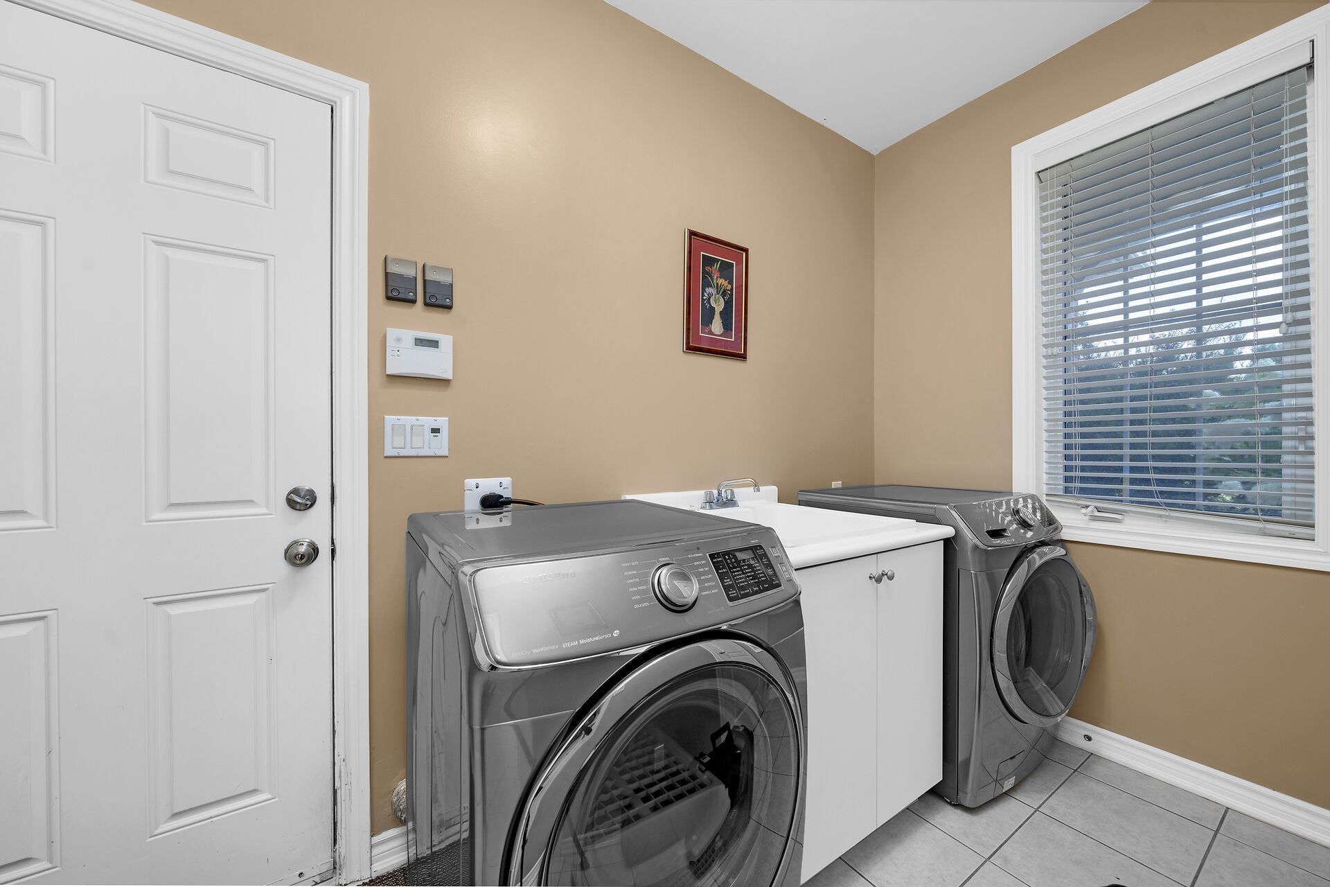 • Functional kitchen with quartz counters and stainless-steel appliances.