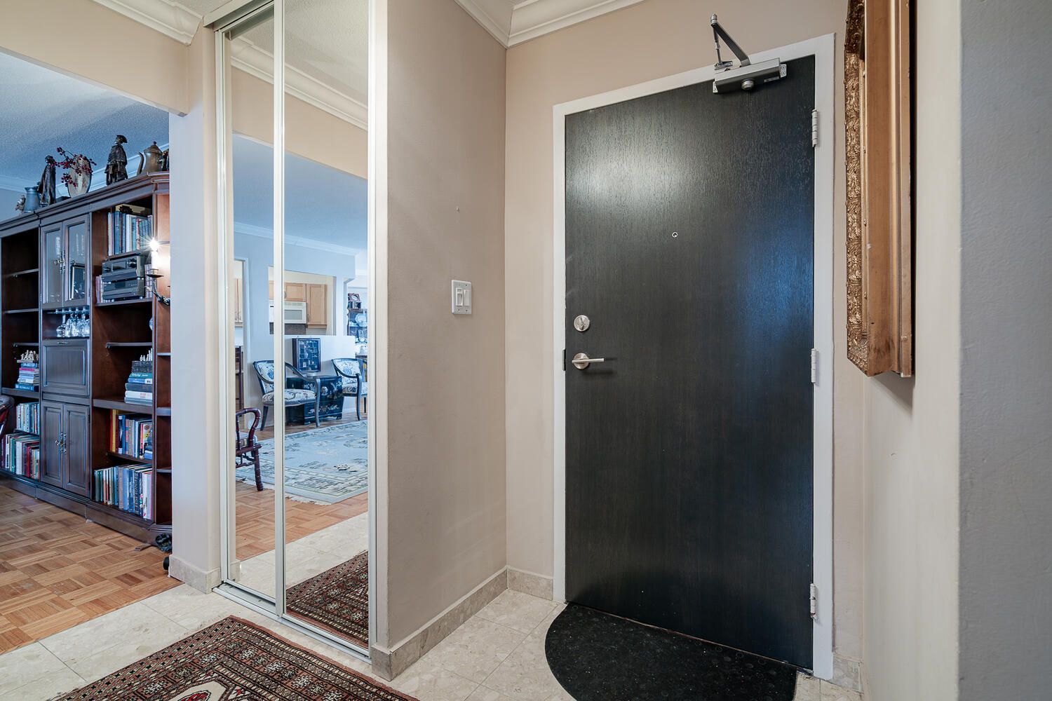 • Building amenities include a convenience store, indoor pool, sauna, and gym.