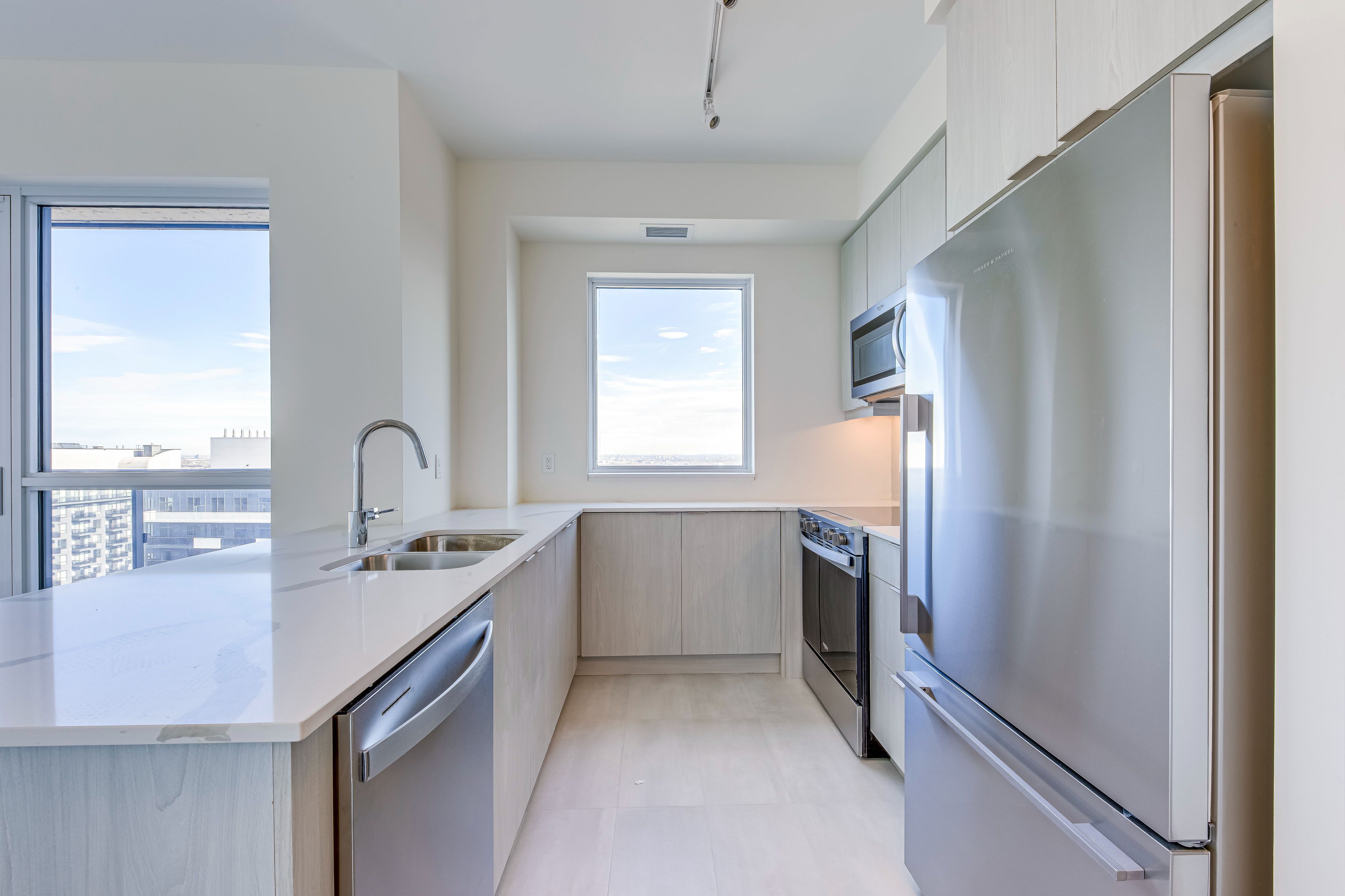Welcome to gemma condos brand new, never lived in! Experience modern urban living in this high floor spacious 2-bedroom plus large den corner suite, perfectly situated in the heart of mississauga. Facing east and north , the unit offers panoramic views of the cn tower, lake ontario, and the city skyline all filled with abundant natural sunlight throughout the day. Enjoy a bright open-concept layout with floor-to-ceiling windows and a modern kitchen featuring quartz countertops, stainless steel appliances, and sleek cabinetry. The den is large enough to serve as a formal dining area, or home office. The primary bedroom includes a walk-in closet and a private ensuite bathroom. Additional features include in-suite laundry, a private balcony, and one underground parking space plus a locker. Ideally located minutes from square one and many major shopping centers, heartland town centre, hospitals, schools, parks, and just steps to public transit, the future lrt, with easy access to highways 401, 403, and 407. Don't miss this rare opportunity to live in a sun-filled corner suite in one of mississauga's most sought-after new communities! Long-term rentals are preferred, however, short-term rentals between 5 and 9 months are also welcome.