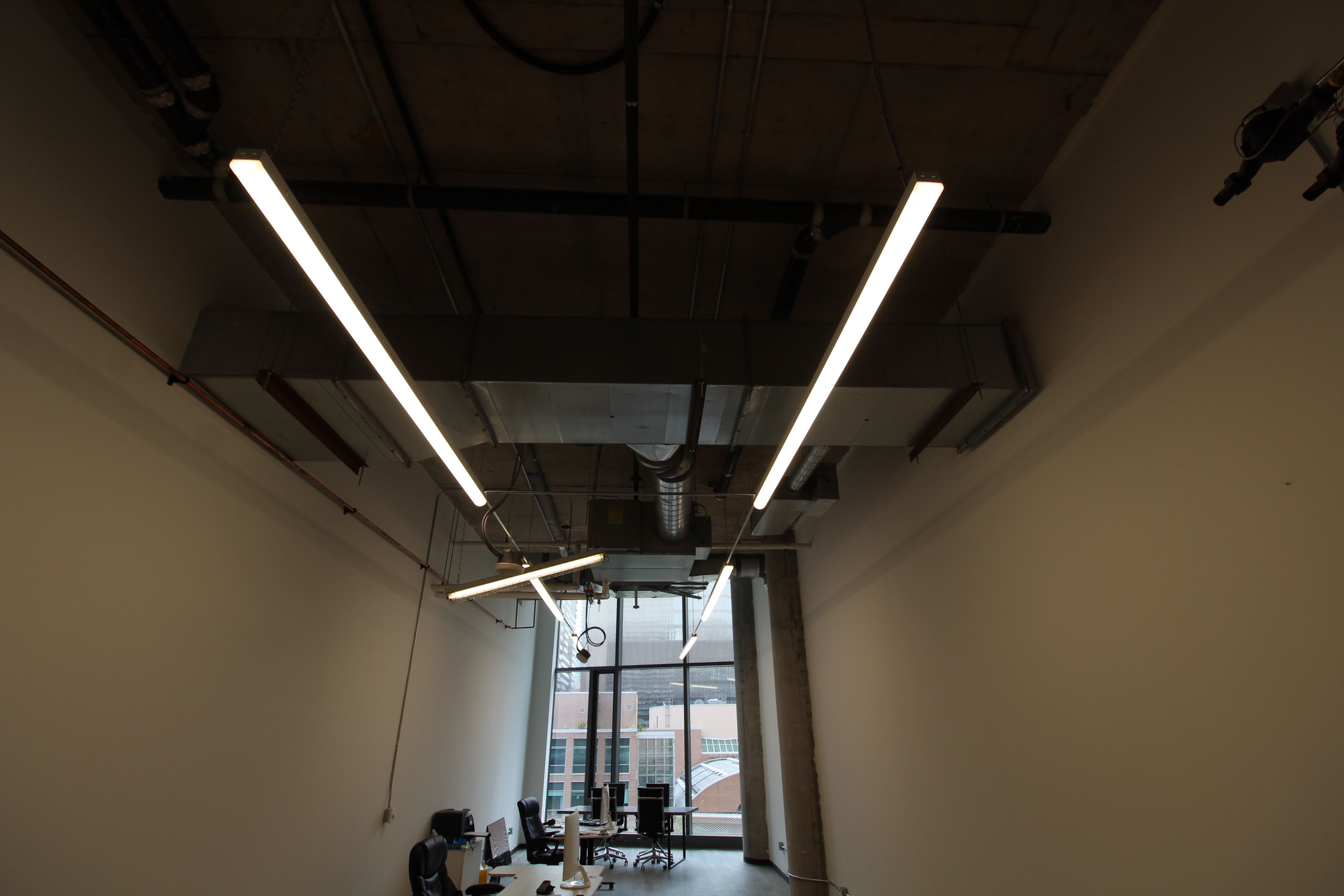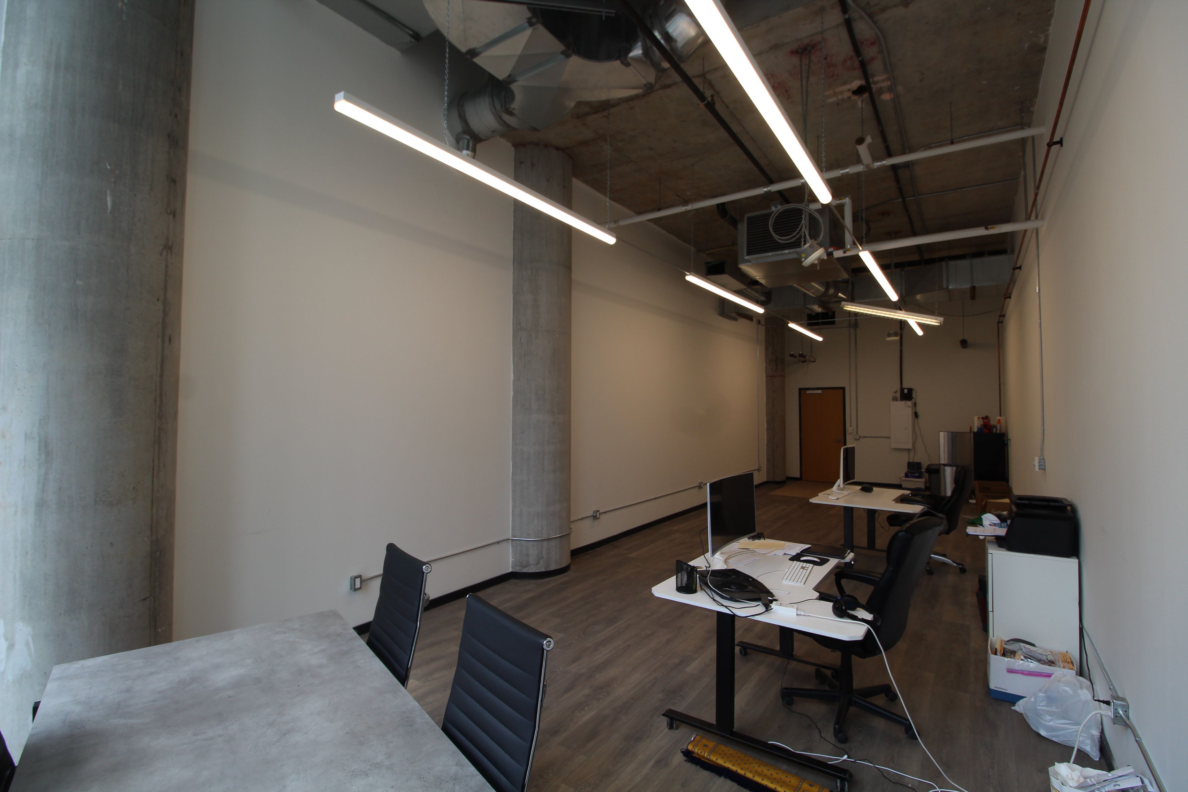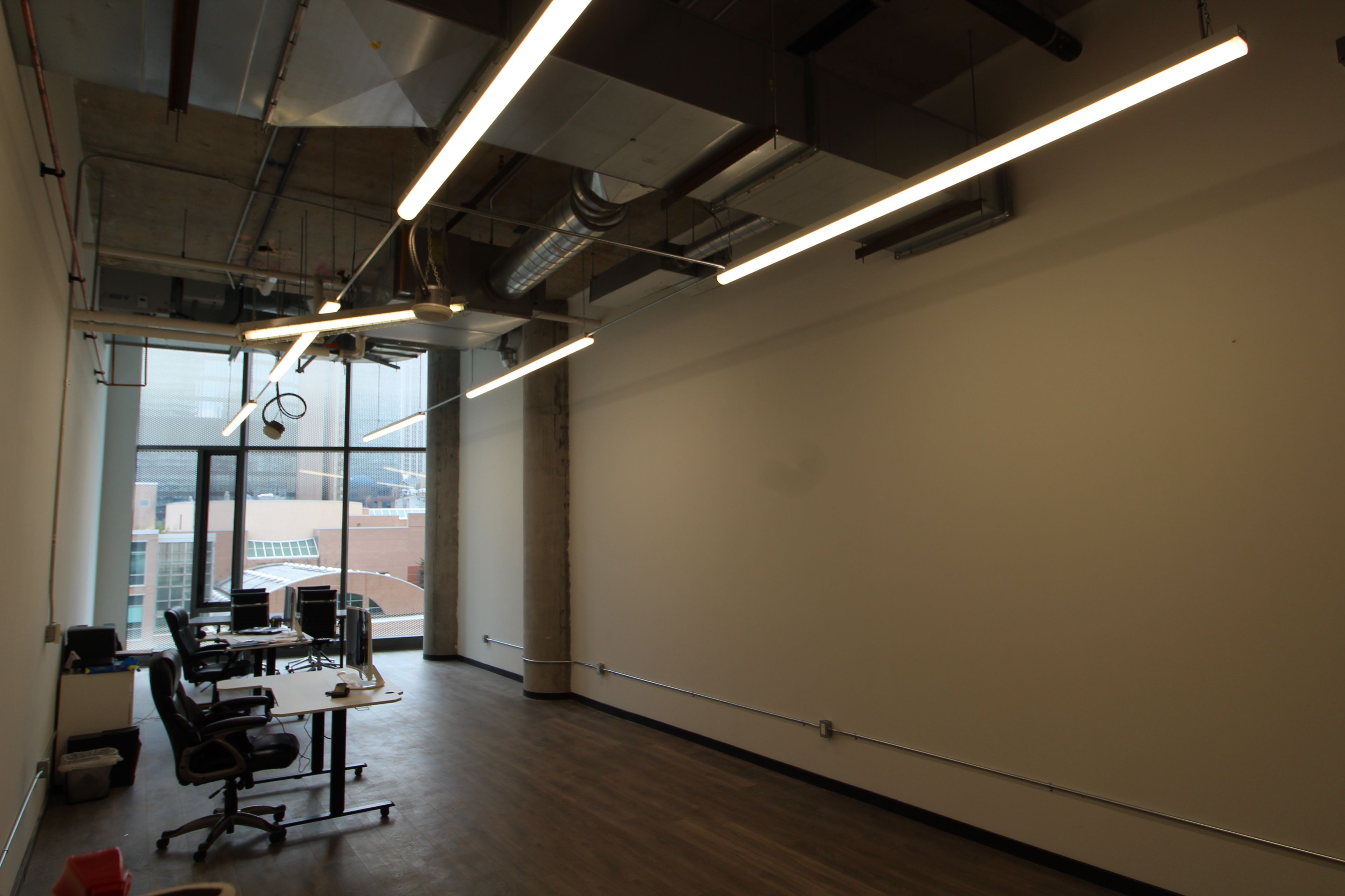 • Bright, open-concept office with natural light from floor-to-ceiling windows.
