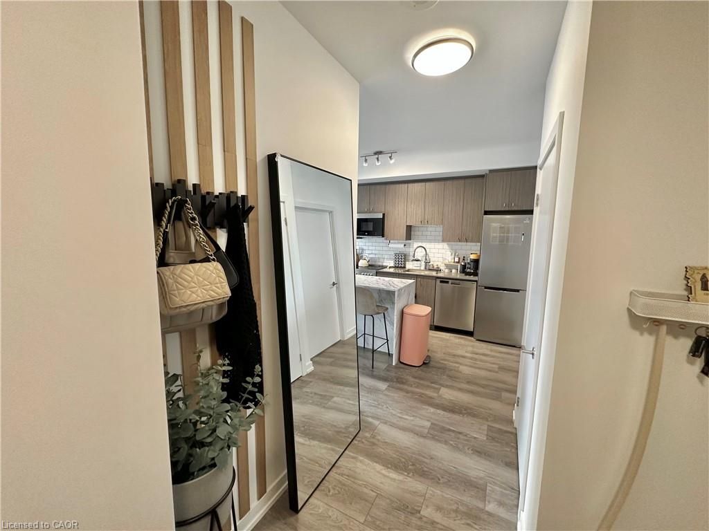 With just 5% down, your mortgage payments could be lower than what you're paying in rent! This 1 bedroom condo at station park offers one of the most desirable layouts in the building. You'll be pleasantly surprised upon entry by the spacious hallway, providing excellent separation before opening into a beautiful open concept living space. The unit is stylishly furnished and can be sold with all furniture included. It features a generous bedroom, an oversized bathroom, in suite laundry, and an elegant kitchen with an island that overlooks a cozy and inviting living room. Step out onto the terrace to enjoy stunning sunrise and sunset views. Residents enjoy exceptional amenities, including 24/7 concierge service, a swim spa, peloton studio, fully equipped gym, bowling alley, party room with wet bar and private dining area, and an outdoor terrace with firepits and bbqs. A dedicated pet spa station adds extra convenience. Underground parking is available for an additional fee. Heat & internet included in condo fees! Ideally located just minutes from downtown kitchener, uptown waterloo, the lrt station, google, and more. This is modern living at its finest.