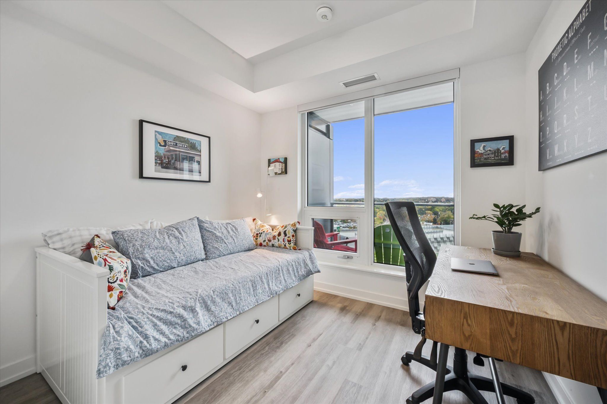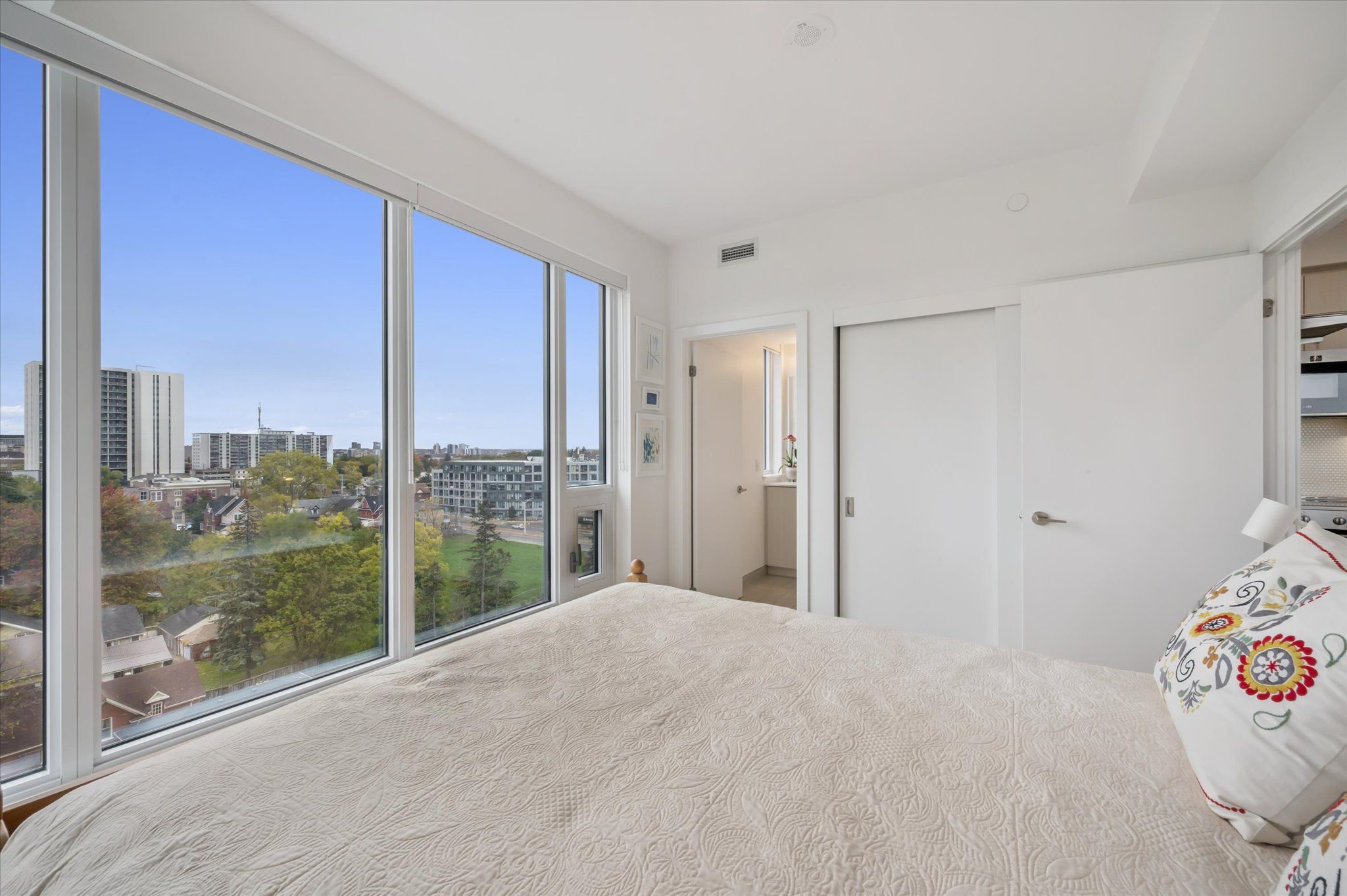 • Large primary bedroom features floor-to-ceiling windows and ensuite.