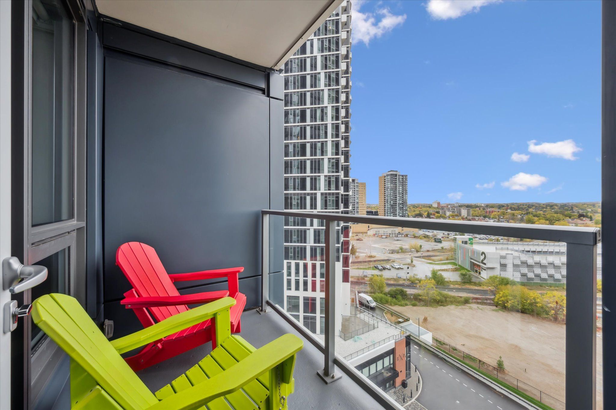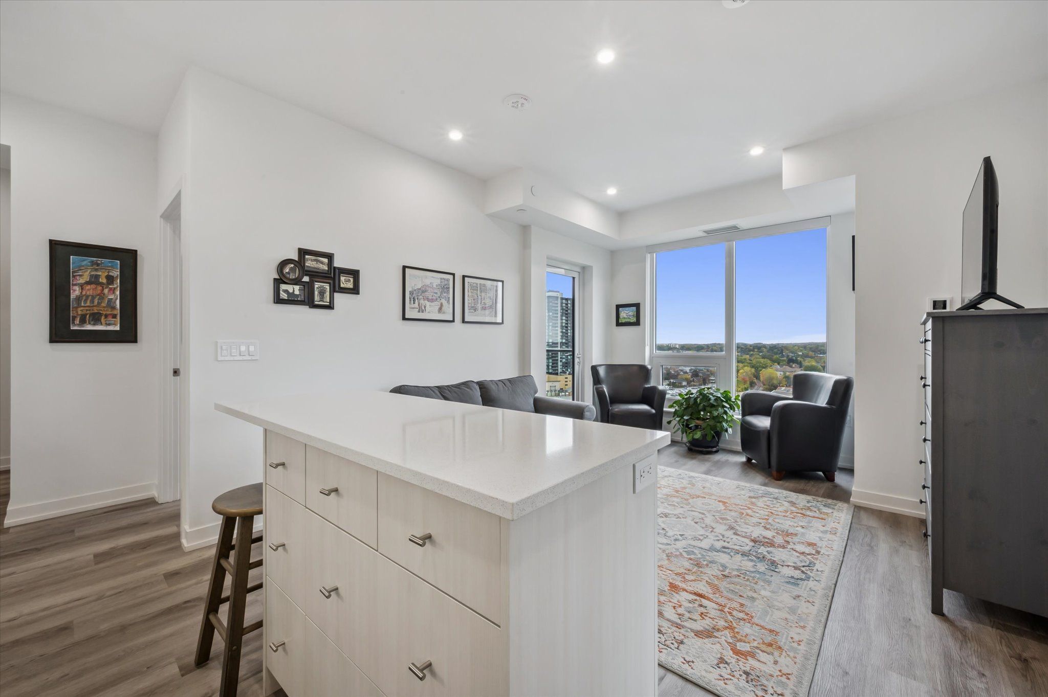 Views for days!! Corner unit! Welcome to station park - where modern living meets unmatched convenience in the heart of downtown kitchener. With thousands spent on upgrades, this corner 2-bedroom, 2-bath unit comes with underground parking and storage locker. Perched up on the 9th floor, enjoy spectacular sunrise and sunset views of the city overtop the trees. This spacious and well appointed unit offers an upscale bright kitchen, with upgraded island with seating, clean quartz countertops, penny shaped backsplash and ample counter and cupboard storage. The kitchen opens up to the living room that is filled with tons of natural light and unobstructed views. Make your way to the primary bedroom, fit with ceiling to floor windows all the way around and spectacular views of the neighbourhood and uptown waterloo. Enjoy your private ensuite with glass walk-in shower. The second bedroom is a great size - perfect for an office or for guests with another full bath. Your private balcony is the perfect place to unwind. The unit features in-suite laundry, 1 underground parking space and storage locker. Internet is included in the condo fees. Steps from google, the school of pharmacy and medicine, the medtech hub, communitech, kpmg, and countless restaurants, cafes, and shops. With the lrt and go train at your doorstep, the entire city and region are within easy reach. Station park is known for offering some of the most impressive amenities in the region. From a fitness studio, hydrapool and hot tub, to a bowling alley, arcade hall, party room, outdoor workout pods, sauna, peleton room, dog wash and future ice rink and amphitheatre - you'll never run out of ways to work, play, or unwind right at home. Don't miss the chance to experience a vibrant, connected lifestyle at station park - downtown living at its very best.