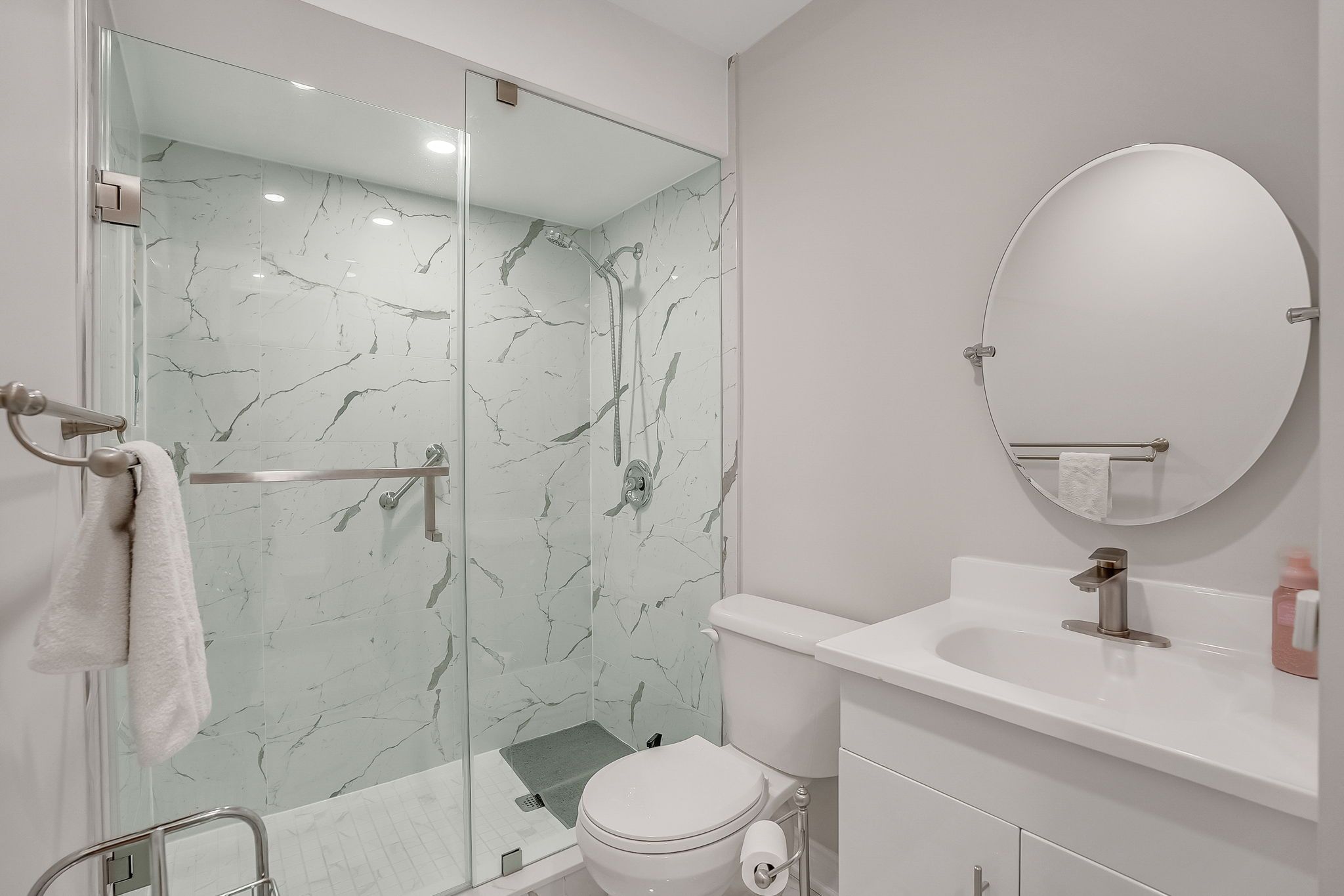 • Renovated second floor featuring a modern walk-in shower and new flooring.