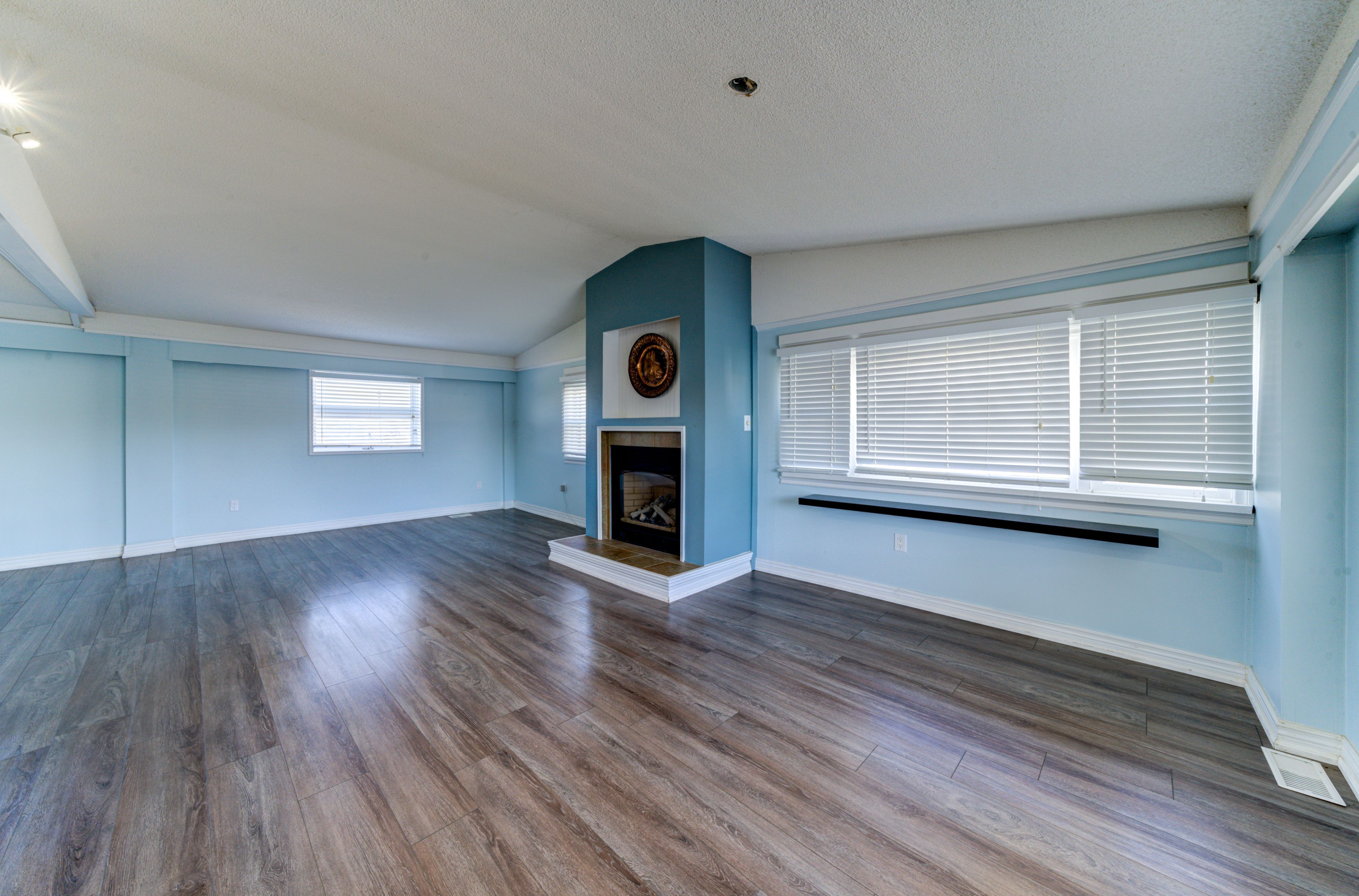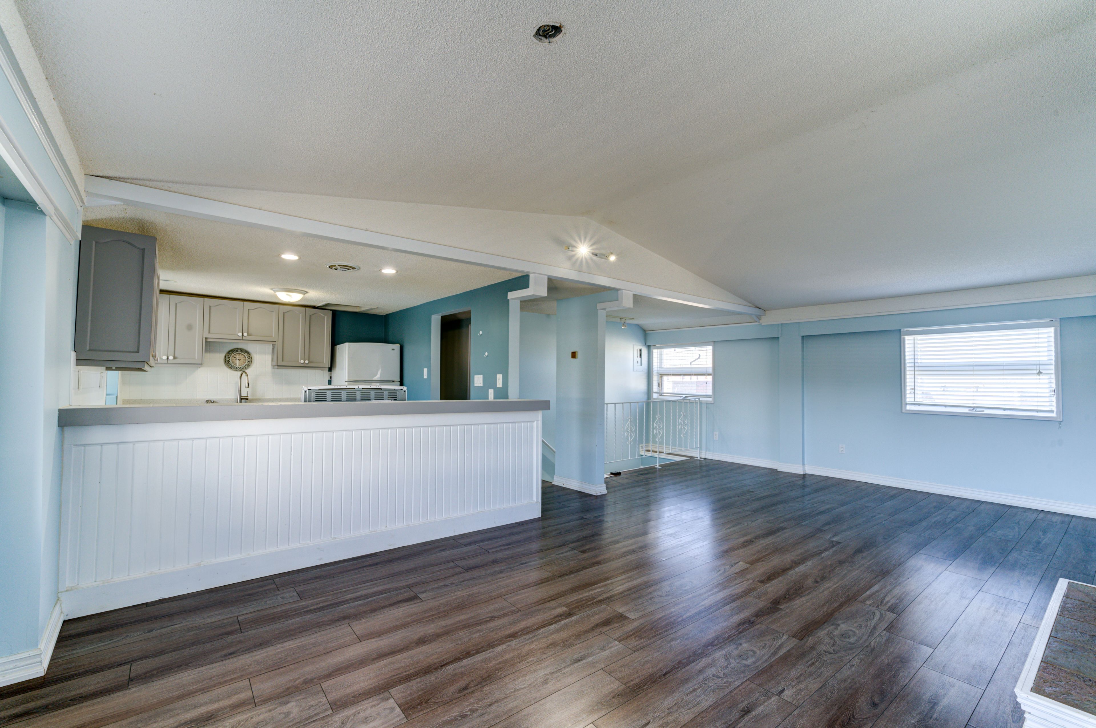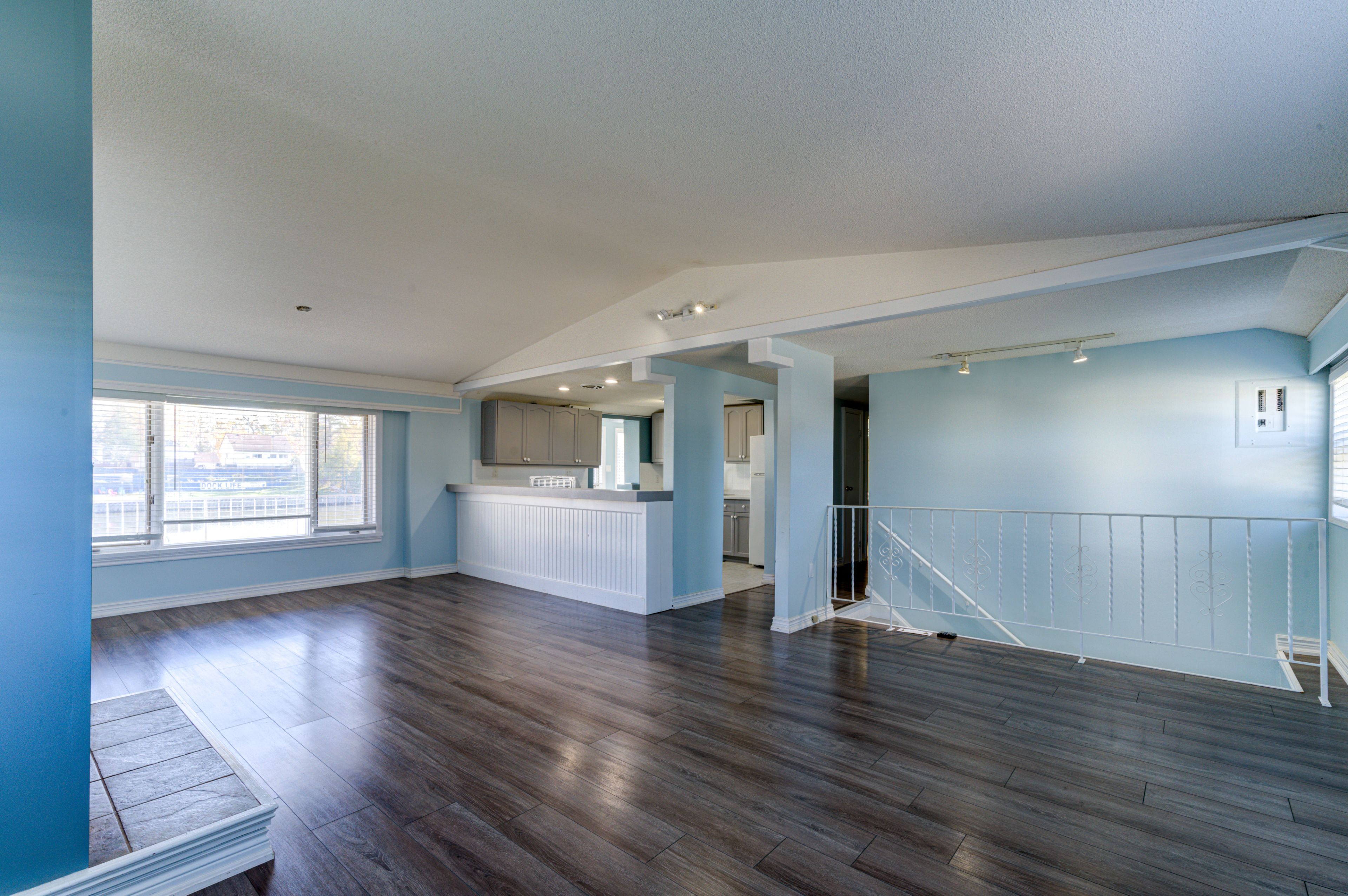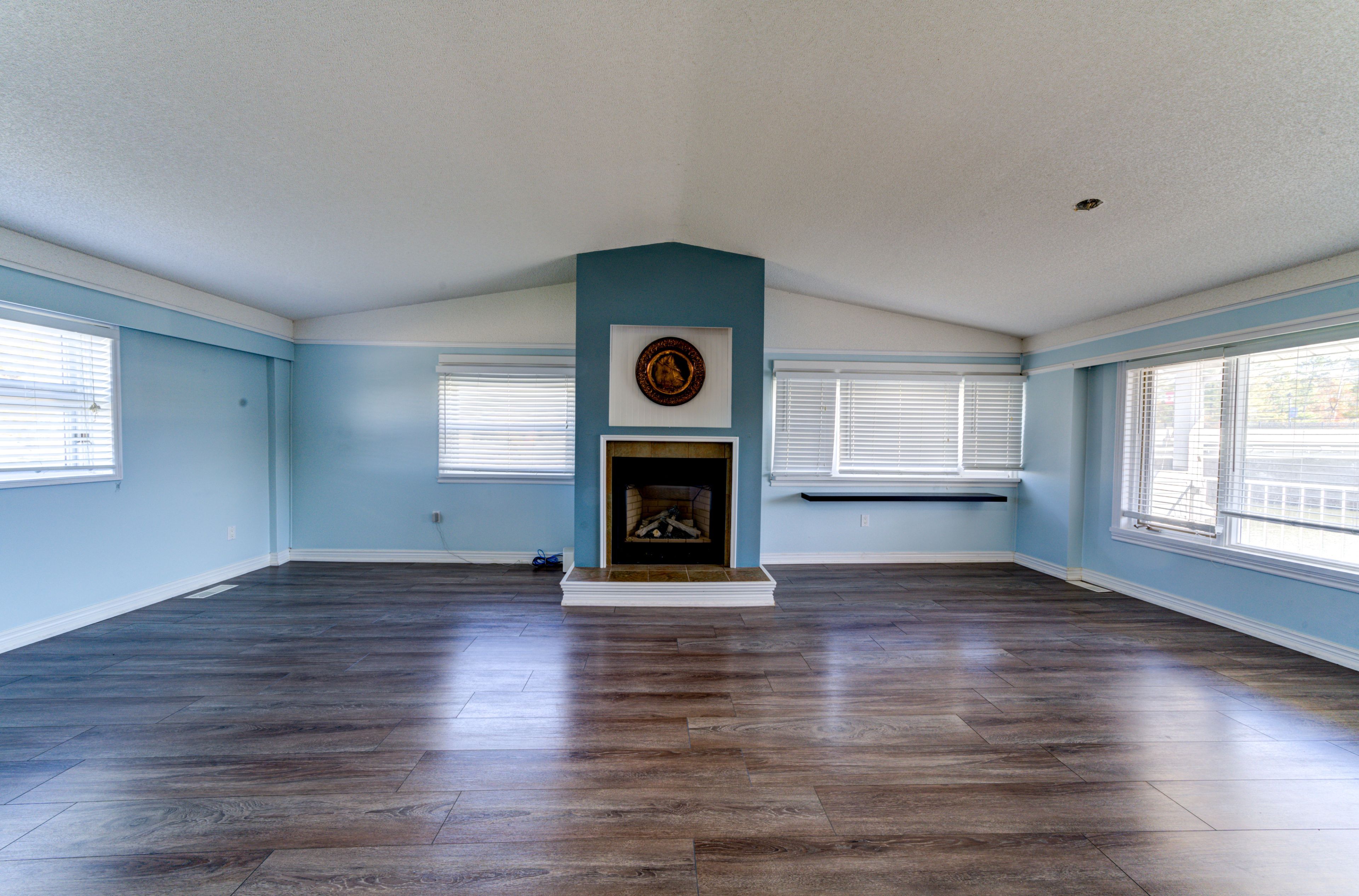 • Open concept living area with cathedral ceiling and gas fireplace.