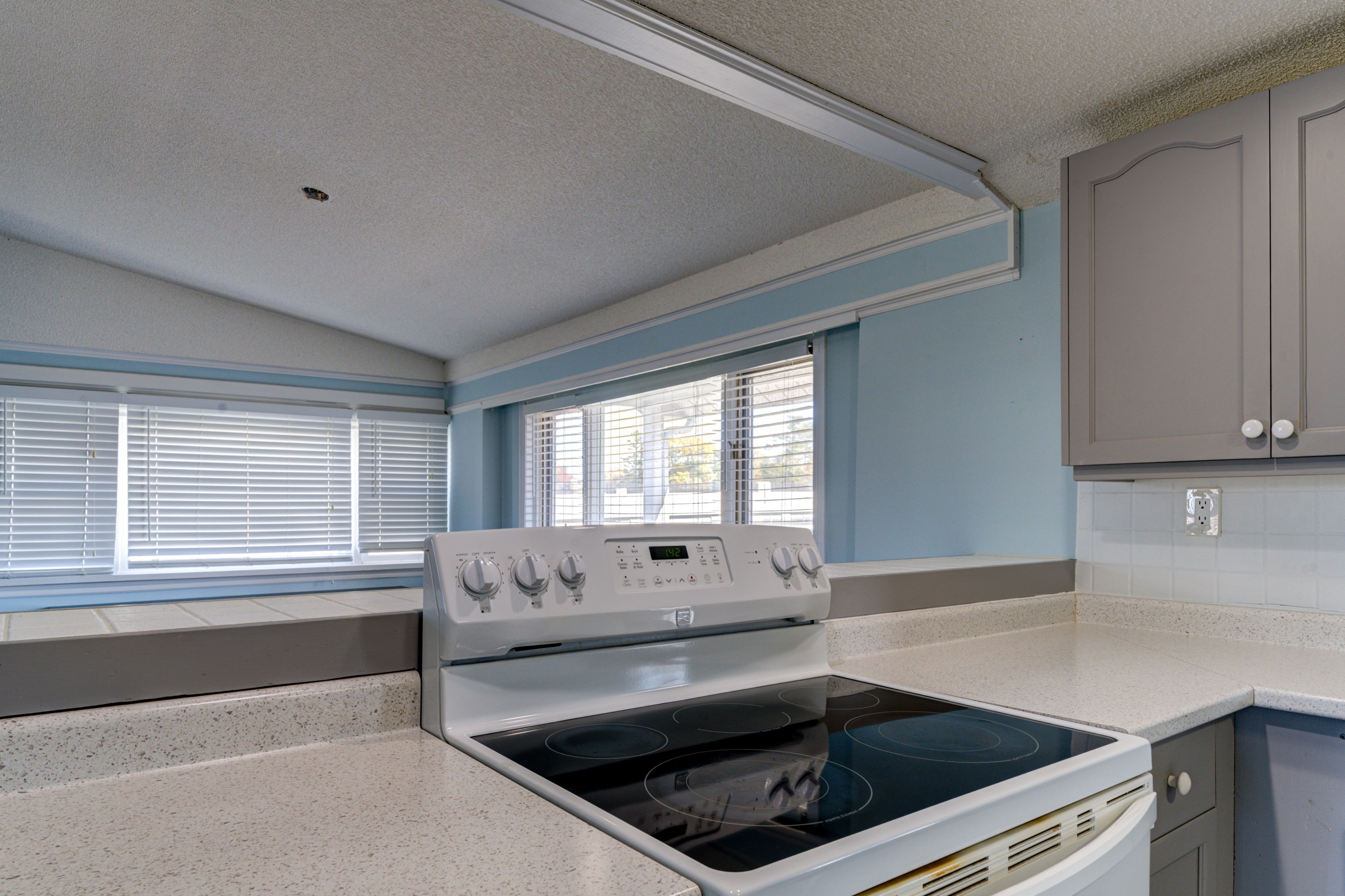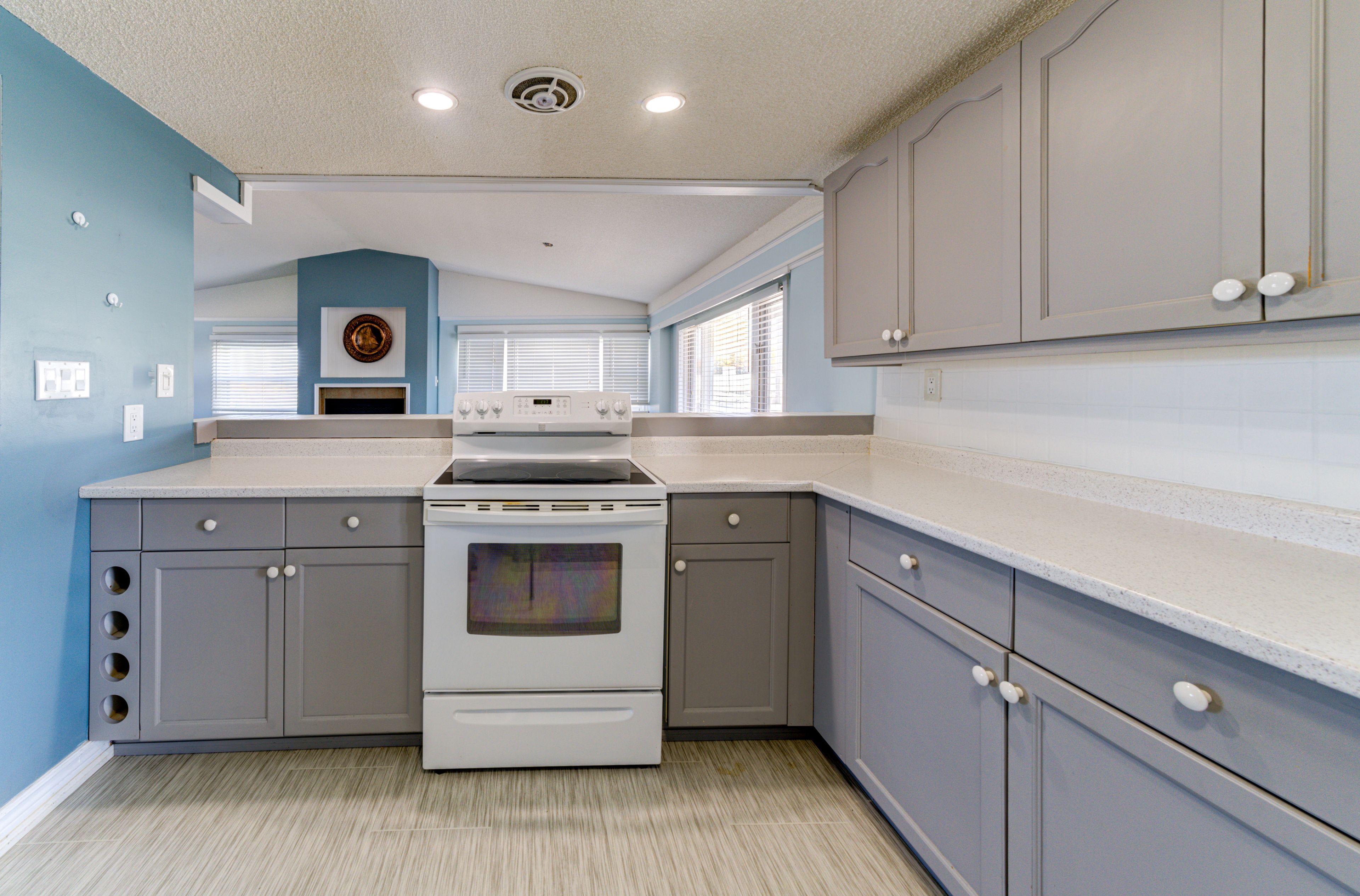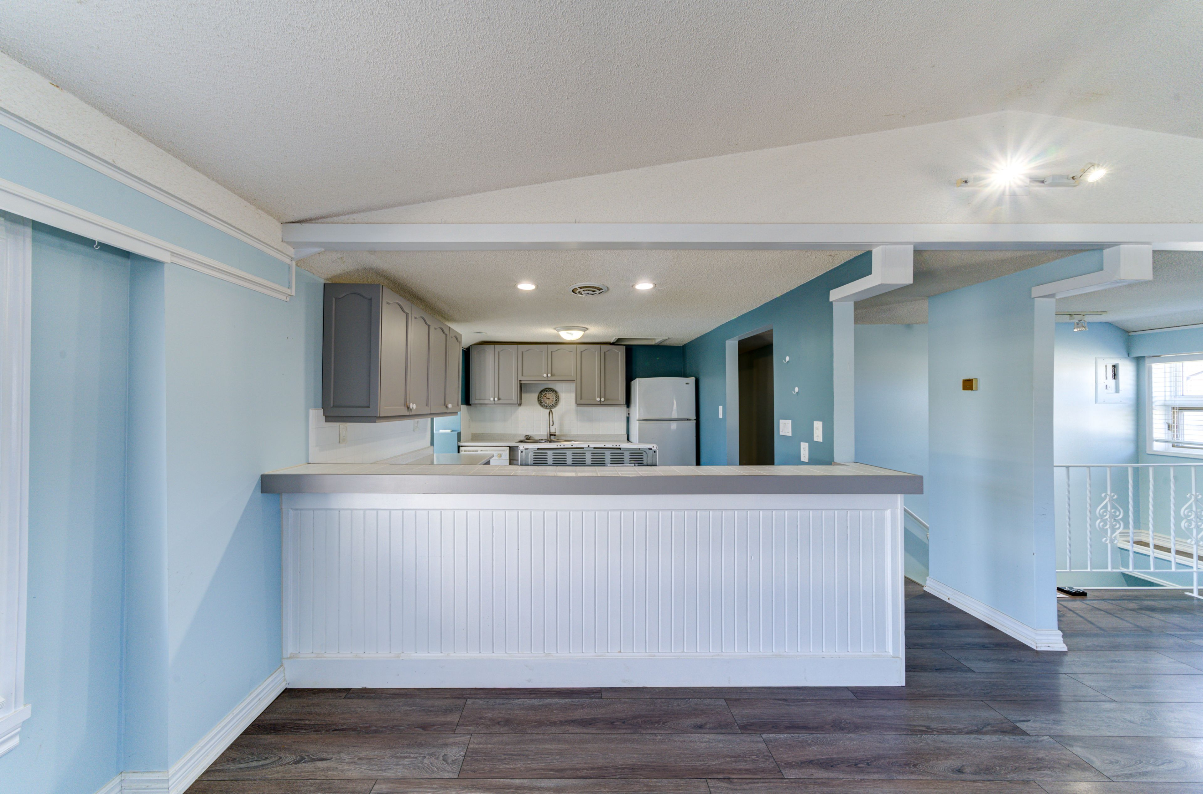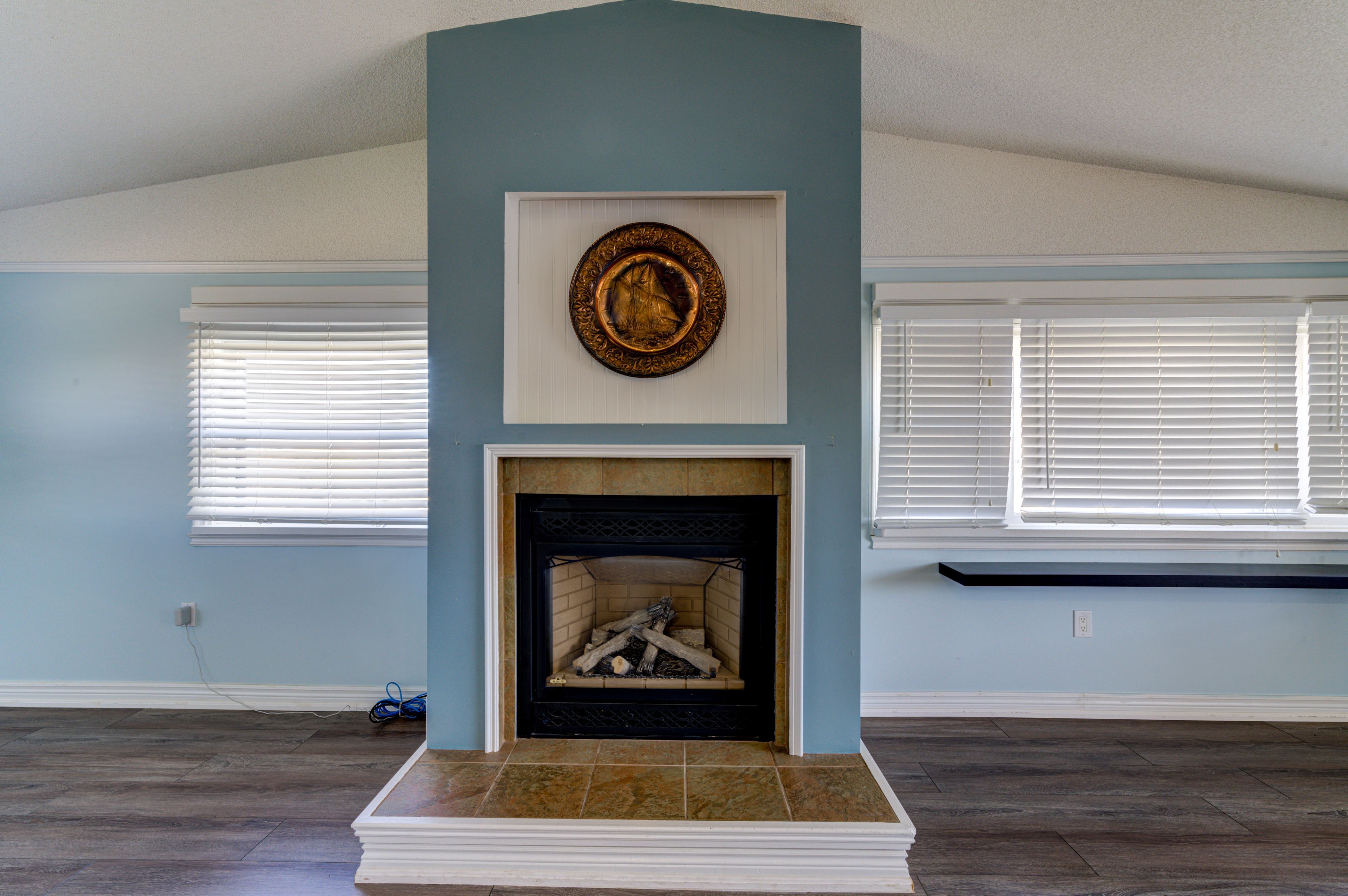 • Open concept living area with cathedral ceiling and gas fireplace.