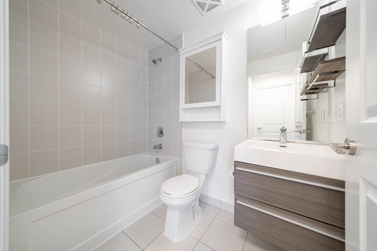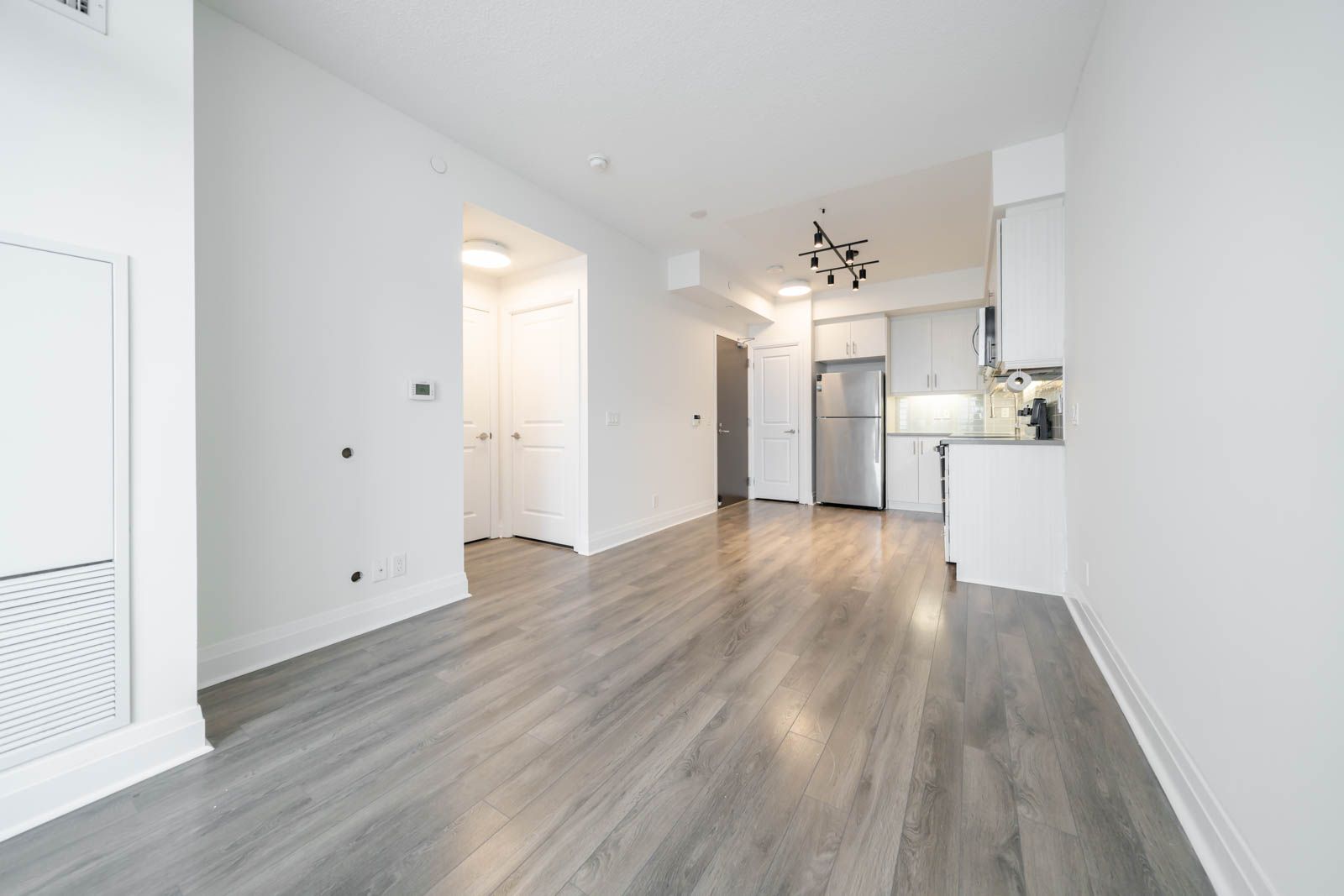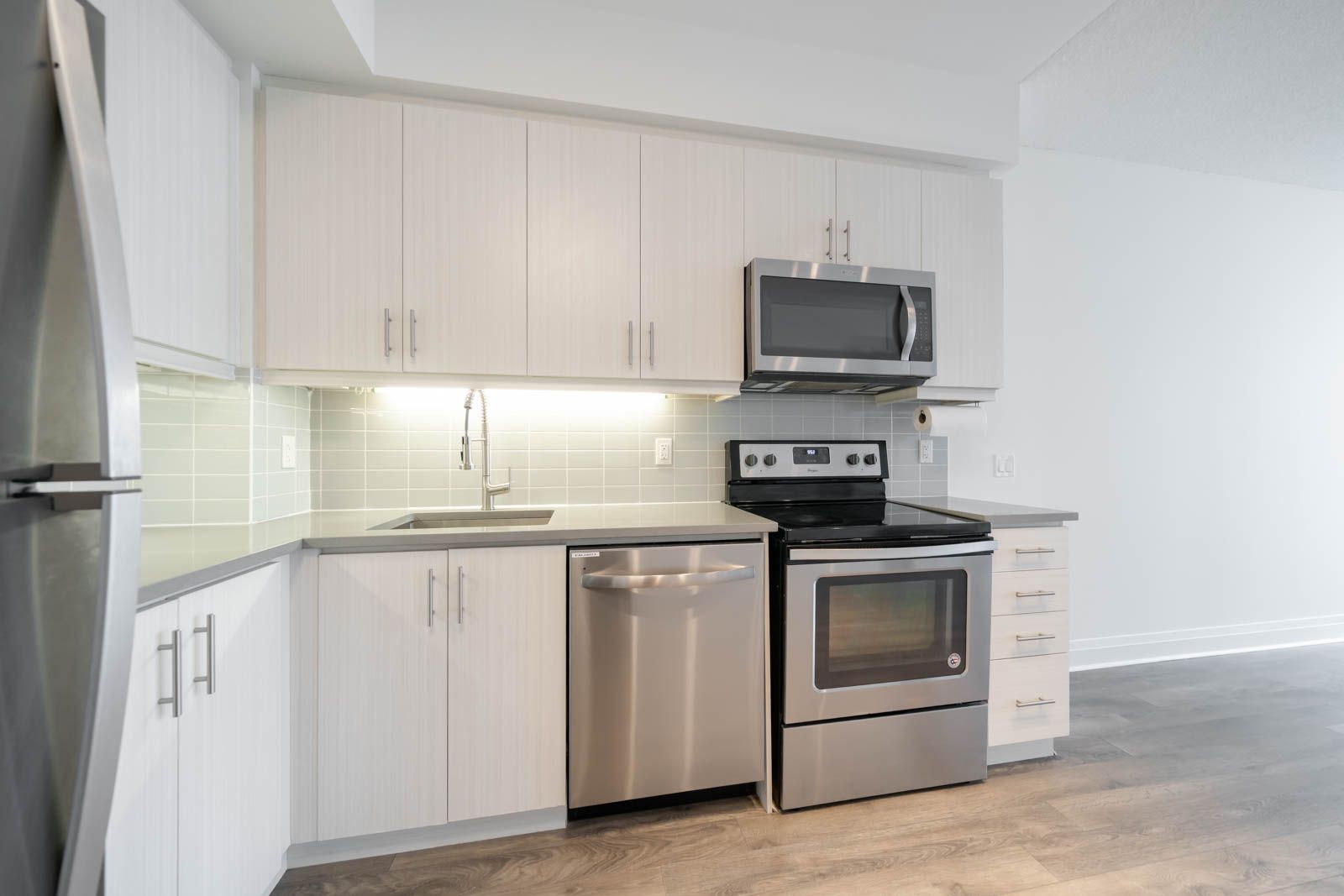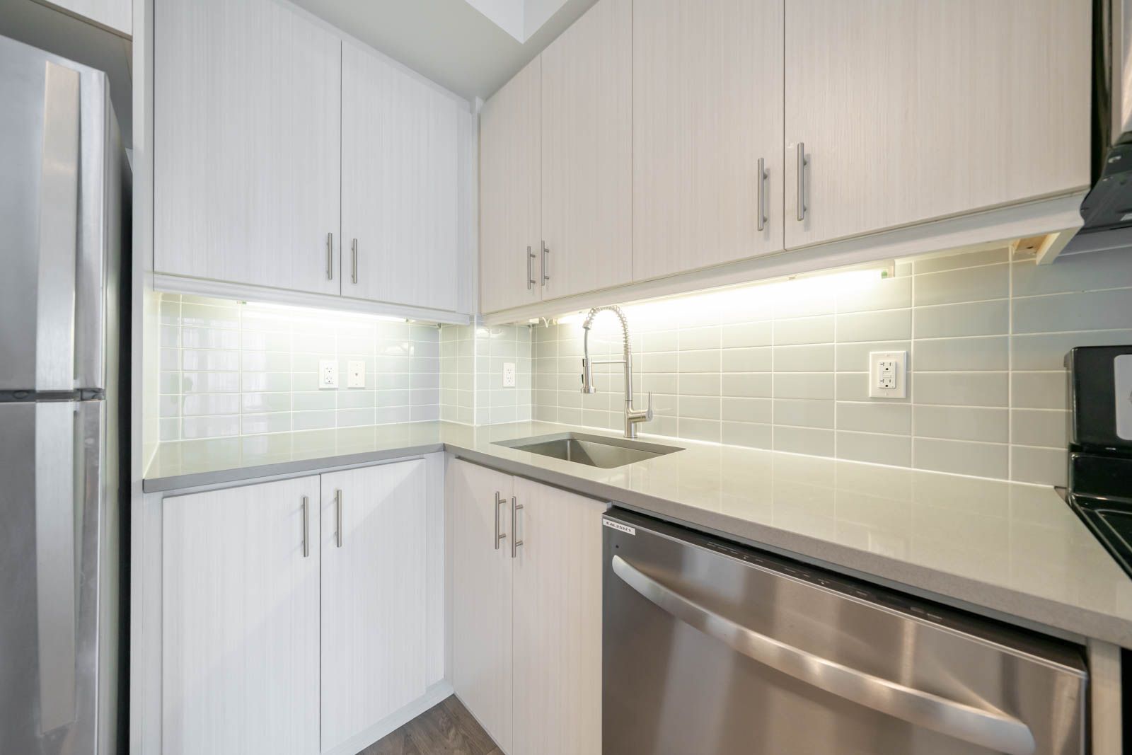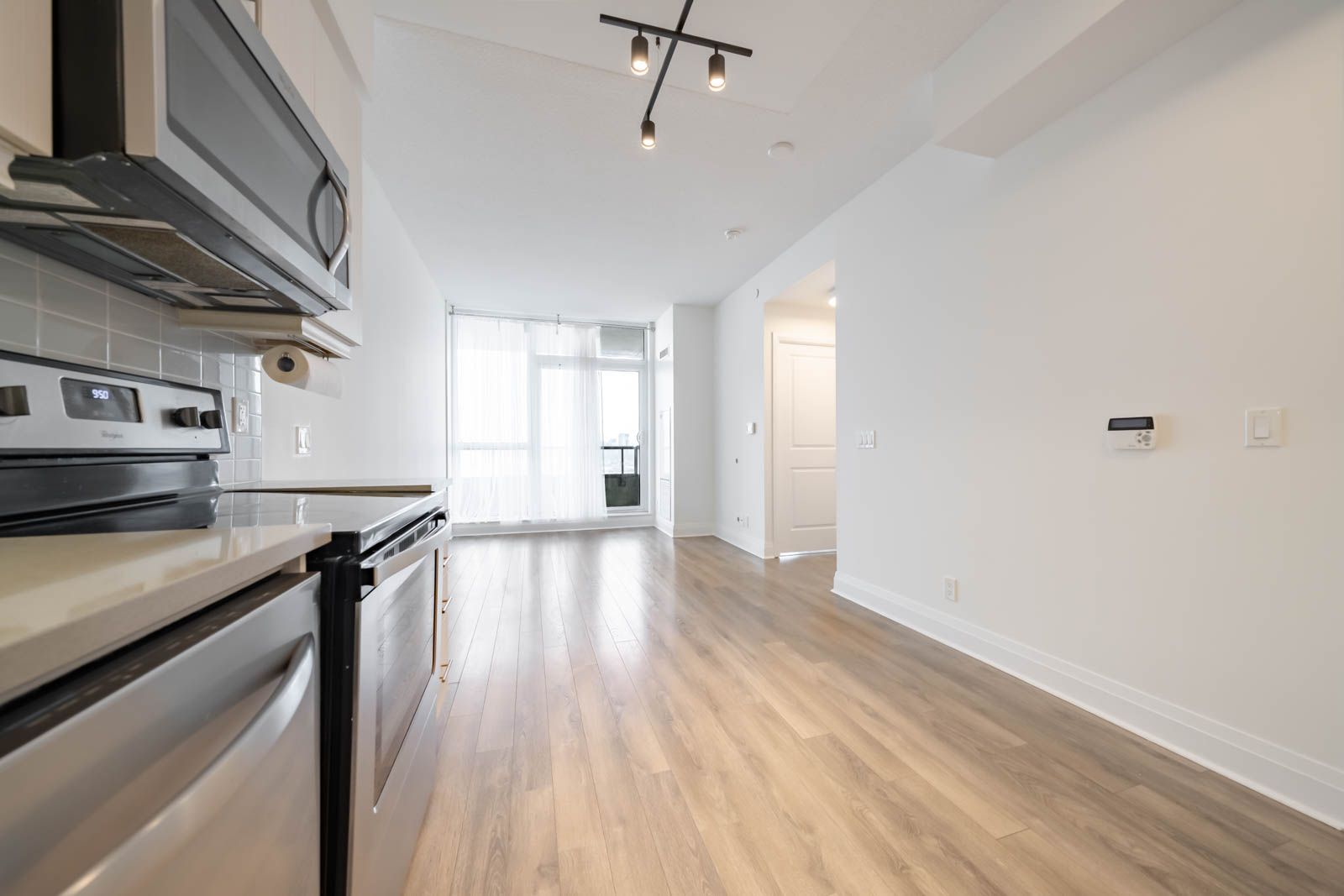 Stunning 1-bed condo on the 18th floor with breathtaking views! Open-concept layout with 9' ceilings and floor-to-ceiling windows that flood the space with natural light. Elegant laminate flooring throughout, modern kitchen with quartz countertops, under-cabinet lighting, and stainless steel appliances. Enjoy your 56 sq ft private balcony, perfect for morning coffee or sunset views. Includes 1 underground parking space and ample visitor parking. Building offers infinity pool, outdoor terrace, gym, and more. Prime location just minutes from transit, major highways, shopping, restaurants, parks, and schools. Don't miss this urban gem!