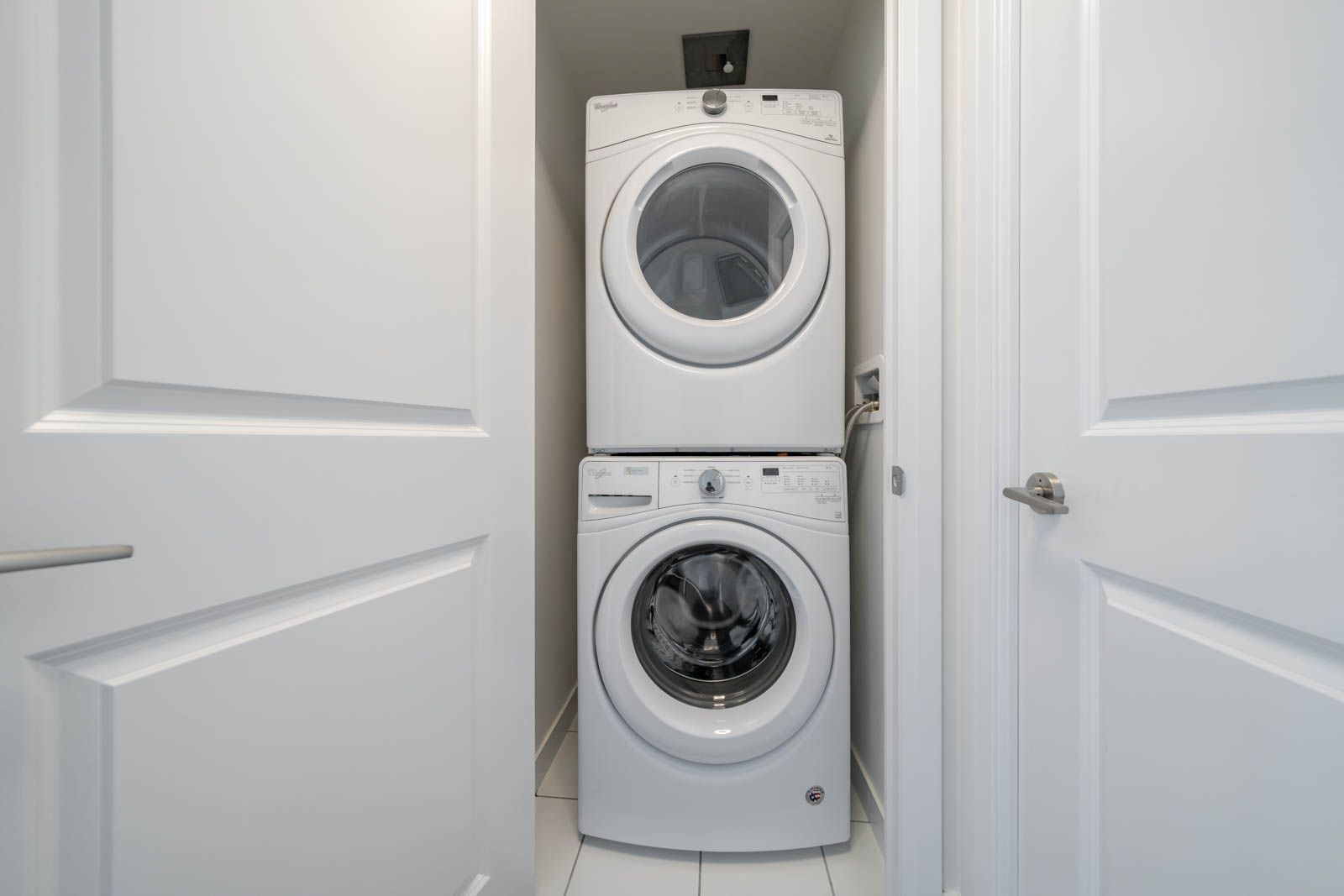 • Modern kitchen features quartz countertops and stainless steel appliances.