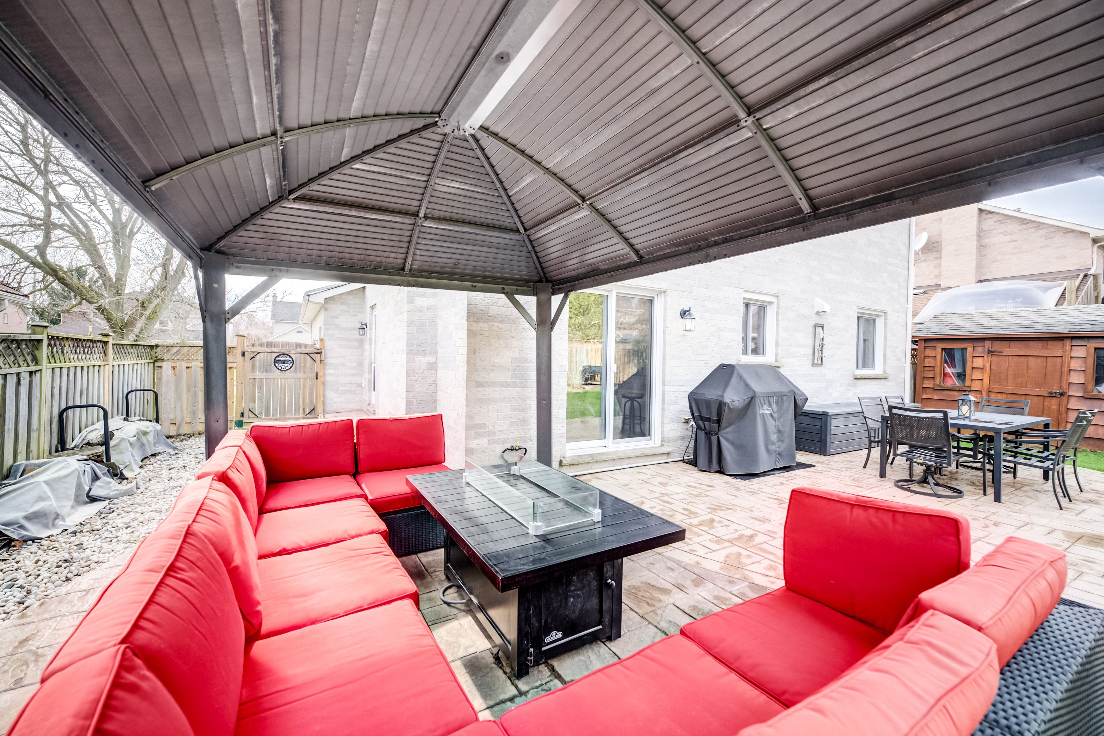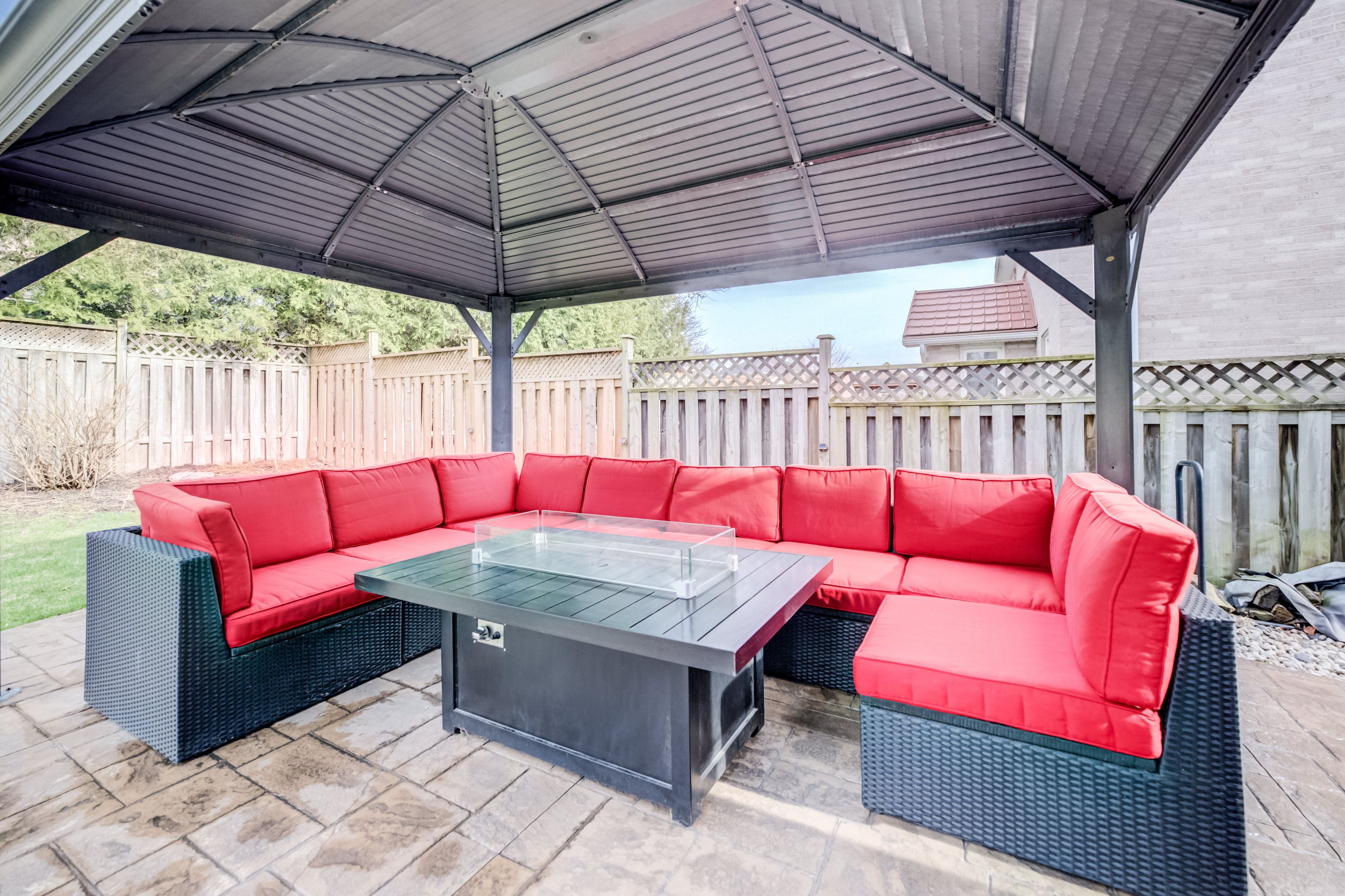 • Private backyard with stamped concrete patio, perfect for relaxation or gatherings.
