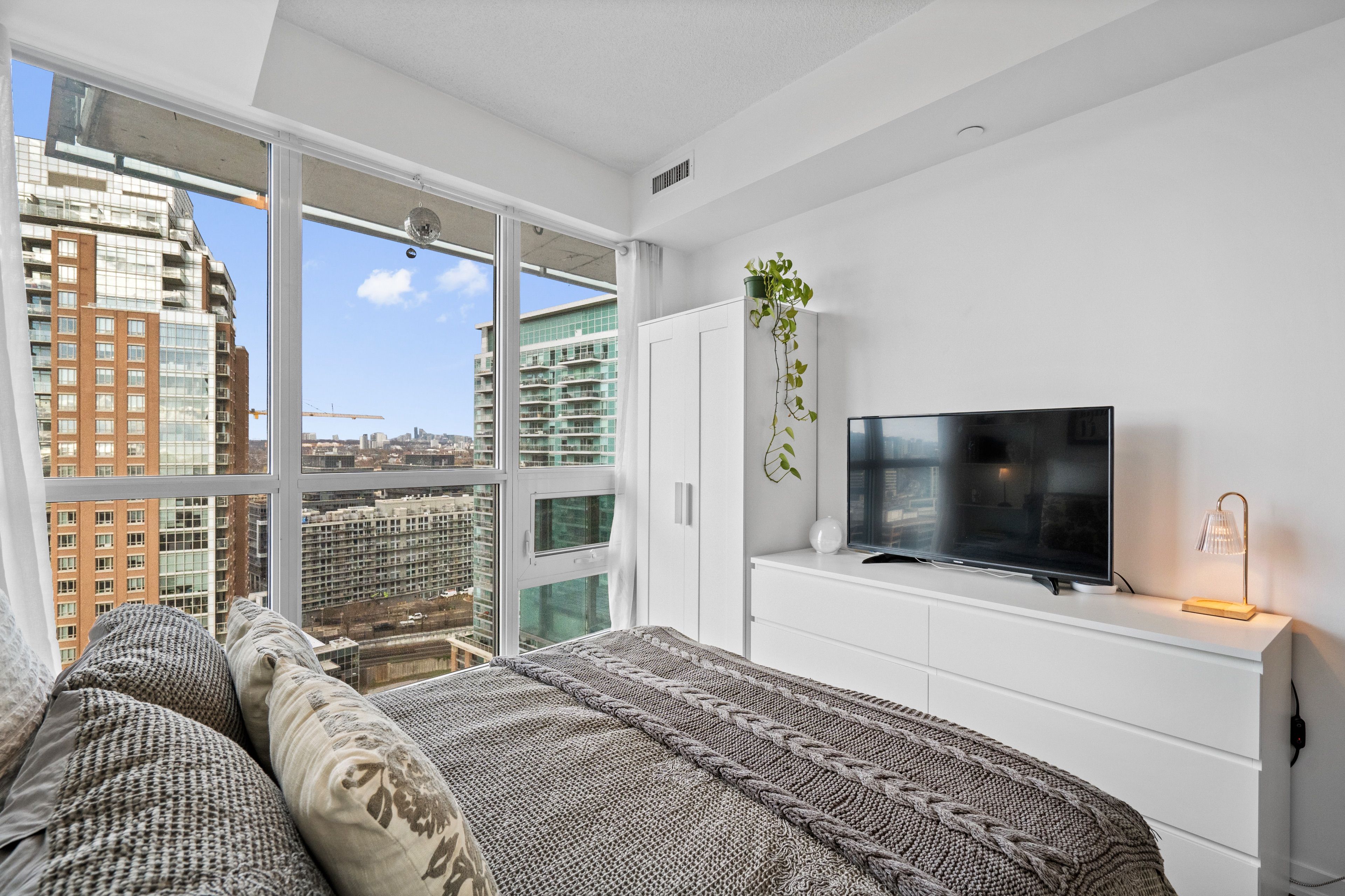 Welcome to your elevated urban sanctuary in one of liberty village's most desirable residences. This sun-filled 1-bedroom condo offers sweeping northwest views and an intelligently designed layout with no wasted space. The open living/dining area flows seamlessly into a contemporary kitchen with stainless-steel appliances and stone countertops. The bedroom is bright and spacious, paired with a stylish 4-piece bath and private balcony where you can unwind and enjoy the city skyline. Residents enjoy exceptional amenities: 24-hour concierge, fully equipped gym, yoga & pilates studio, sauna, party and games rooms, visitor parking, guest suites and a beautiful outdoor terrace with bbqs. Set in the heart of liberty village, this location delivers unmatched convenience - steps to transit, groceries, cafés, breweries, parks, and the city's trendiest dining and nightlife. Ideal for anyone seeking a turnkey condo in one of toronto's most sought-after neighbourhoods.