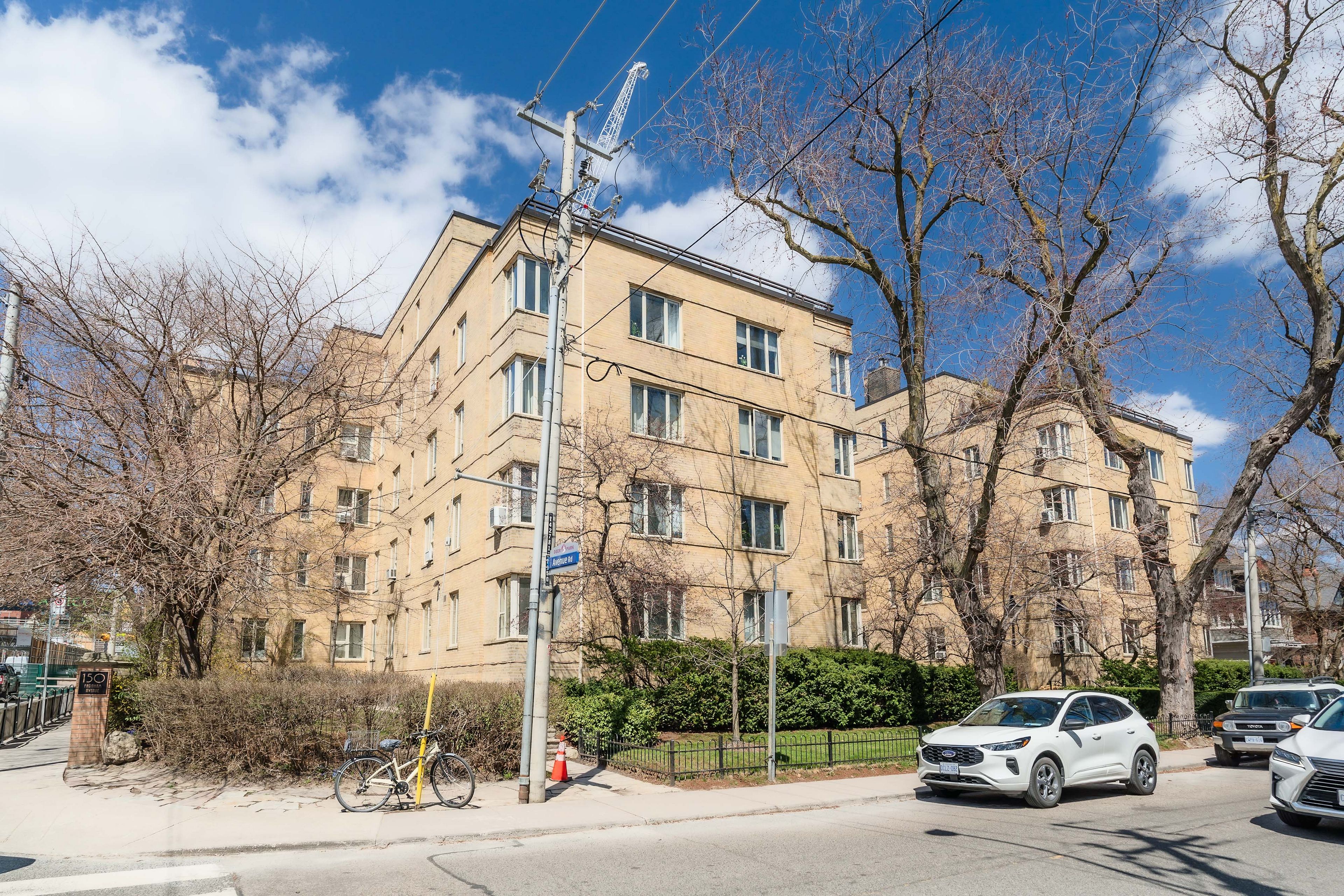 Welcome to the dorchester, a rare opportunity to own a true piece of toronto architectural history. This classic 1940 art deco building is quietly tucked into the prestigious deer park neighbourhood and offers a refreshing alternative to today's cookie-cutter condos. Surrounded by stately homes and tree-lined streets, this is elegant city living with real old world character. This spacious corner suite is full of original charm: rich hardwood floors, french and sliding doors, wainscotting, arched doorways, crown moulding, and striking black-framed casement windows that flood the space with natural light. The oversized bedroom includes a double closet and a full ensuite bath. The open-concept living and dining area features a versatile den or office nook, ideal for working from home, with possible space for a future murphy bed. The kitchen is compact but bright, with ceramic tile floors, subway tile backsplash, a large window, and just the right amount of retro flair. Pot lights add a modern touch throughout, and the unit offers excellent in-suite storage plus a separate locker downstairs. It's just a ten minute walk to the st. Clair subway, yonge street shops and restaurants, and beautiful parks. If you're looking for space, character, and location, rather than gyms you'll never use, this is the one. It's an address and space you'll be proud to show your friends.