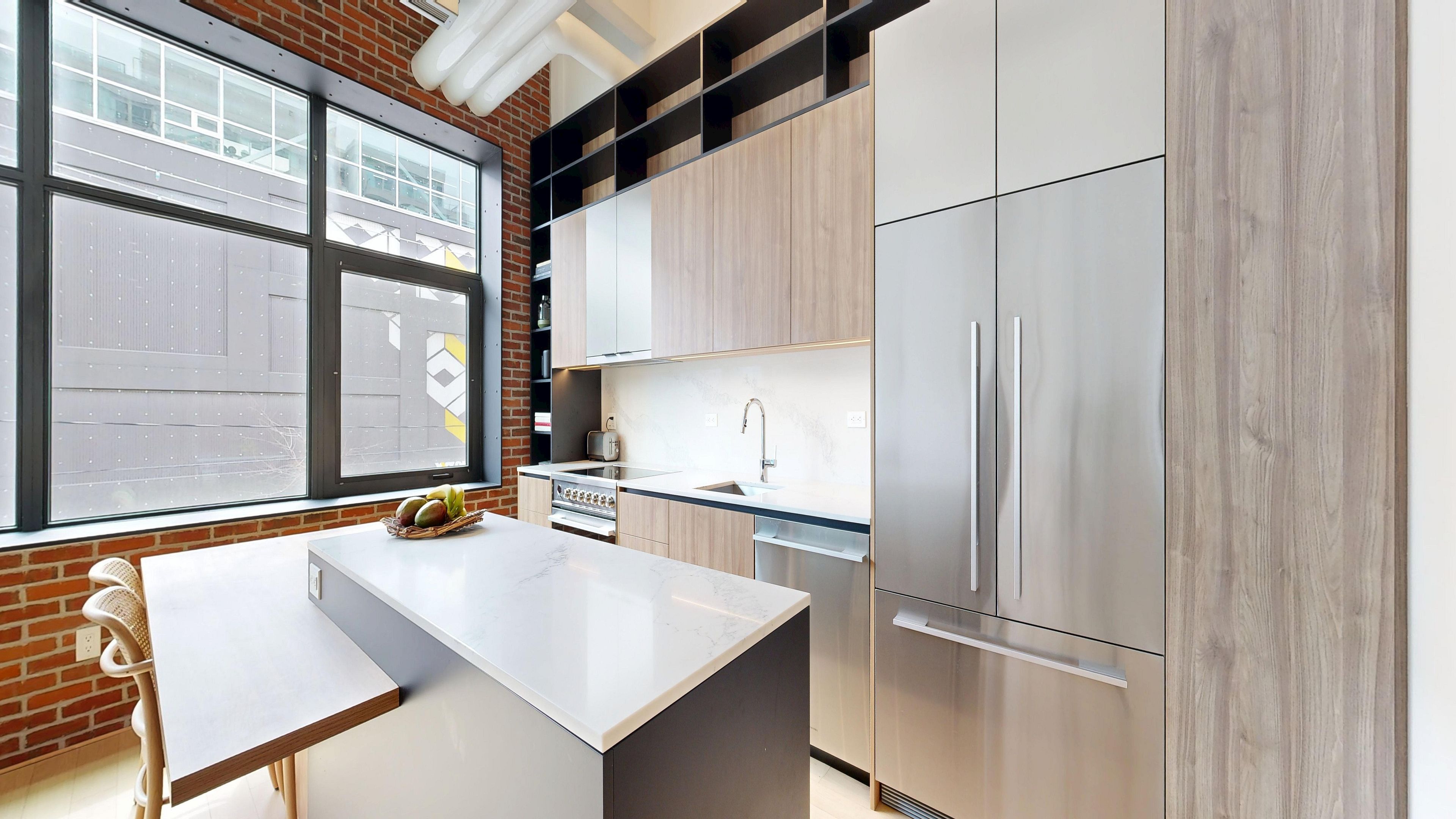• Modern kitchen featuring quartz countertops and full-size appliances.