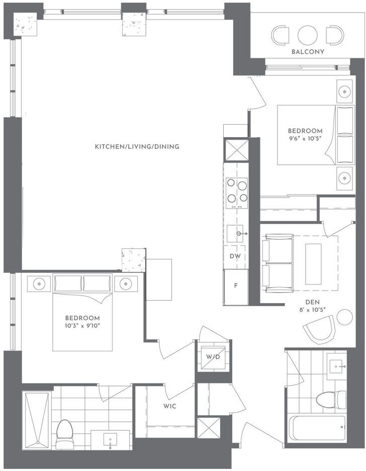 • Flexible layout includes two bedrooms plus a den for work or relaxation.