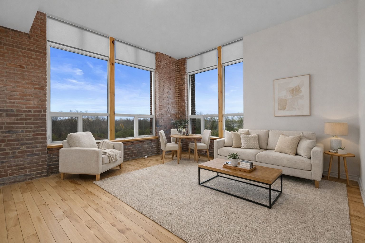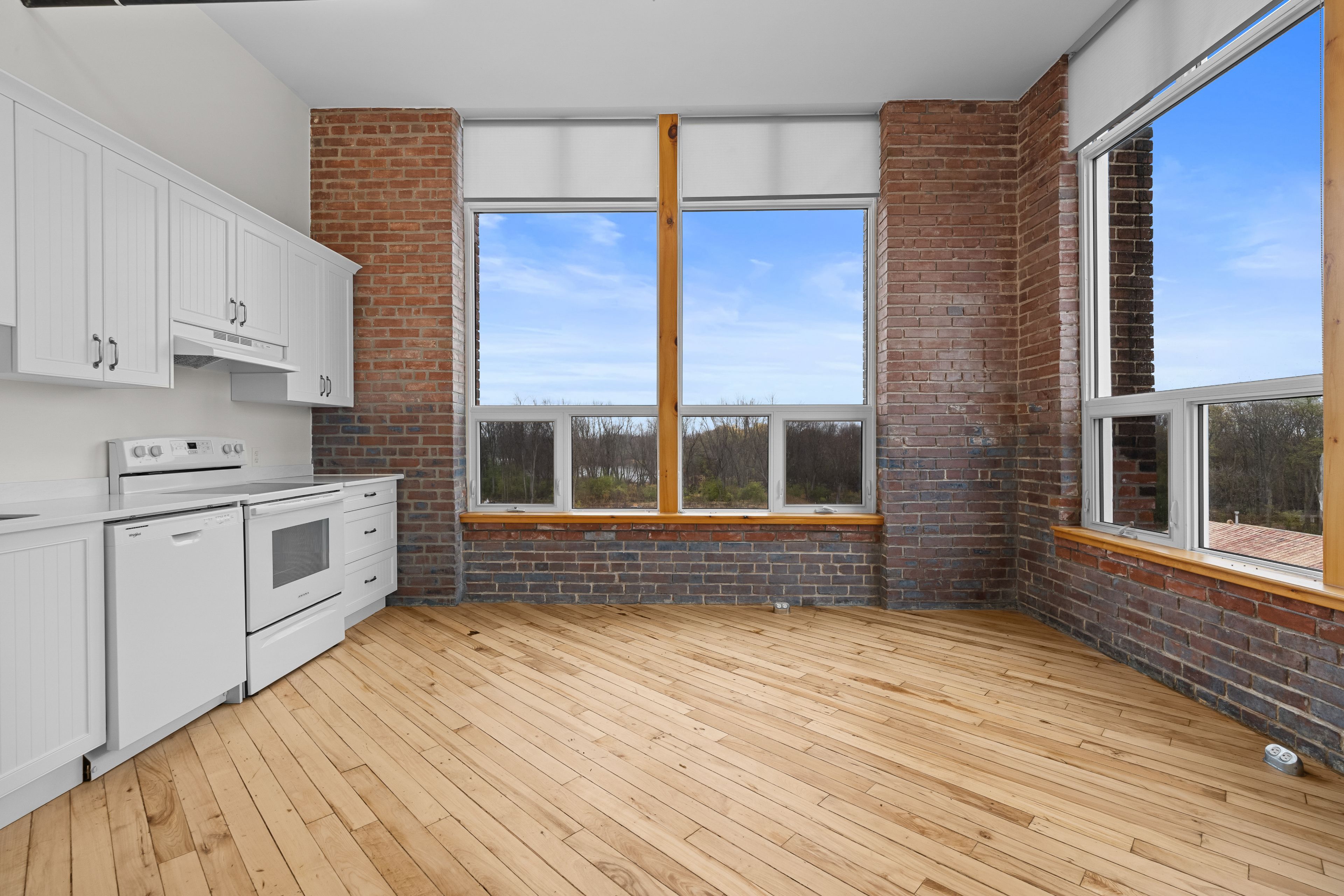 • Large windows provide natural light and partial river views.