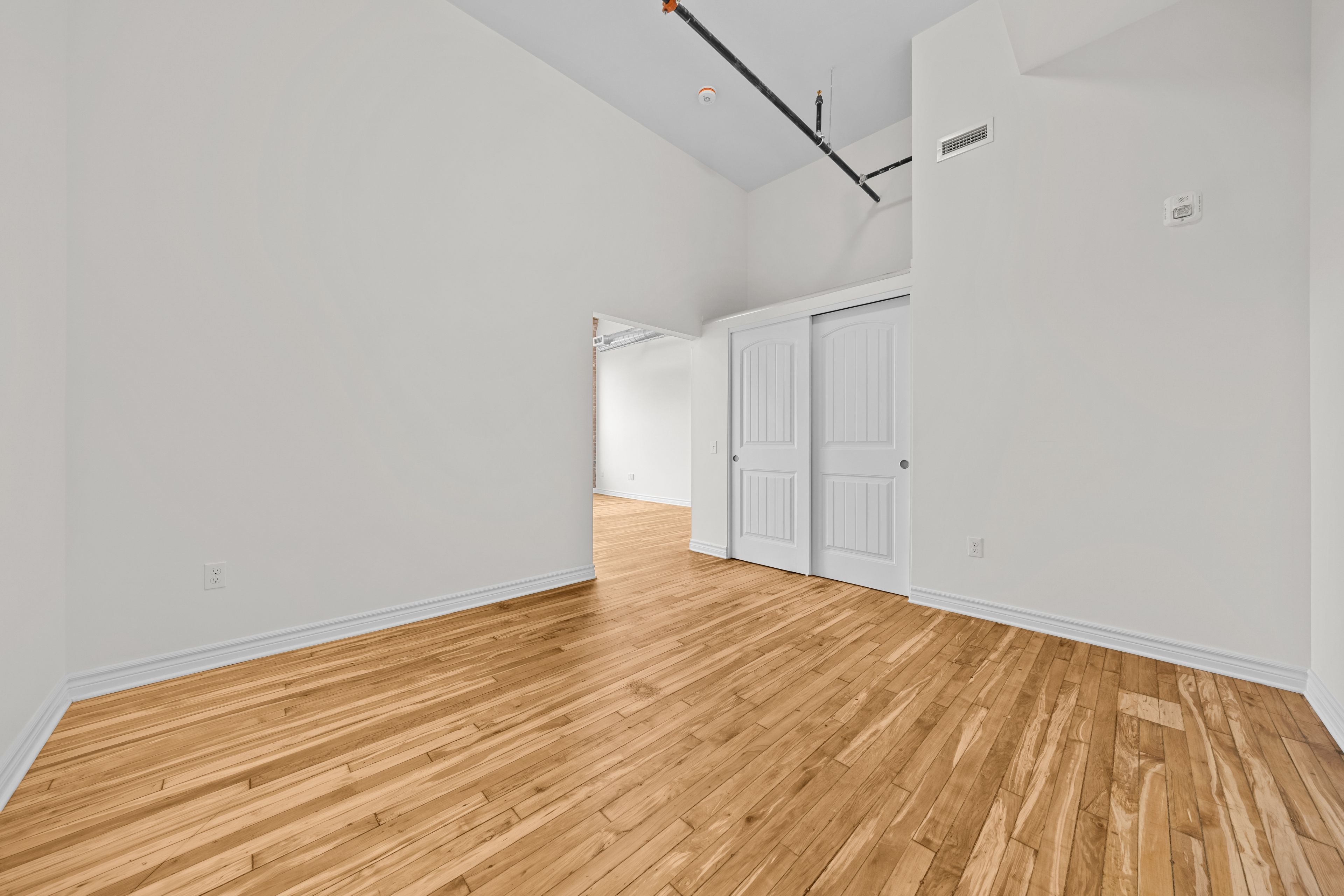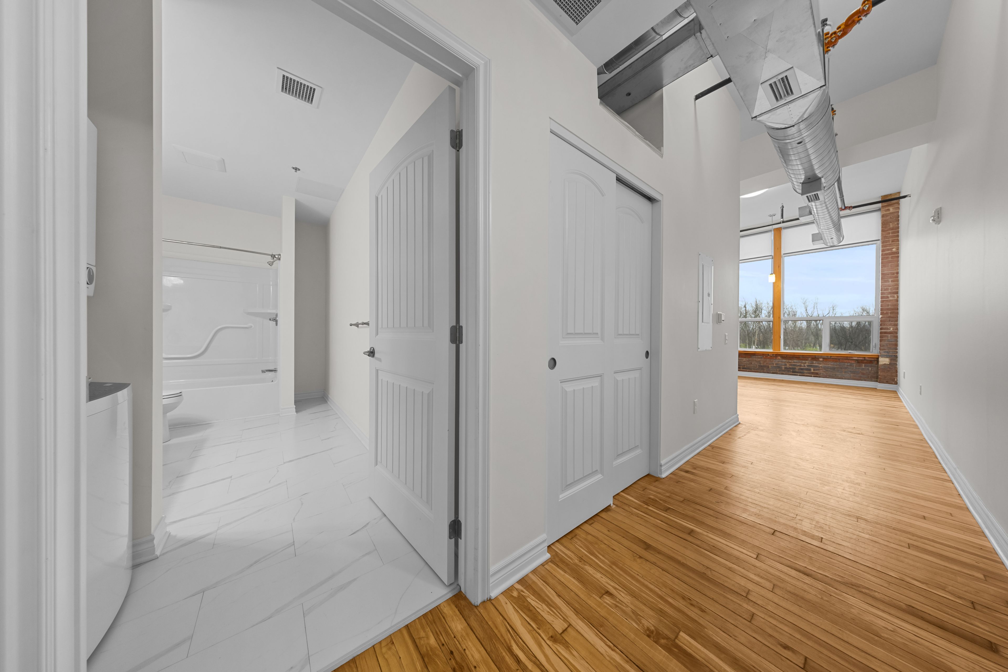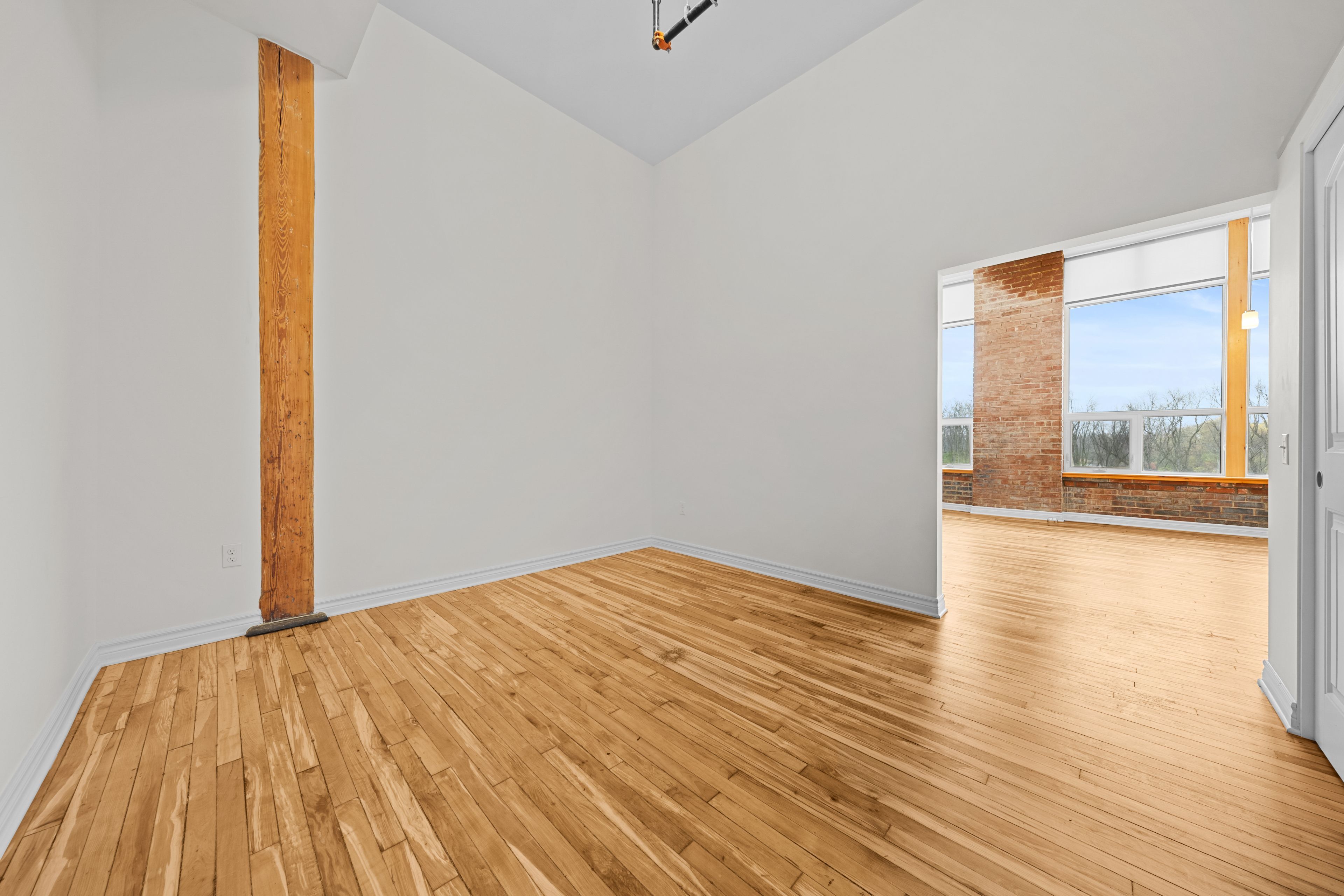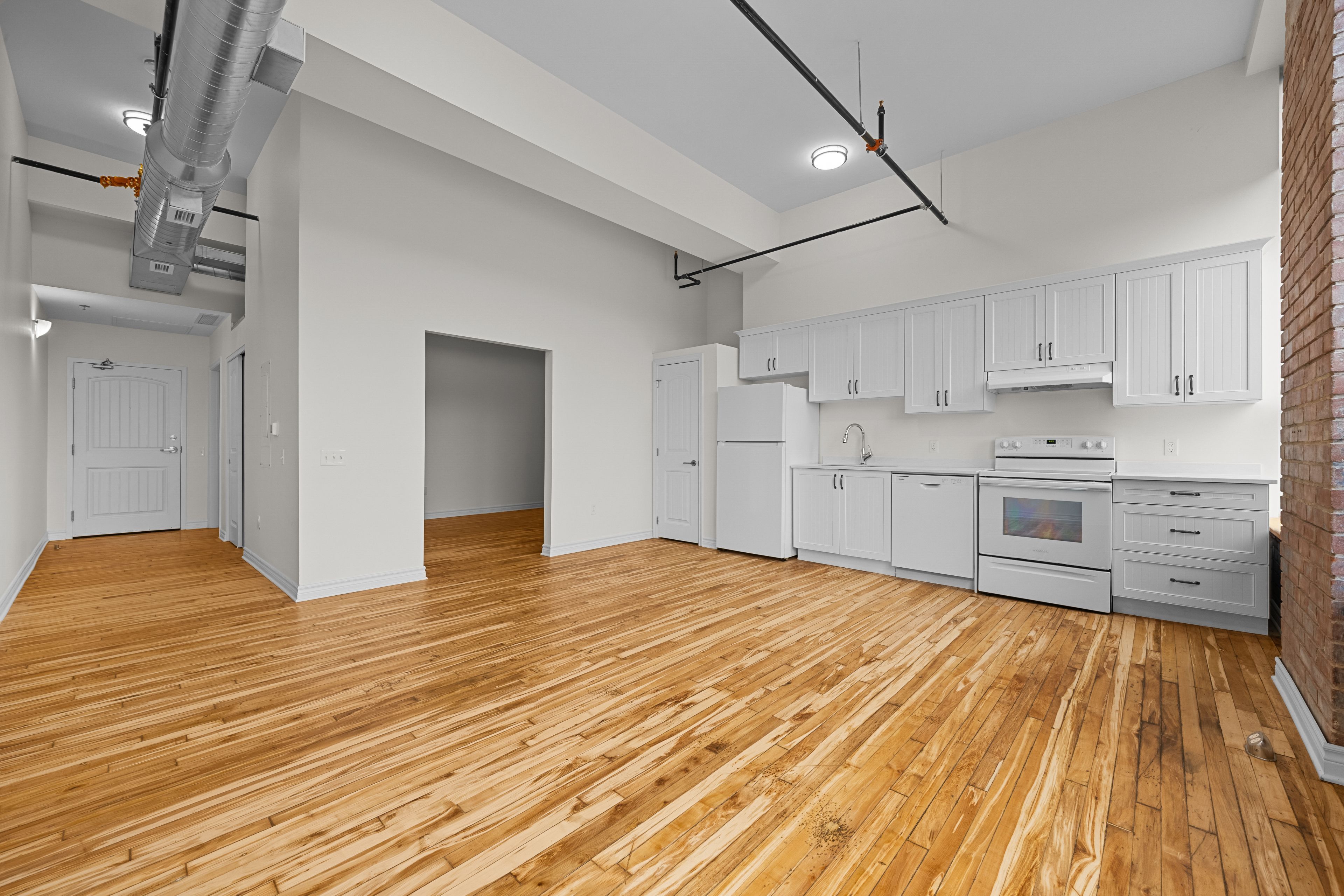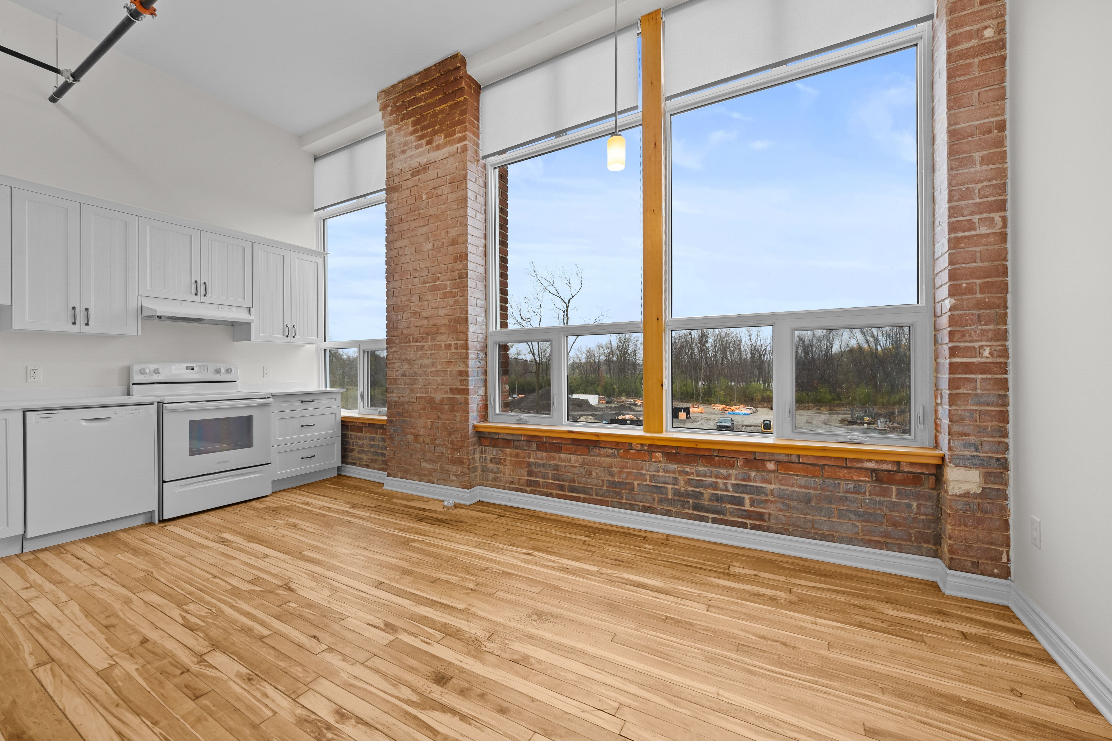 • Exposed brick, original hardwood floors, and high ceilings add character.