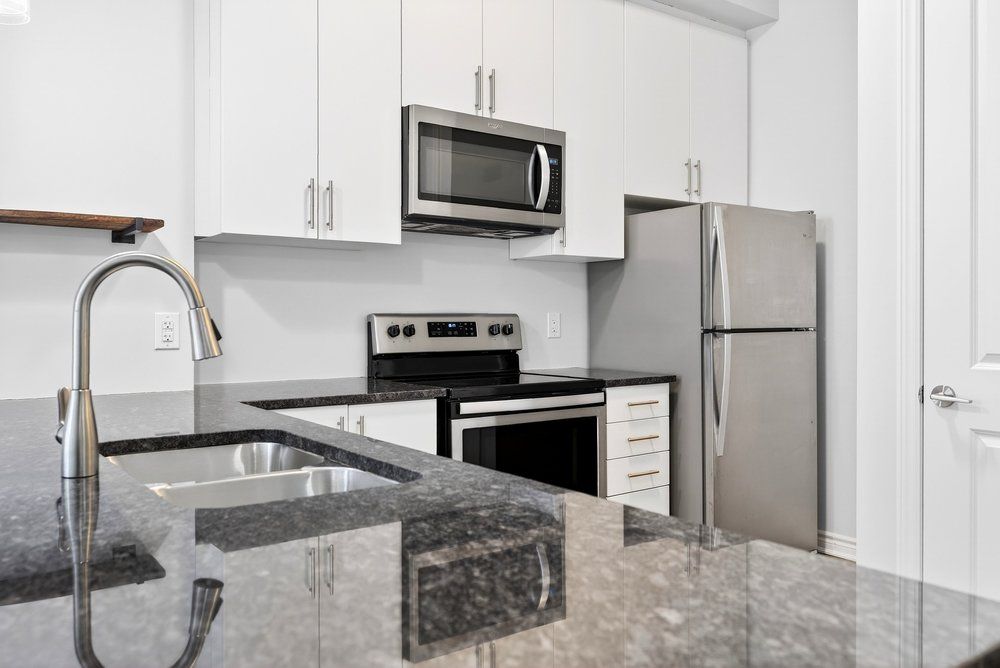• Modern kitchen features granite counters, custom breakfast bar, and tall cupboards.