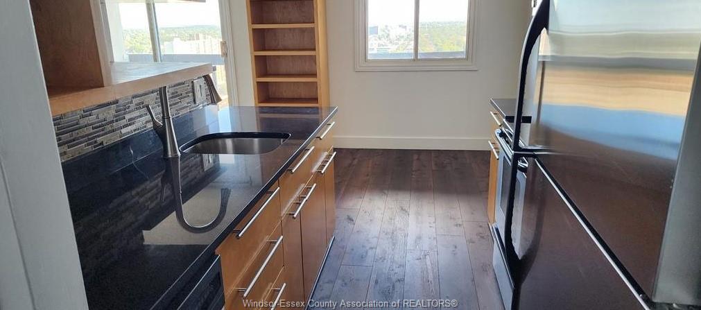 Quality! Quality! And an abundance of great taste & care. This is the one you have been searching for.. It's been redone/updated. Kitchen cabinets, granite counter tops, doors, waterproof luxury vinyl plank flooring (lvf) throughout, efficient heaters and newer efficient a/c unit, appliances and upscale pristine bathrooms. (please call for a full list of upgrades). 2 spacious balconies give you amazing views. Very convenient location - close to restaurants, shops and nightlife. 24 hour security monitoring the entire building. No matter what stage you are at.. Just starting out, retiring, or furthering your education - you should book a tour to discover this luxury condo unit! 24 hrs notice required as per ltb. Tenants leaving aug 1