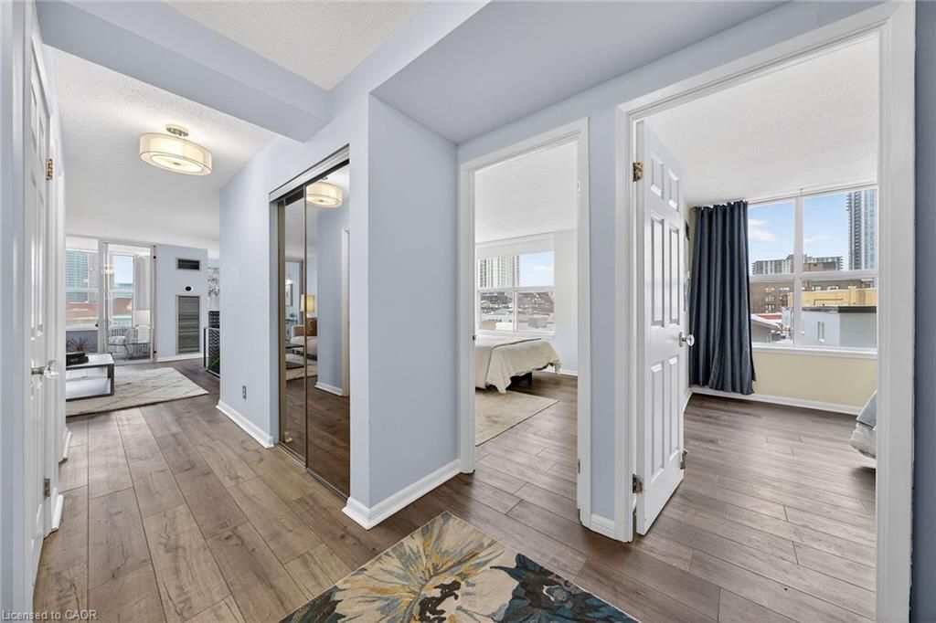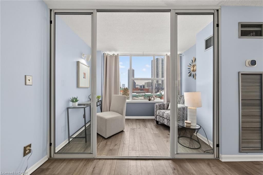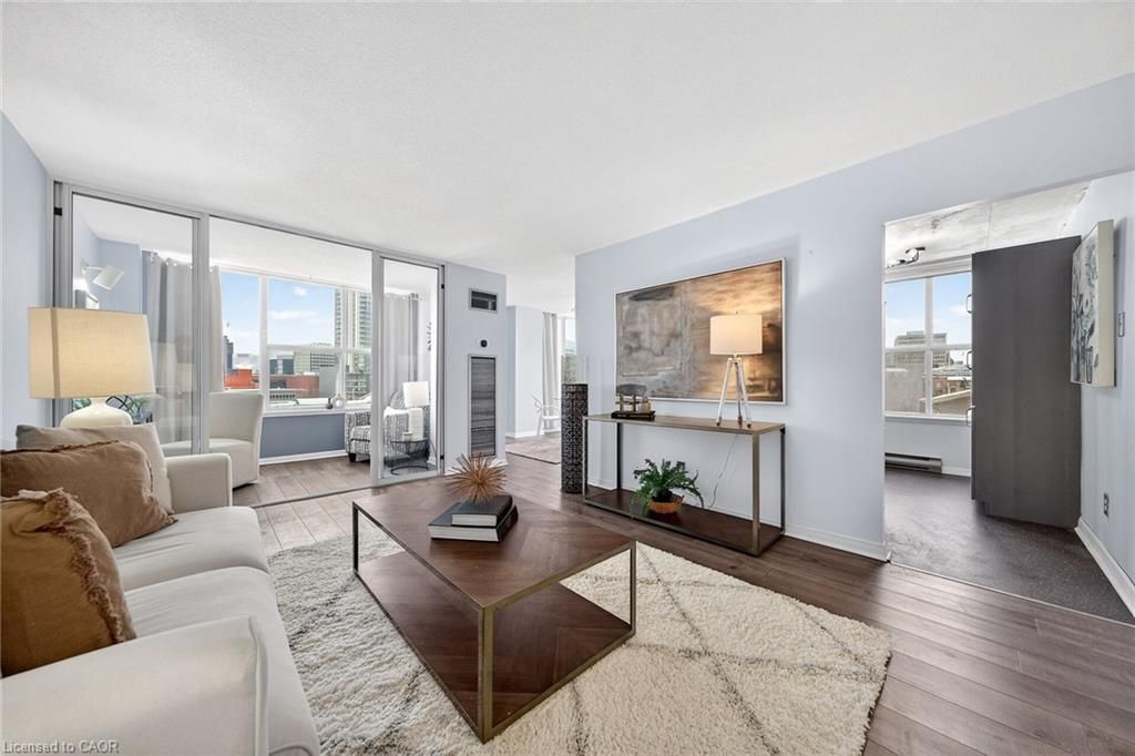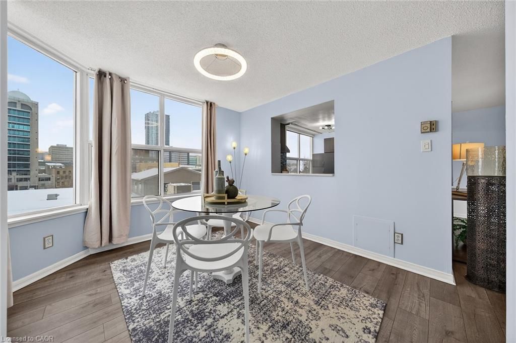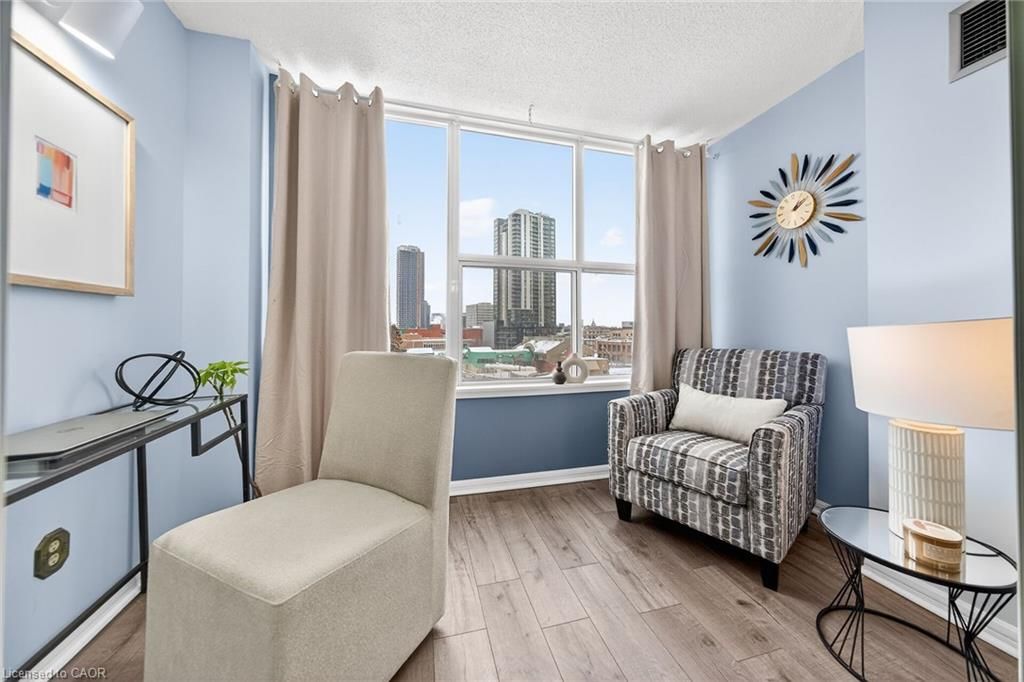 Welcome to queen's place condominiums, offering exceptional value in a prime downtown location. Steps to the entrance of victoria park ( one block). This bright 1,153 sq. Ft. Corner unit features 2 bedrooms plus a den and 2 bathrooms with a carpet-free layout and oversized windows that fill the space with natural light and panoramic city views. The spacious foyer leads to a generous primary bedroom with fabulous renovated ensuite, a well-sized second bedroom, and a large open-concept living area with a sunroom/den. Excellent for a home office. The separate dining area is surrounded by windows, creating a bright and inviting space. Windows facing both north east nd south west offer gorgeous sunrise and sunset views. The updated kitchen offers custom quartz counter tops, modern cabinetry and a built in coffee bar. Enjoy in-suite laundry, a storage locker, and a desirable sought-after, ground level # 8 unit owned garage parking space. Both fan coil hvac units newly replaced in 2025. Ideally located within walking distance to victoria park, lrt, google, the kitchener market, restaurants, cafés, shopping, and trails. Building amenities include a party room, rooftop patio with bbq, controlled entry, on-site superintendent, elevator, visitor parking, and pet-friendly living. Condo fees include heat, water, air conditioning, private personal garage on ground parking . Very well managed condominium. A fantastic opportunity in a highly desirable location - in a beautiful building.
