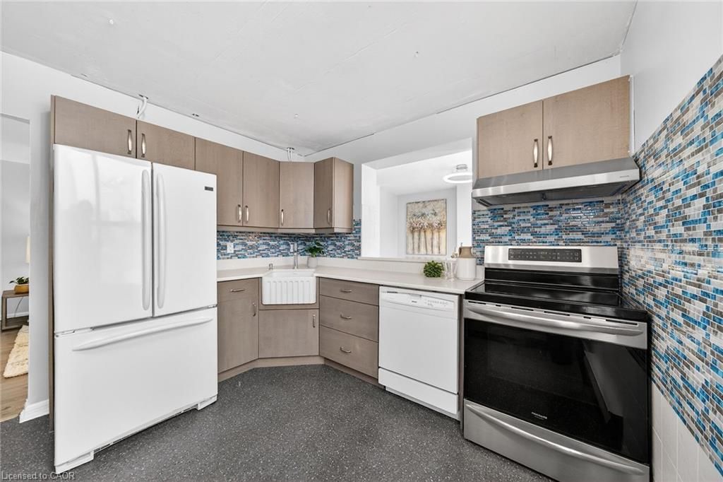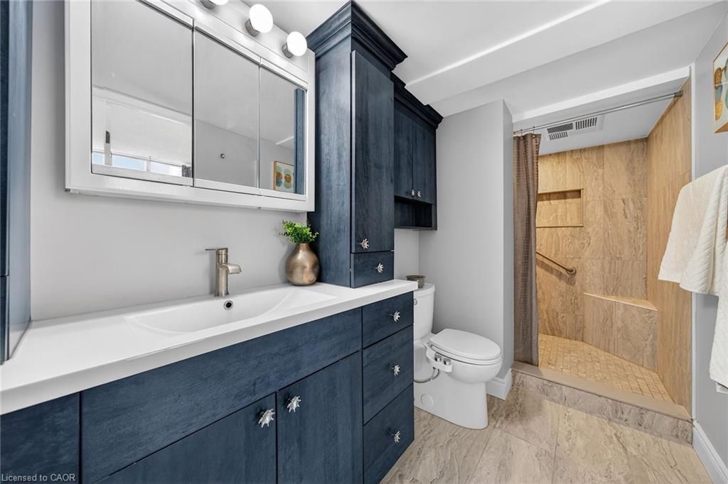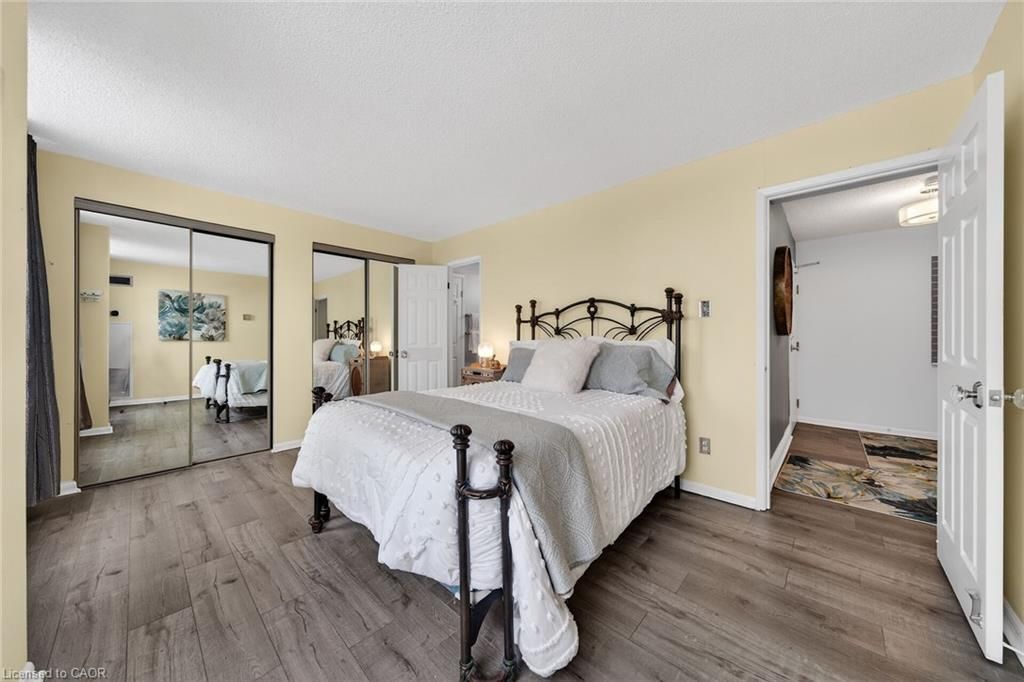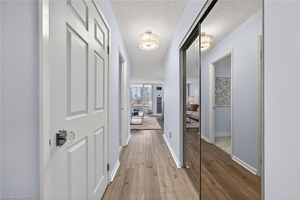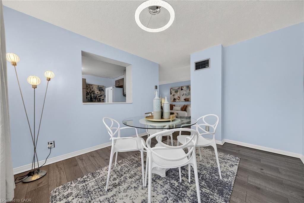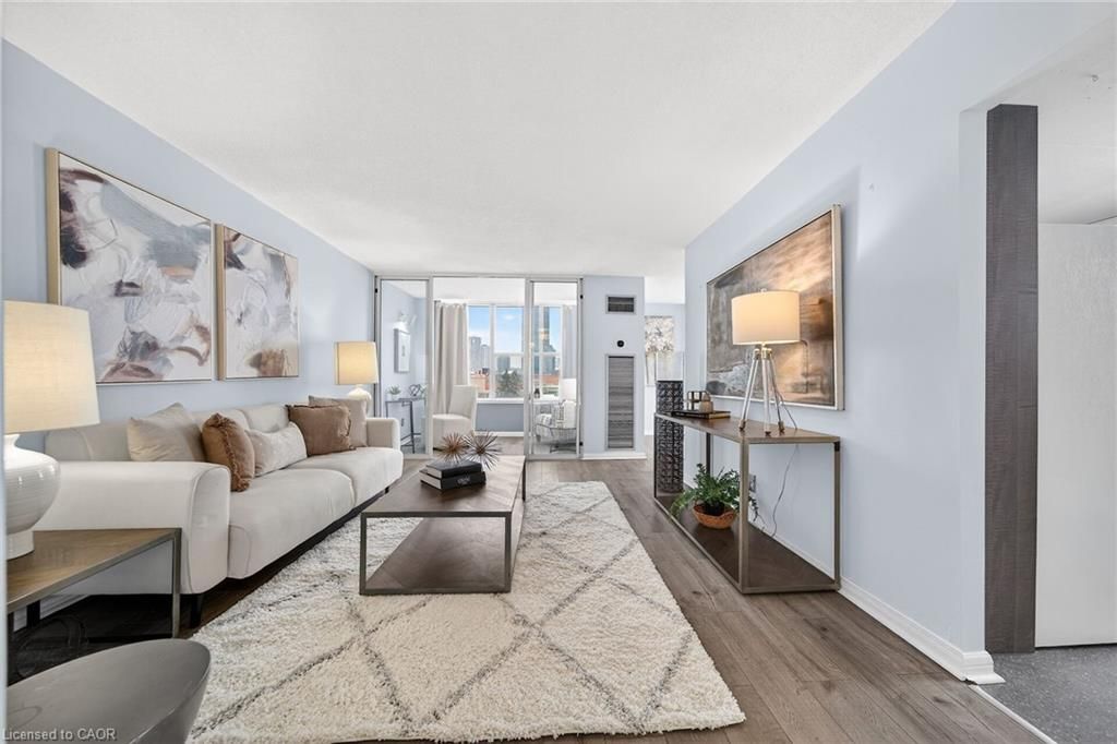 Welcome to queen's place condominiums, offering exceptional value in a prime downtown location. Steps to the entrance of victoria park ( one block). This bright 1,153 sq. Ft. Corner unit features 2 bedrooms plus a den and 2 bathrooms with a carpet-free layout and oversized windows that fill the space with natural light and panoramic city views. The spacious foyer leads to a generous primary bedroom with fabulous renovated ensuite, a well-sized second bedroom, and a large open-concept living area with a sunroom/den. Excellent for a home office. The separate dining area is surrounded by windows, creating a bright and inviting space. Windows facing both north east nd south west offer gorgeous sunrise and sunset views. The updated kitchen offers custom quartz counter tops, modern cabinetry and a built in coffee bar. Enjoy in-suite laundry, a storage locker, and a desirable sought-after, ground level # 8 unit owned garage parking space. Both fan coil hvac units newly replaced in 2025. Ideally located within walking distance to victoria park, lrt, google, the kitchener market, restaurants, cafés, shopping, and trails. Building amenities include a party room, rooftop patio with bbq, controlled entry, on-site superintendent, elevator, visitor parking, and pet-friendly living. Condo fees include heat, water, air conditioning, private personal garage on ground parking . Very well managed condominium. A fantastic opportunity in a highly desirable location - in a beautiful building.