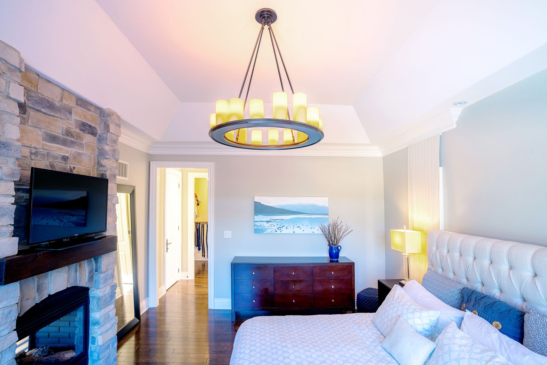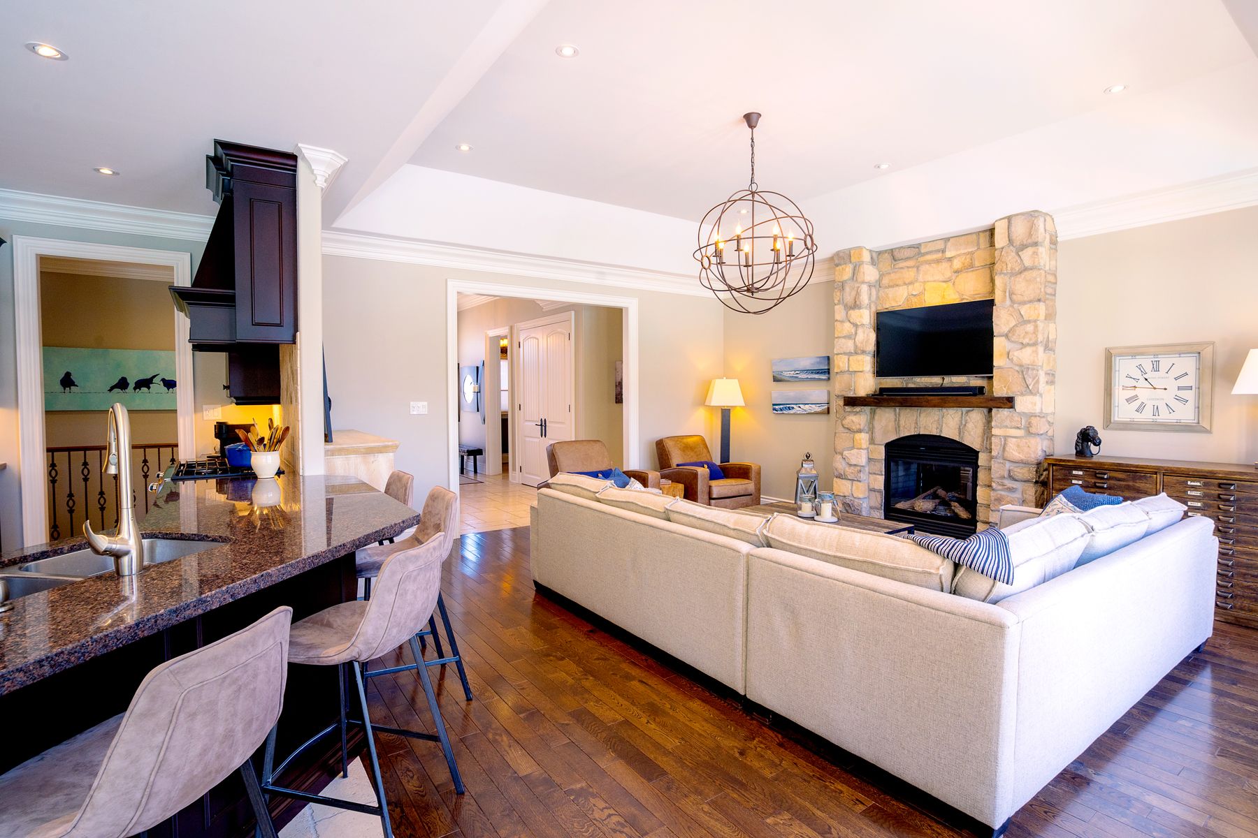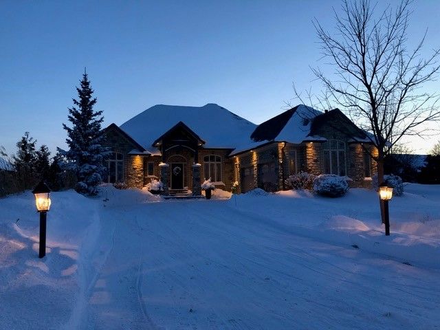 Outstanding craftsmanship defines this full-stone bungalow, perfectly positioned beside green space and backing onto the 12th tee of the prestigious lora bay golf course. The home offers three bedrooms, four bathrooms, a private den, and a formal dining room. The main level features a spacious great room with vaulted and coffered ceilings and a gas fireplace, creating an inviting gathering space. A gourmet kitchen showcases granite countertops, solid maple cabinetry, stainless steel appliances, and a walk-out to the flamed-flagstone patio and pool area. The private primary suite includes a stone-faced double-sided fireplace, a four-piece ensuite with marble finishes, and tranquil backyard views, while two additional main-floor bedrooms provide flexibility for guests or family. The finished lower level features nine-foot ceilings, radiant in-floor heating, a large family room, a cold room or wine cellar, and exceptional storage space. Outdoors, the south-facing backyard is professionally landscaped and designed for entertaining, complete with a sixteen-by-thirty-two-foot inground pool with programmable led lighting, flamed-flagstone surround, and ample space for lounging in full sun. An oversized twenty-one-by-thirty-four-foot garage with epoxy flooring accommodates vehicles, a golf cart, and workshop or storage needs. Additional details include an interlock stone driveway, under-eave exterior lighting, a tankless water heater replaced in 2022, a security surveillance system with hard-drive backup, fresh paint, and abundant natural light throughout. This impressive property combines timeless finishes with a coveted location, offering the lora bay lifestyle with golf, walking trails, and georgian bay just minutes away.