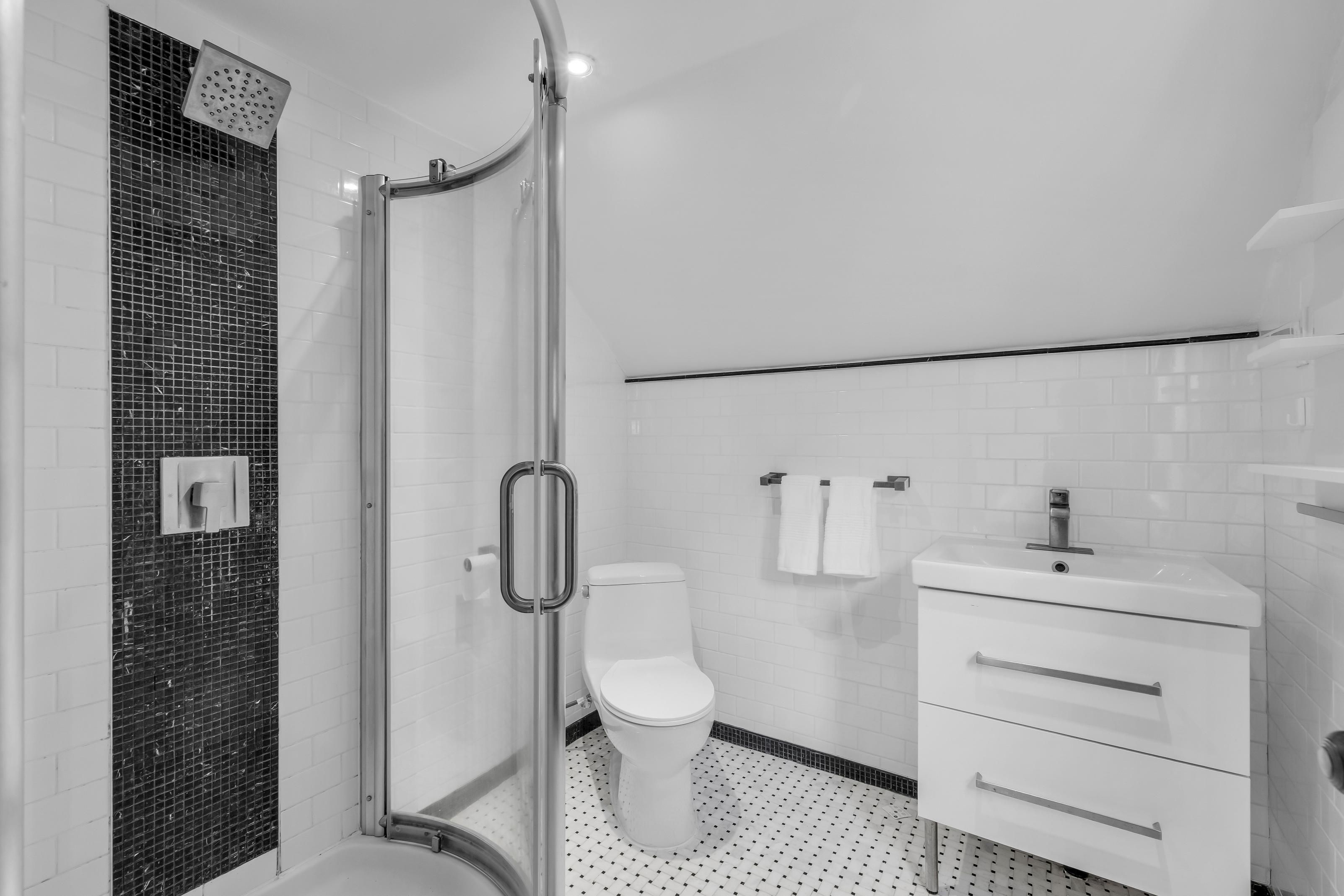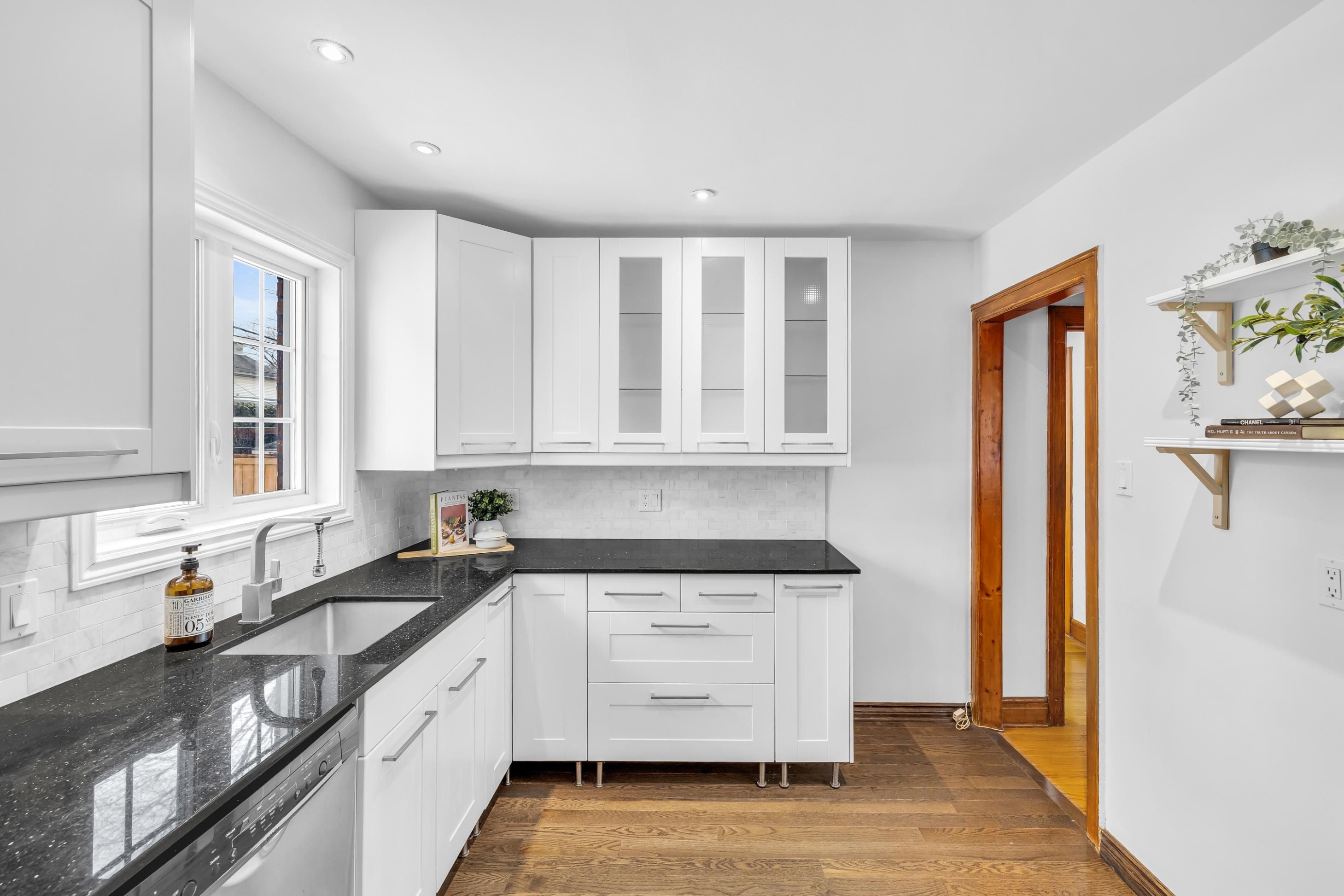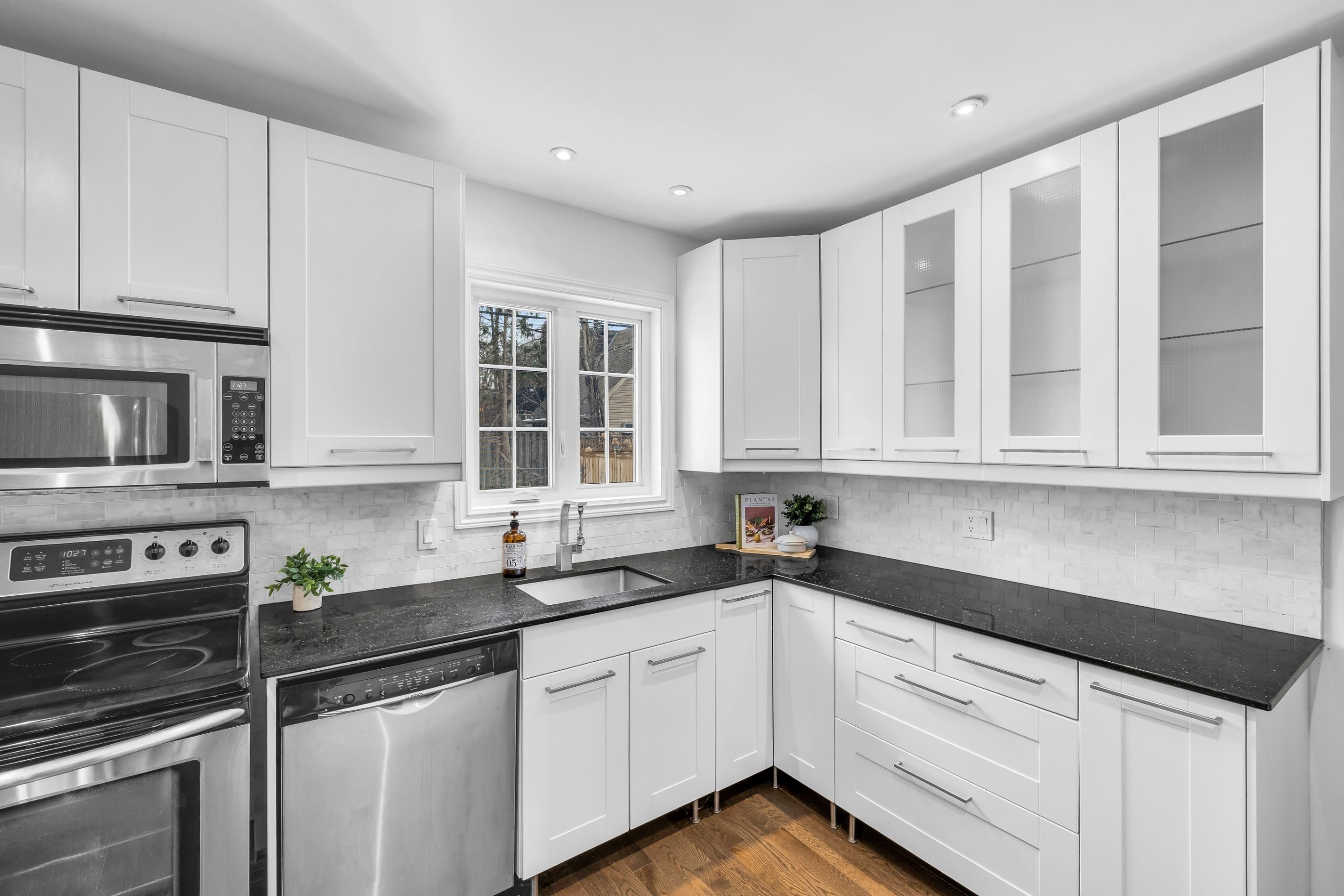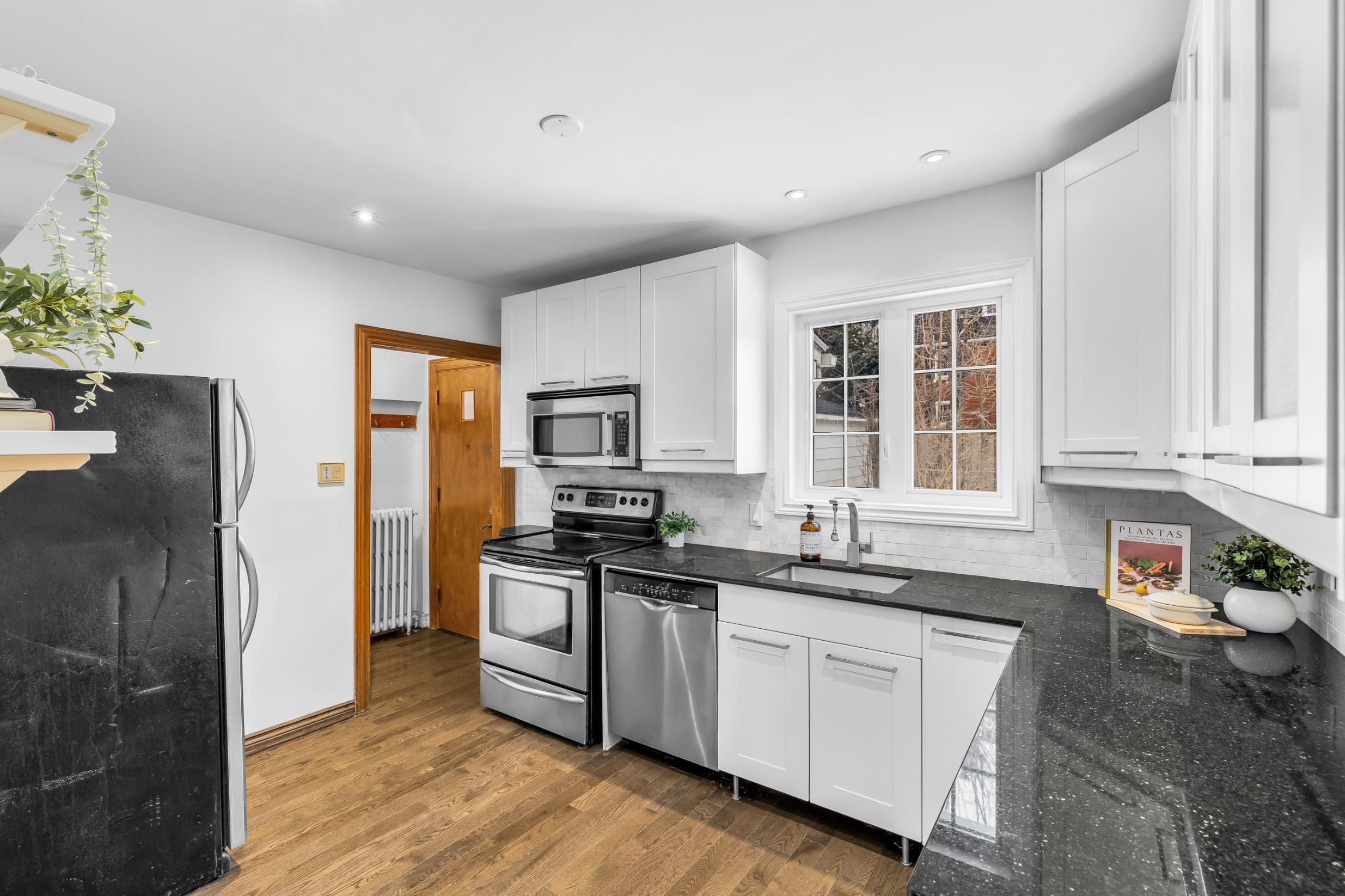 • Renovated kitchen with granite counters and stainless steel appliances.