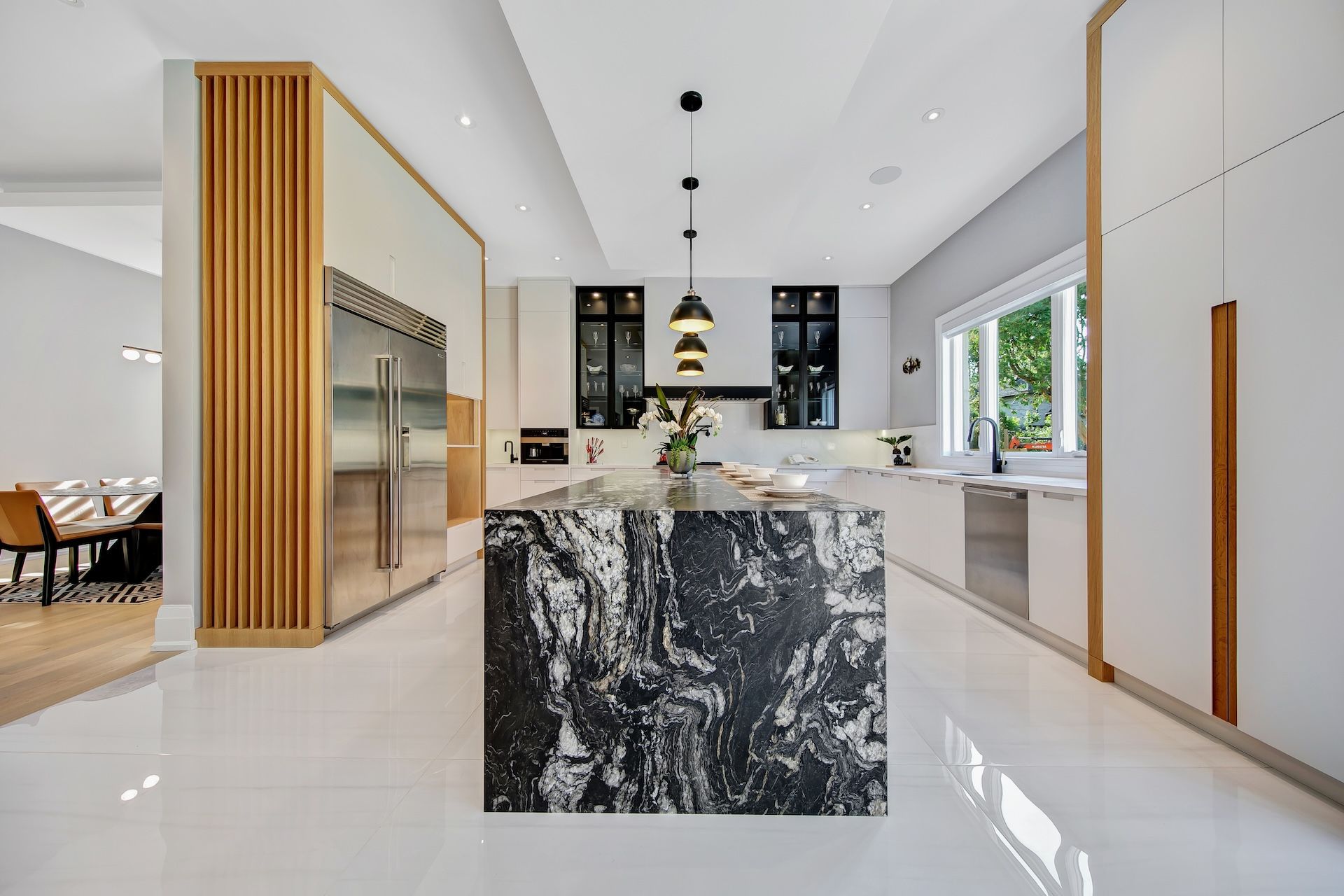 • Stunning kitchen features a 10-foot waterfall island and top appliances.