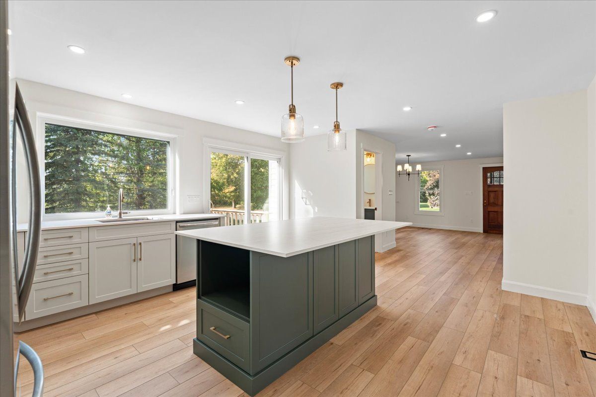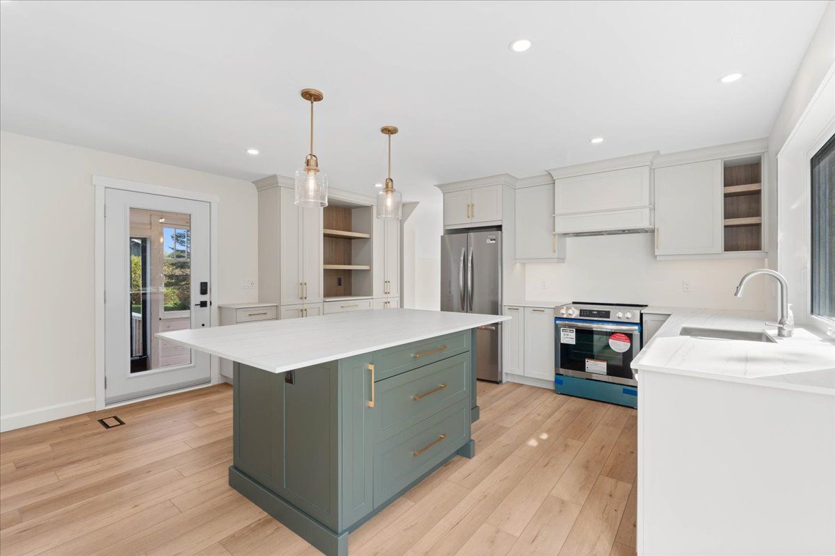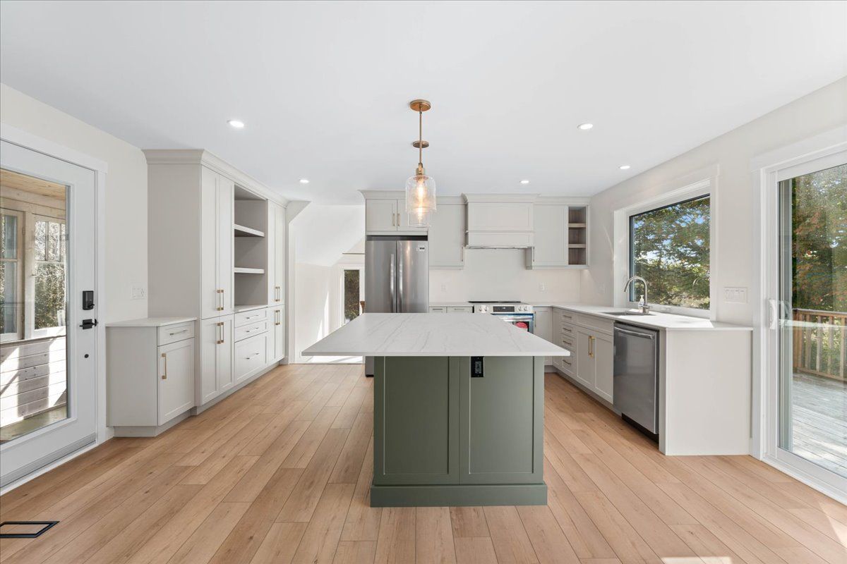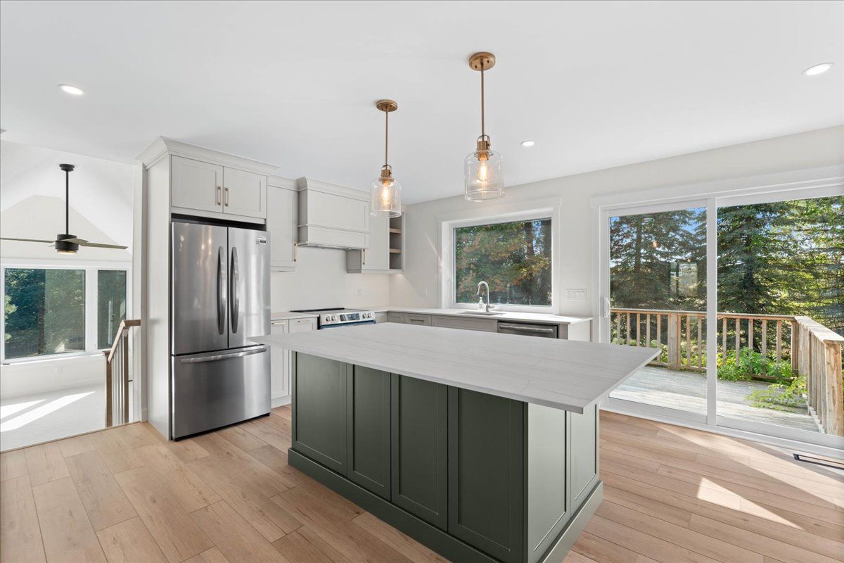 • Custom kitchen with large island and deck access for outdoor enjoyment.