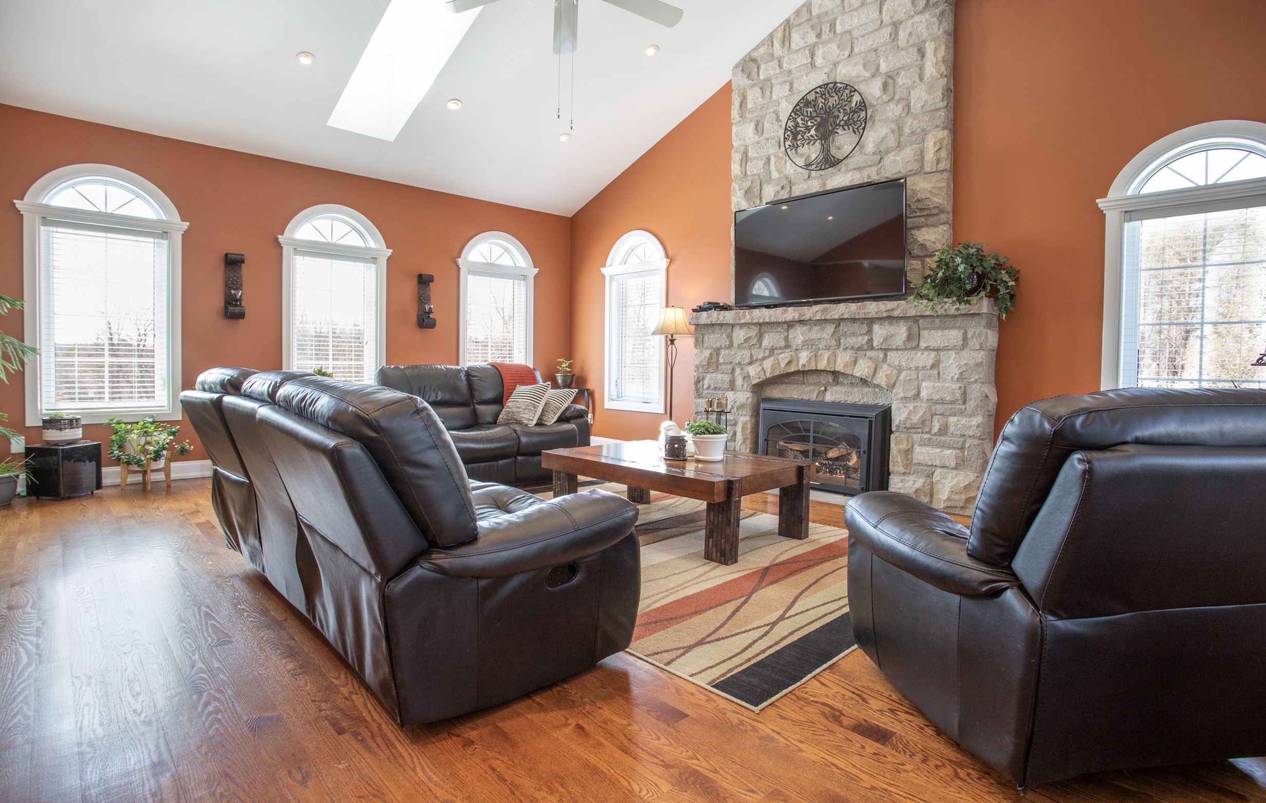• Spacious family room with cathedral ceilings and grand stone fireplace.
