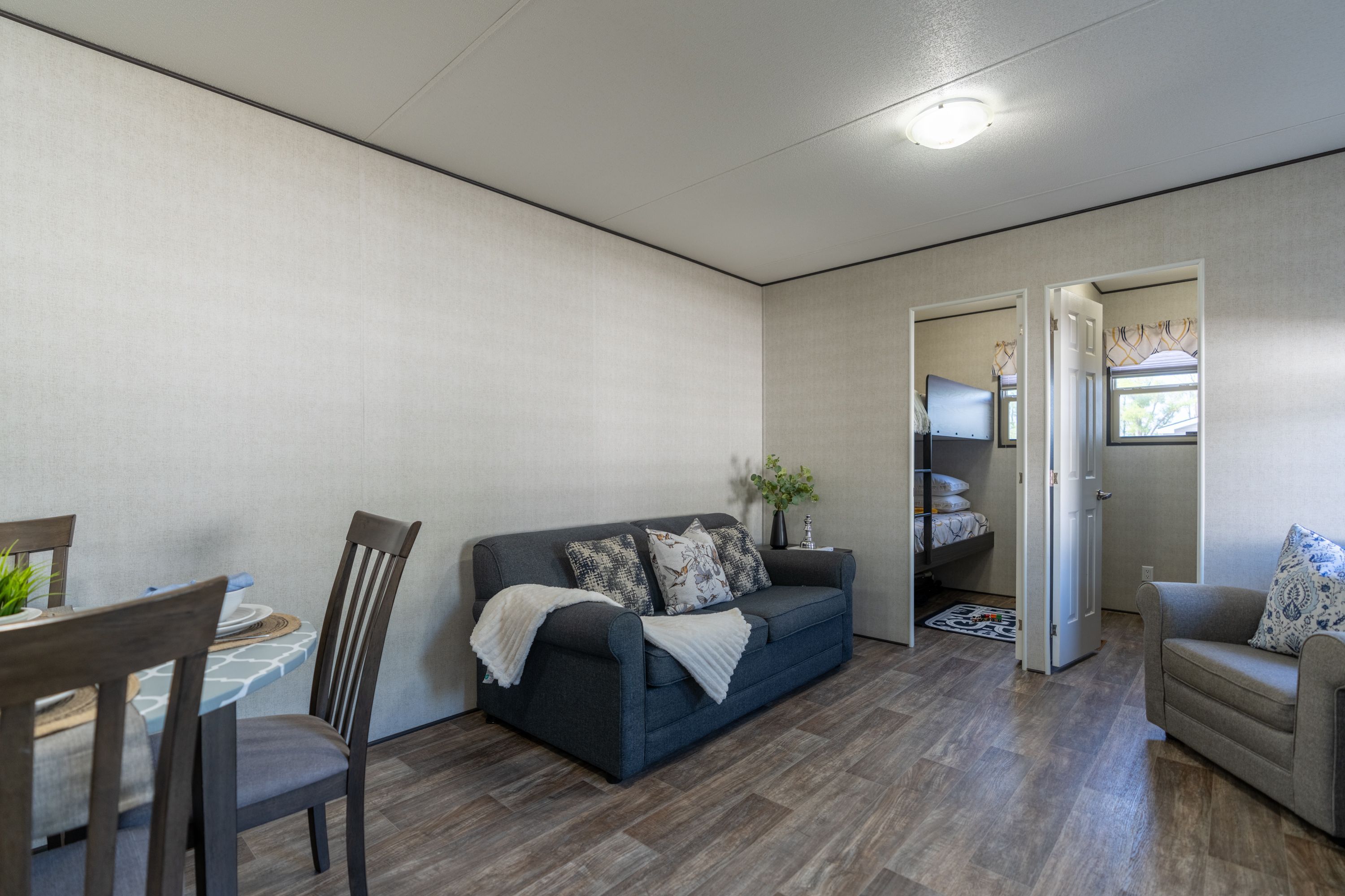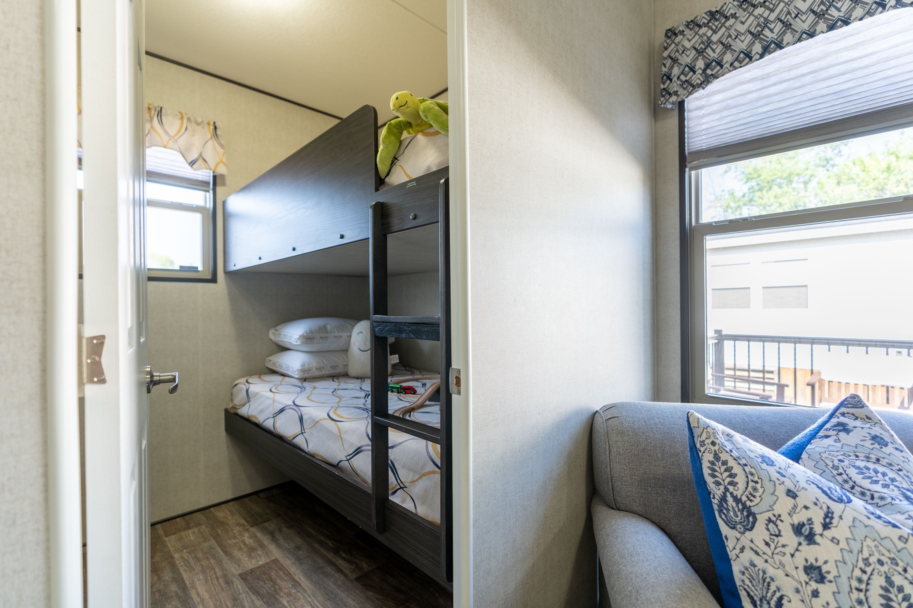 • Open-concept layout with a spacious primary bedroom and bunk rooms.