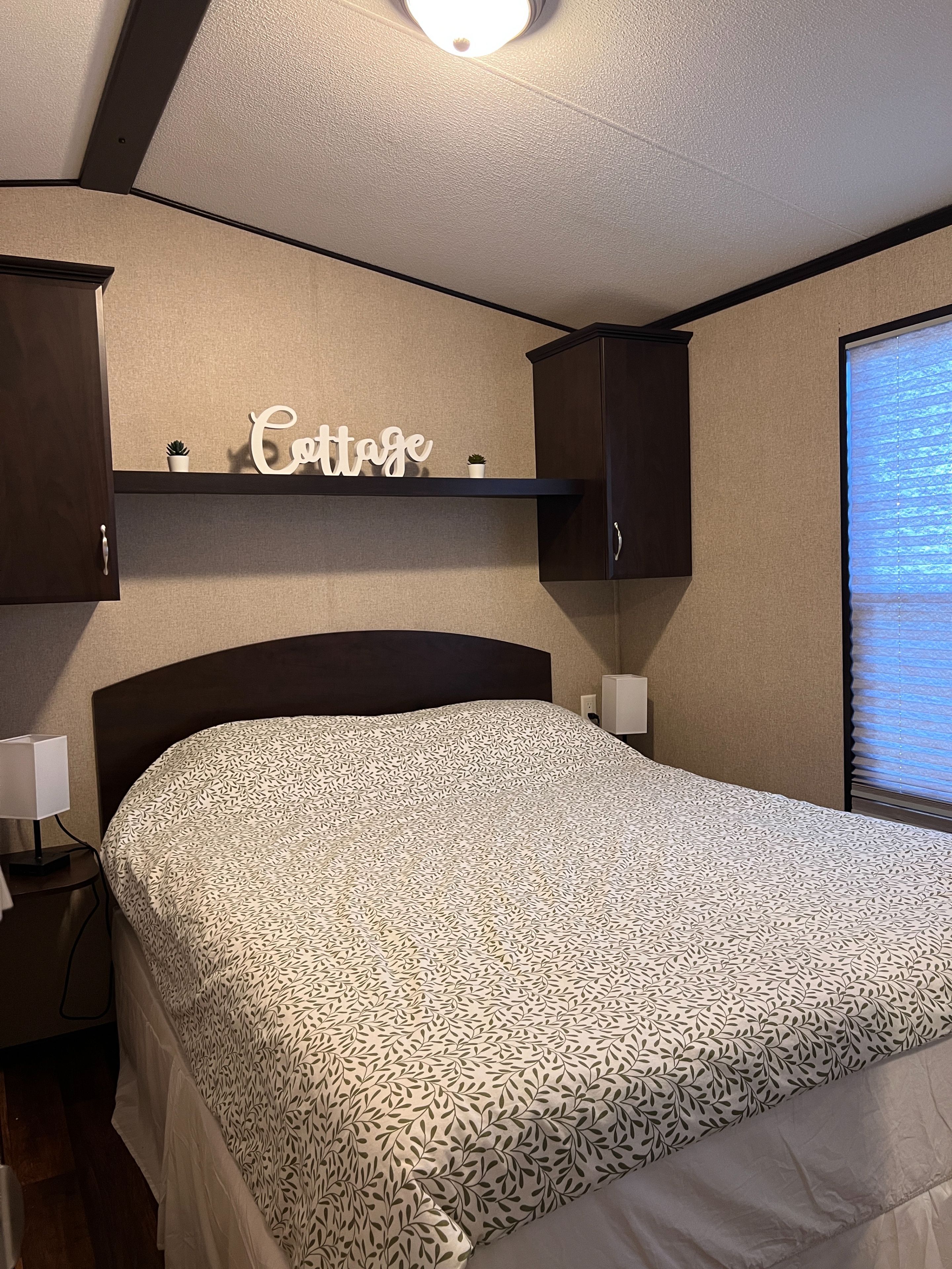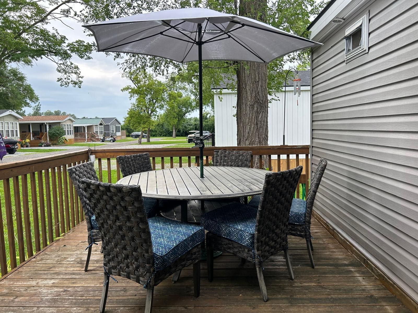 Welcome to unit 520 at 1501 line 8 road a fully furnished 2-bed, 1-bath 2013 northlander acorn model located in vine ridge resort. Nestled in a quiet, tree-lined section of the park, this unit offers added privacy and a peaceful setting, ideal for those looking to relax and unwind. Inside, you'll find a bright, open layout with a full kitchen, wood cabinetry, and ample storage throughout. One of the standout features is the extra-large, fully covered deck - sheltered by a full roof, it offers a comfortable outdoor space that feels like a true extension of the home. Vine ridge resort offers a wide range of amenities, including two swimming pools (one heated), a splash pad, sports courts for basketball, pickleball, and tennis, multiple playgrounds, scenic walking and biking trails, and picnic areas. The resort also hosts a calendar of activities throughout the season, creating a fun and lively atmosphere for families and guests. Open from may 1 to october 31, the resort allows short-term rentals including airbnb making this an excellent choice whether you're looking for a weekend escape, a seasonal rental, or a low-maintenance cottage alternative. Unit 520 offers a rare combination of privacy, space, and resort-style living right in the heart of niagara's wine country.