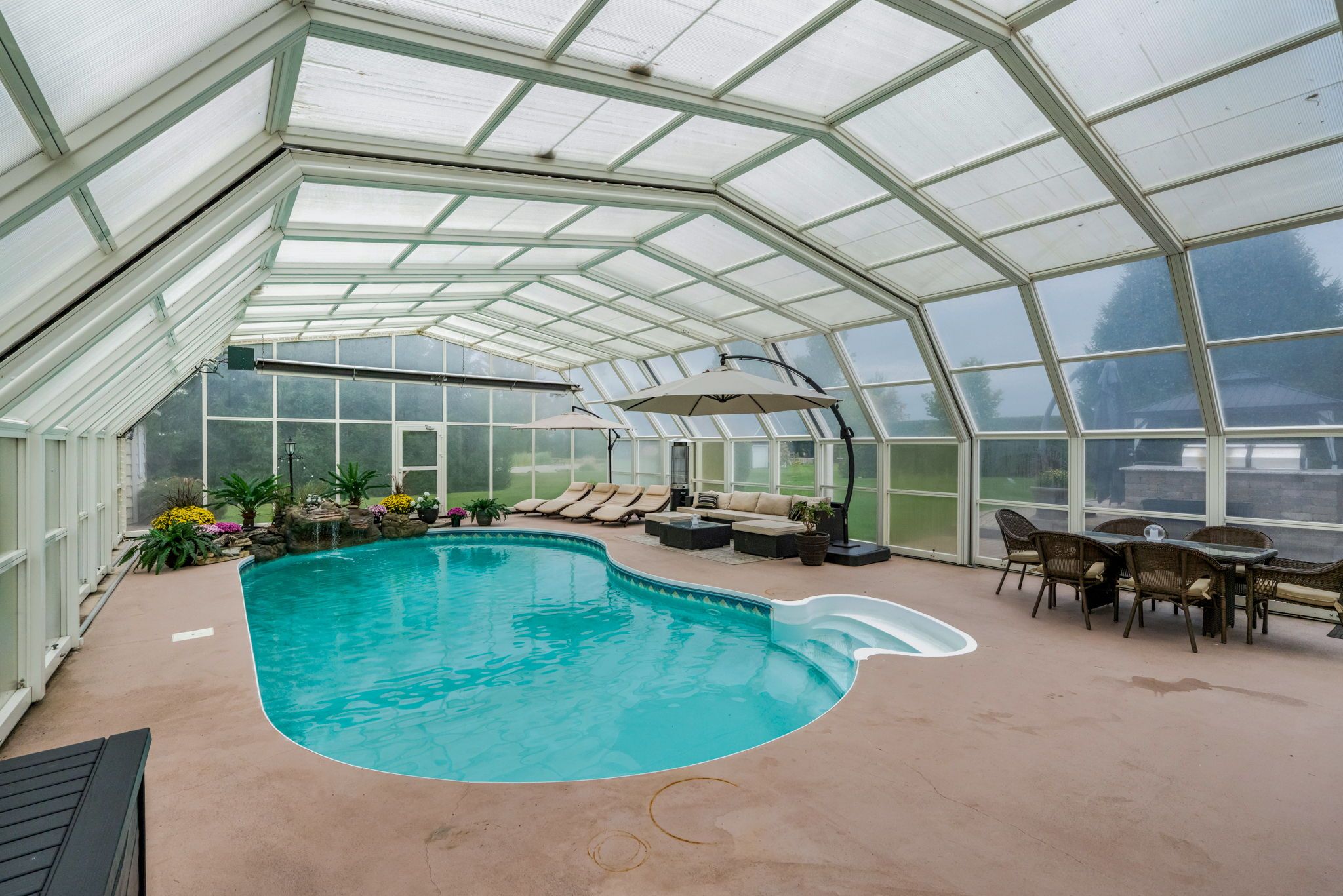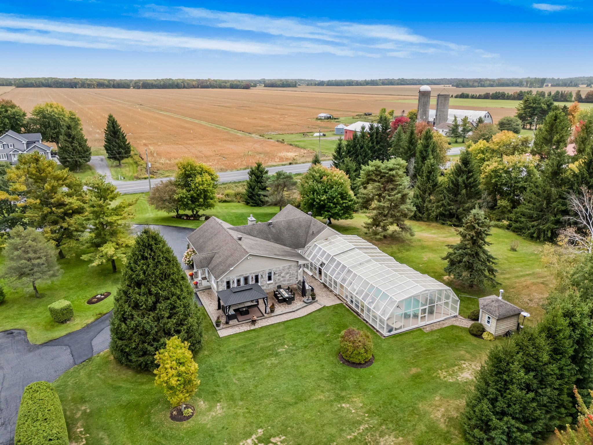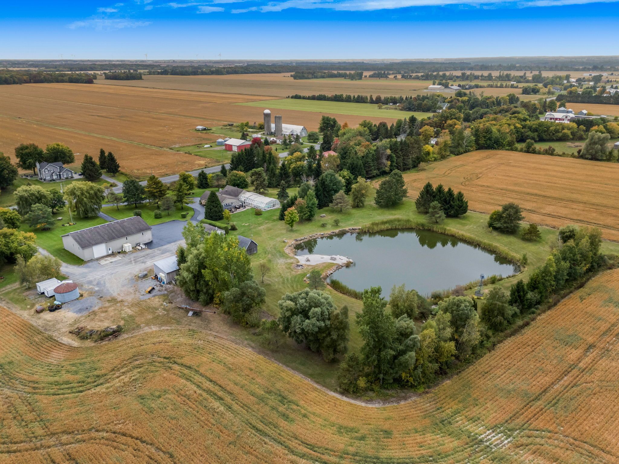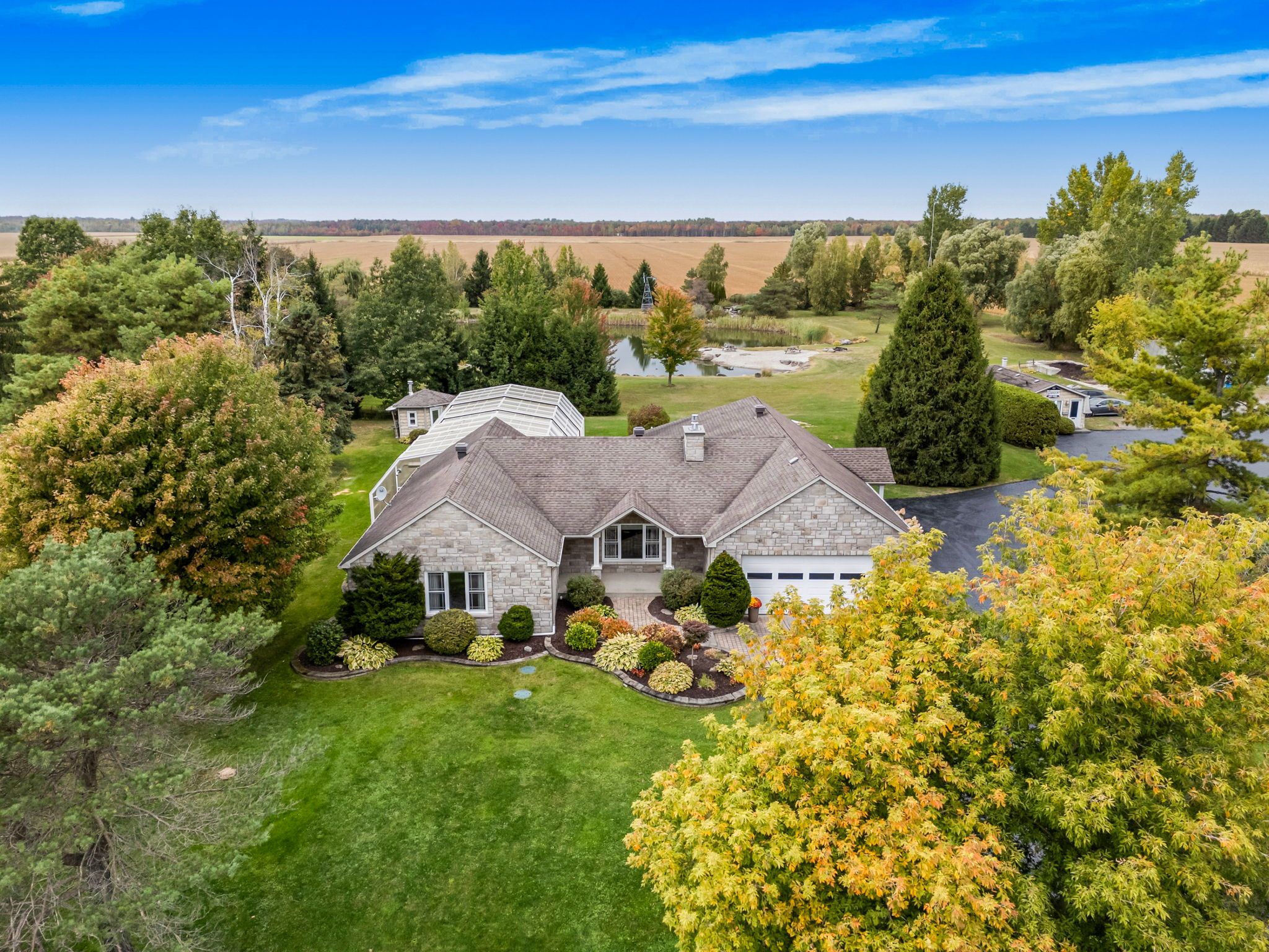 Welcome to this extraordinary estate offering over 6 acres of private countryside living with luxury finishes, extensive outdoor amenities, and exceptional spaces for both entertaining and hobbyists alike. Step inside to find an elegant open-concept main floor featuring a chef-inspired kitchen with rich wood cabinetry, high-end appliances, granite countertops, and a striking stone backsplash. The expansive island with seating flows seamlessly into the bright dining area, highlighted by a crystal chandelier and large windows overlooking the scenic grounds. The inviting living room boasts custom built-ins and a cozy natural gas fireplace-perfect for family gatherings. The home offers 4 bedrooms filled with natural light, stylish bathrooms with modern vanities, and a lower-level retreat complete with heated floors for year-round comfort. Outdoors, enjoy resort-style living with an all-season in-ground pool under a retractable enclosure, multiple lounge areas, and a peaceful private pond. For the hobbyist or entrepreneur, this property includes a 2,800 sq. Ft. Heated garage plus an additional 1,600 sq. Ft. Garage-ideal for car enthusiasts, a workshop, or storing recreational toys. Located just minutes from town amenities yet surrounded by nature, this estate combines luxury, functionality, and tranquility. This is more than a home-its a lifestyle. Serious inquiries only and must be pre-approved before scheduling a visit.