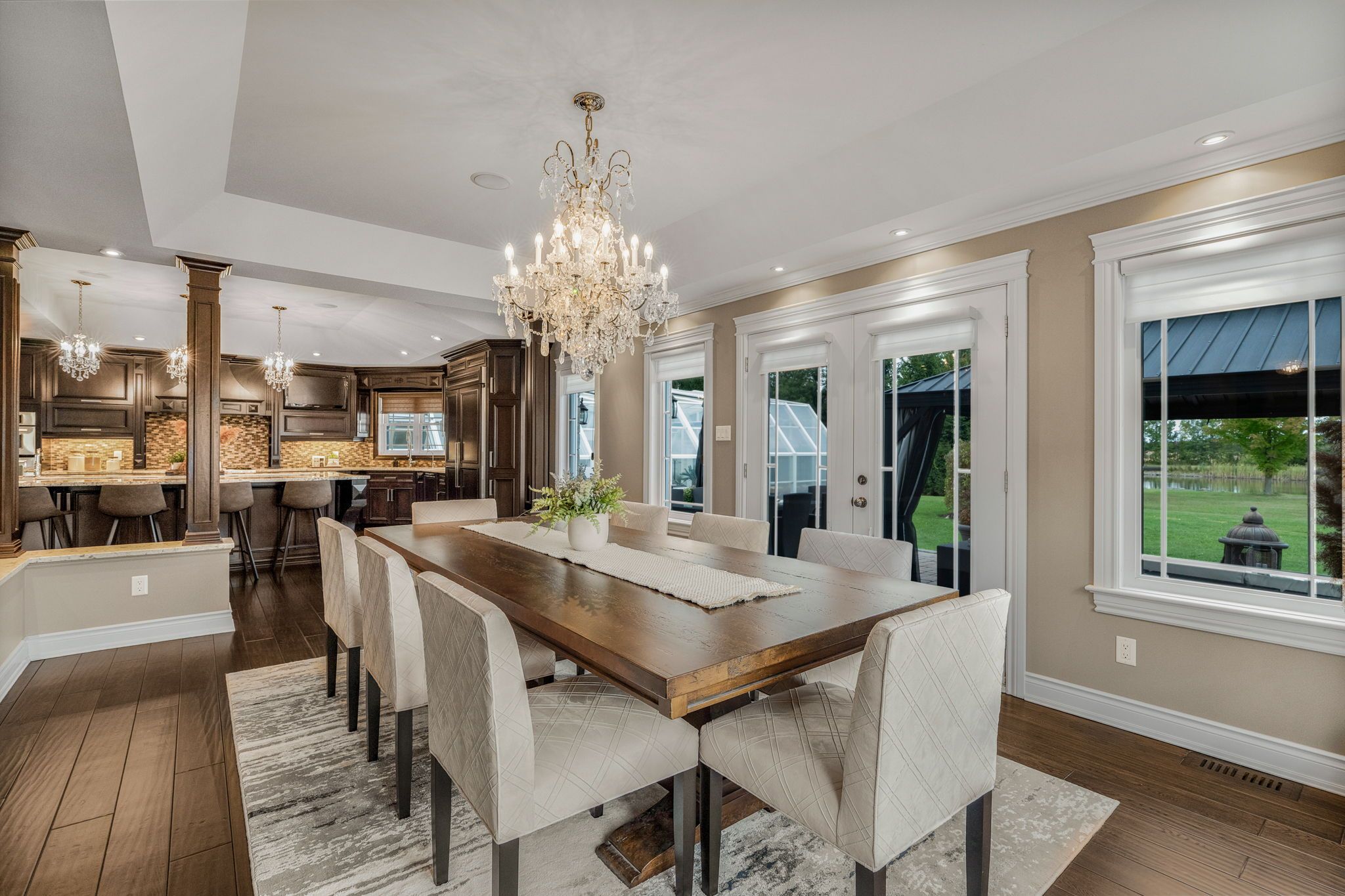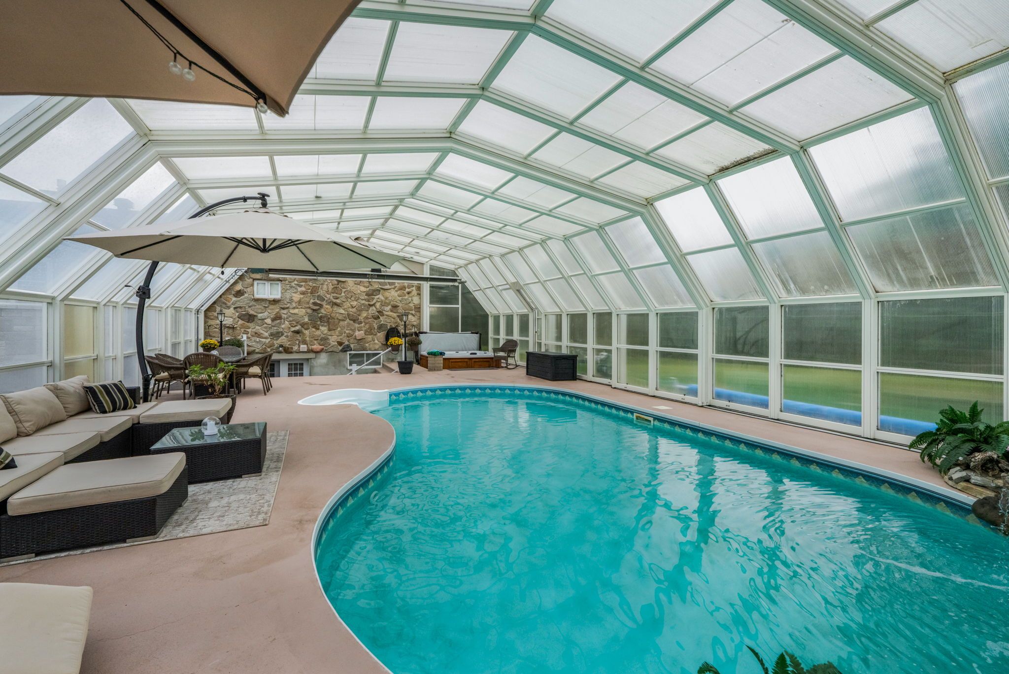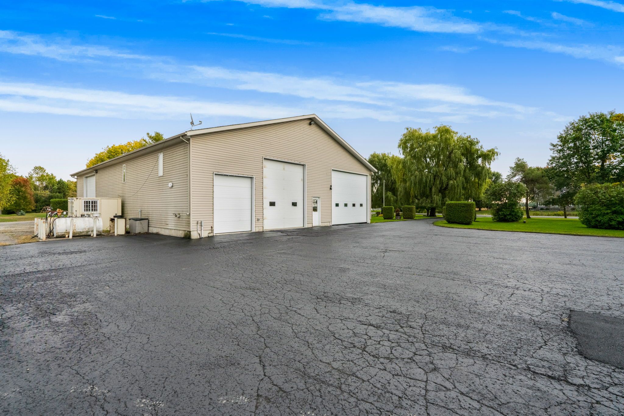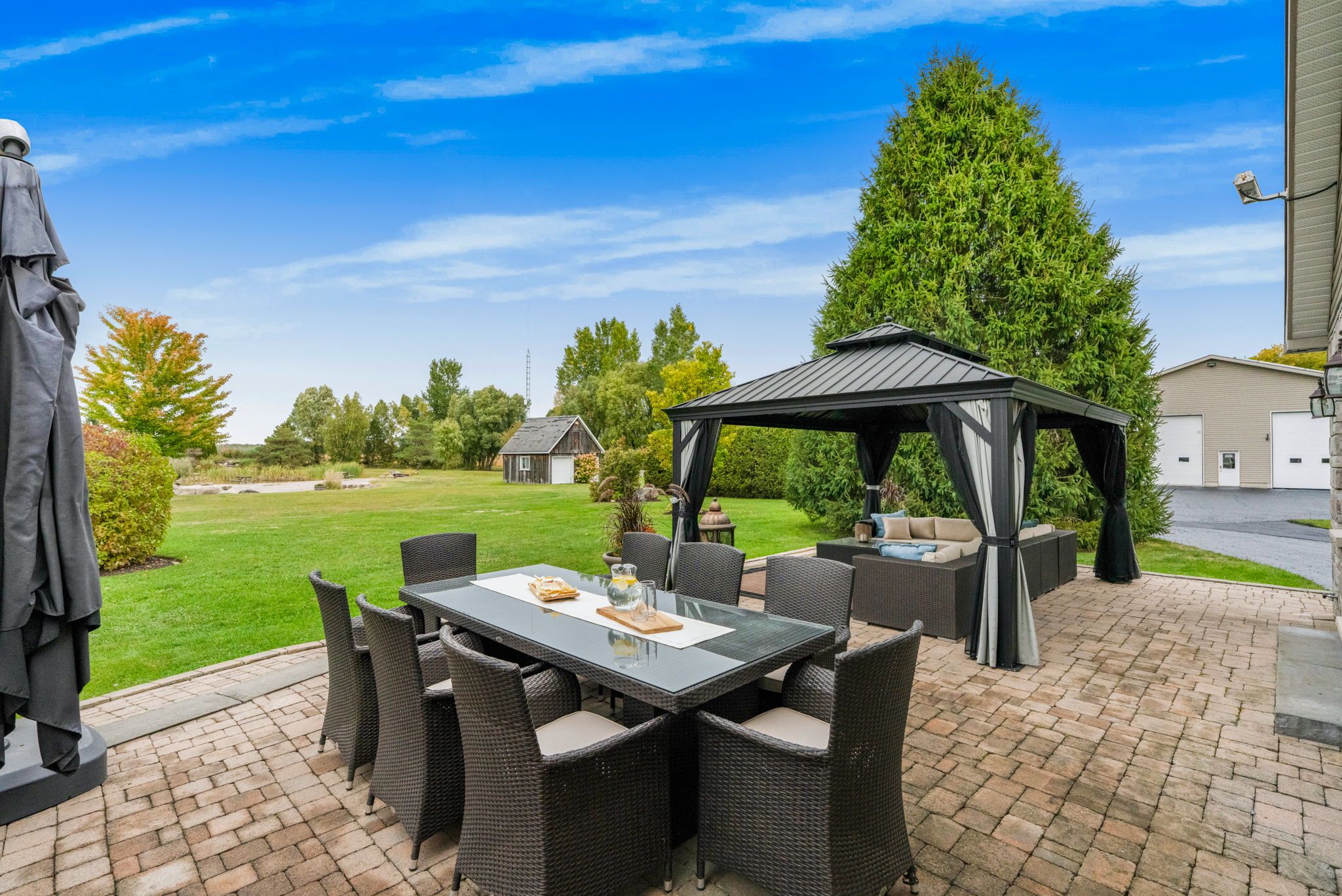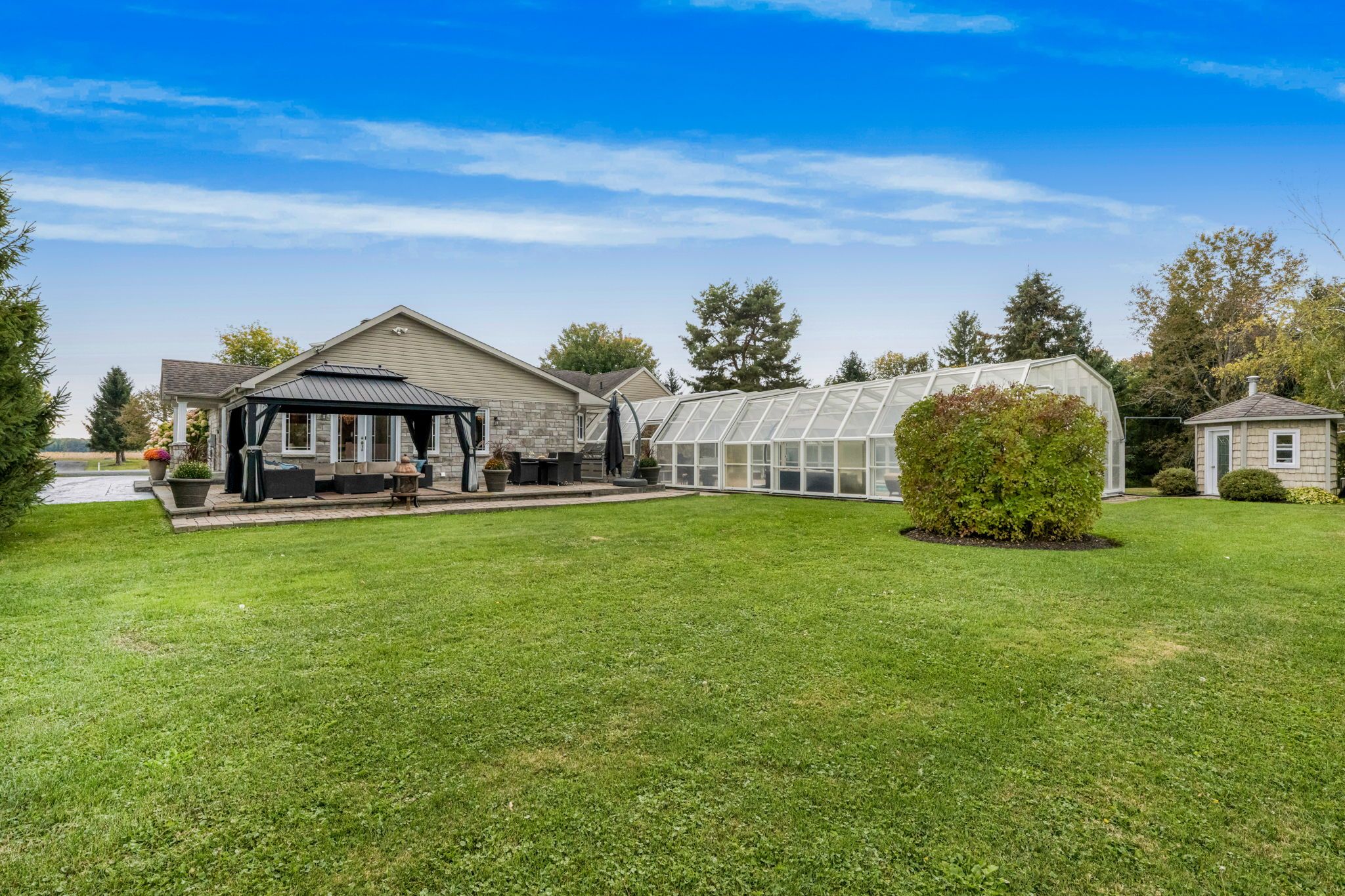 Welcome to this extraordinary estate offering over 6 acres of private countryside living with luxury finishes, extensive outdoor amenities, and exceptional spaces for both entertaining and hobbyists alike. Step inside to find an elegant open-concept main floor featuring a chef-inspired kitchen with rich wood cabinetry, high-end appliances, granite countertops, and a striking stone backsplash. The expansive island with seating flows seamlessly into the bright dining area, highlighted by a crystal chandelier and large windows overlooking the scenic grounds. The inviting living room boasts custom built-ins and a cozy natural gas fireplace-perfect for family gatherings. The home offers 4 bedrooms filled with natural light, stylish bathrooms with modern vanities, and a lower-level retreat complete with heated floors for year-round comfort. Outdoors, enjoy resort-style living with an all-season in-ground pool under a retractable enclosure, multiple lounge areas, and a peaceful private pond. For the hobbyist or entrepreneur, this property includes a 2,800 sq. Ft. Heated garage plus an additional 1,600 sq. Ft. Garage-ideal for car enthusiasts, a workshop, or storing recreational toys. Located just minutes from town amenities yet surrounded by nature, this estate combines luxury, functionality, and tranquility. This is more than a home-its a lifestyle. Serious inquiries only and must be pre-approved before scheduling a visit.