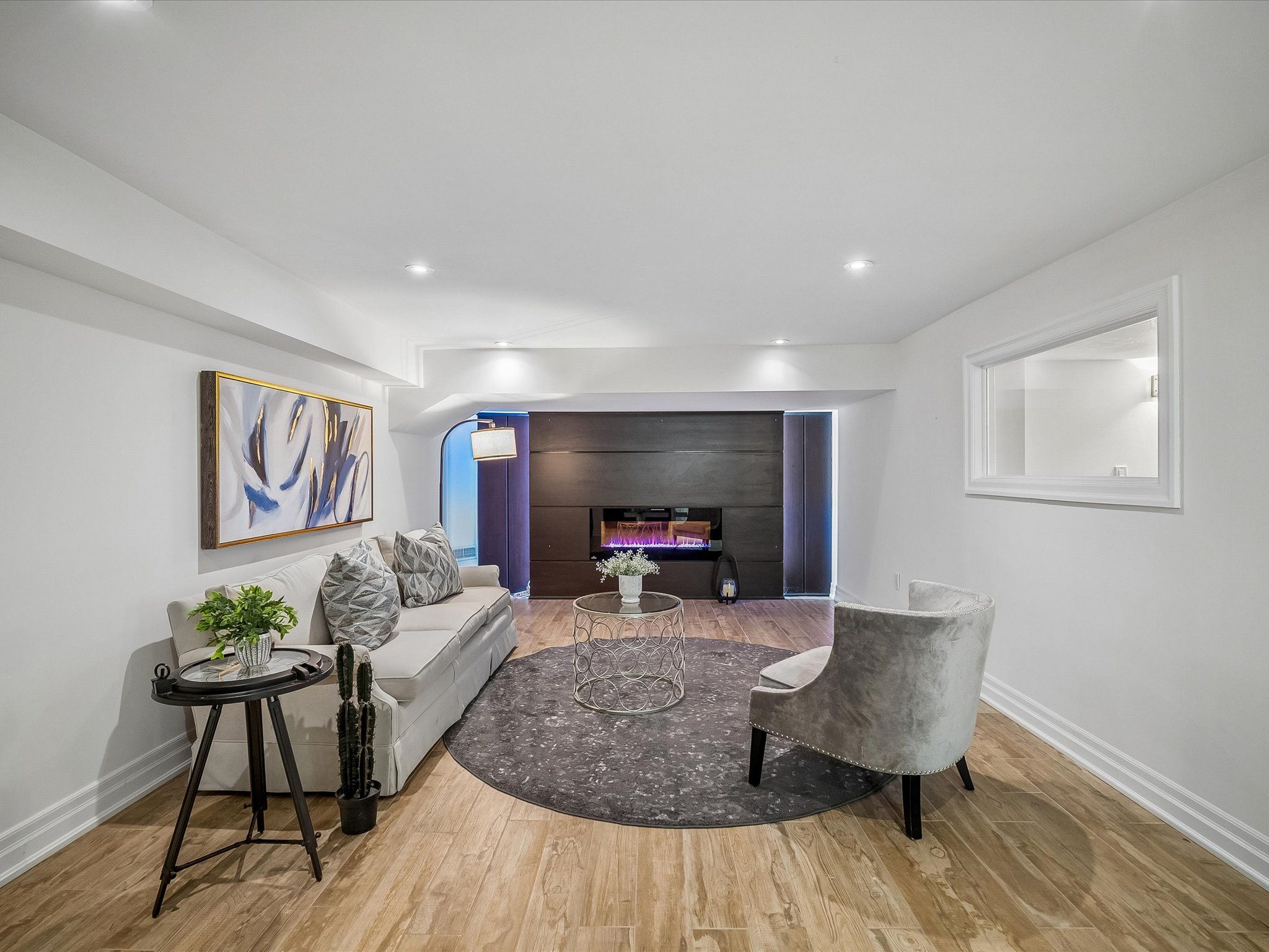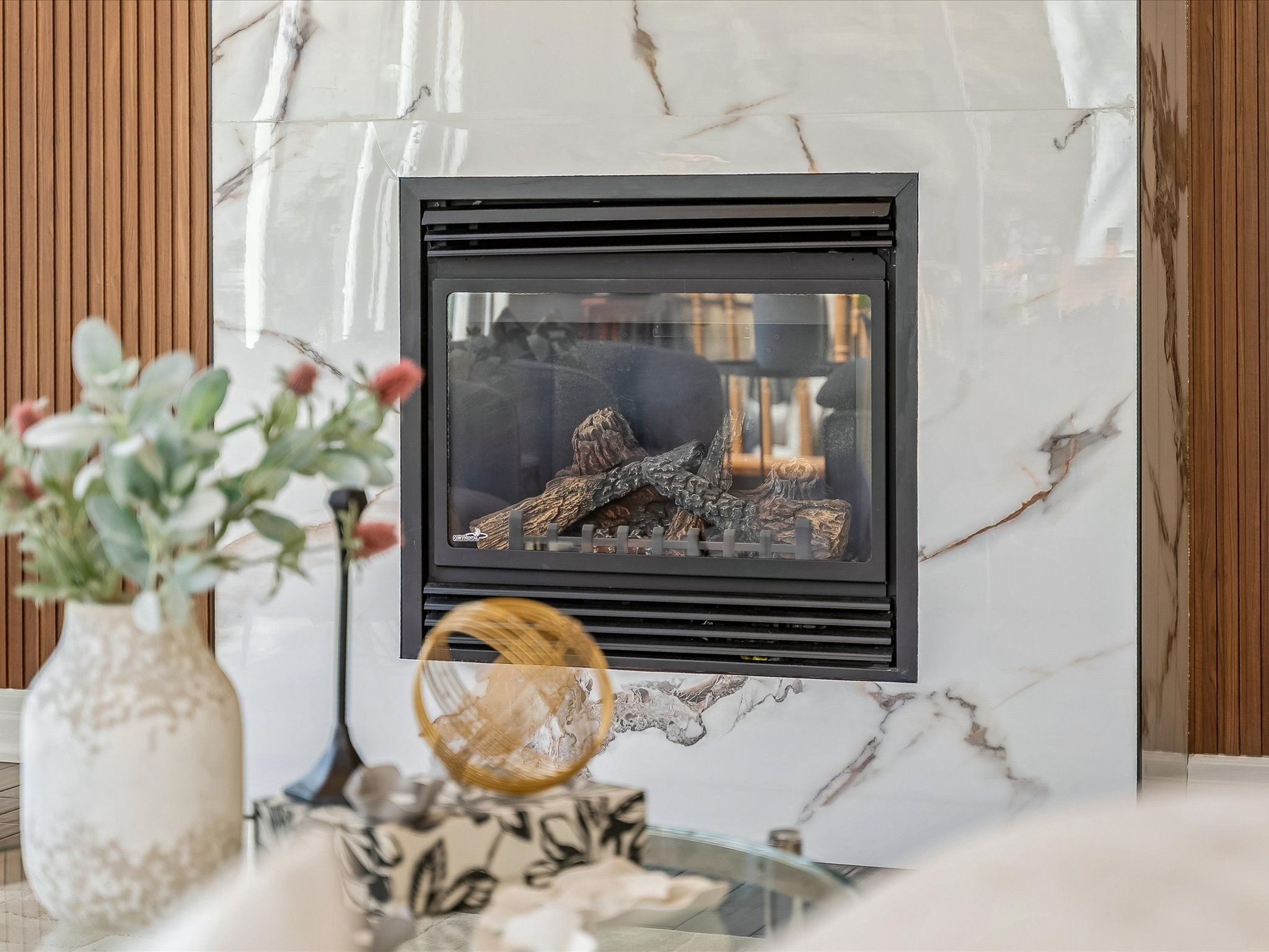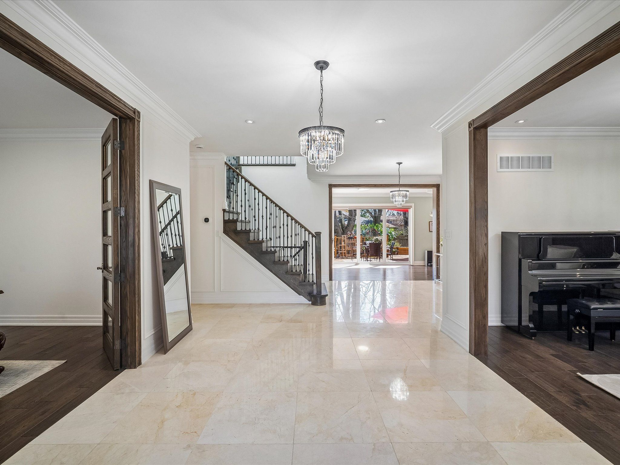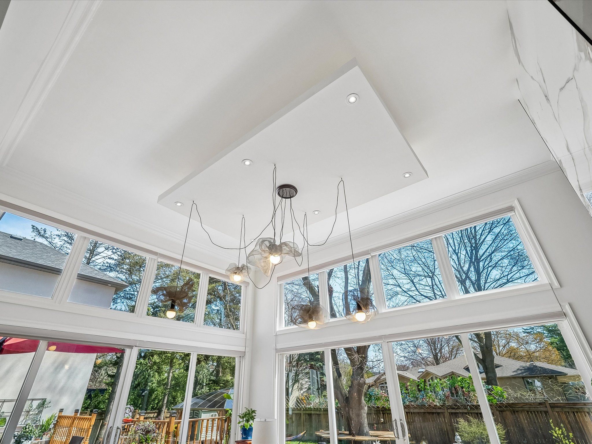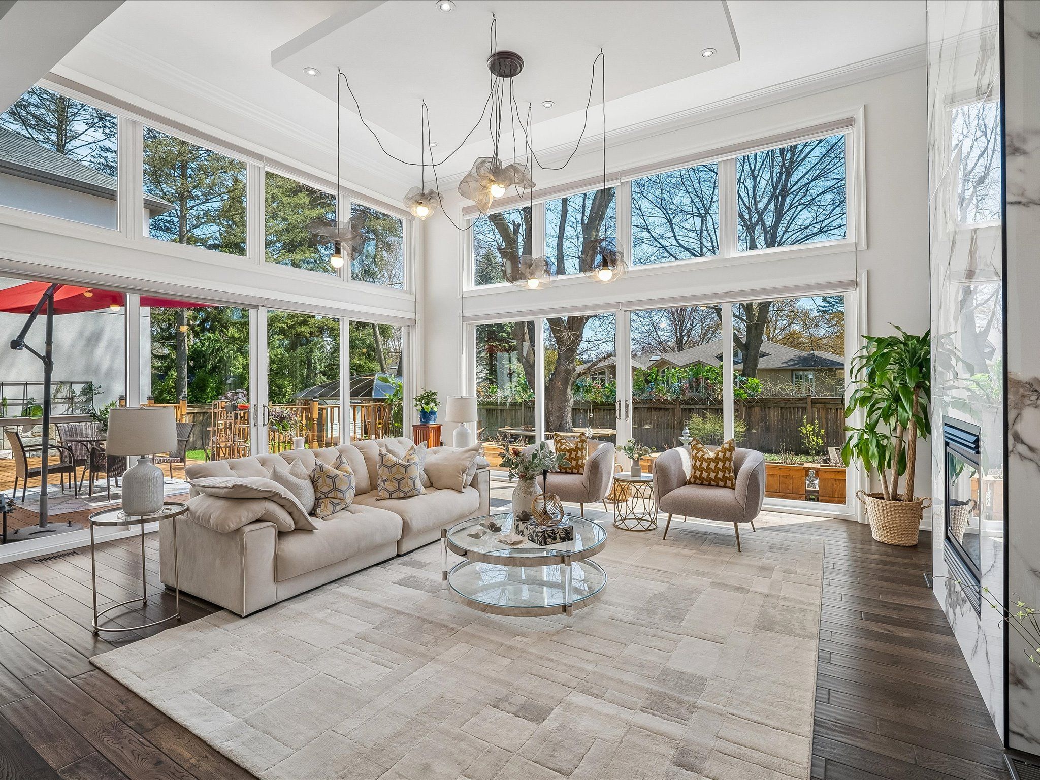 • Impressive double-height family room with large windows and marble fireplace.