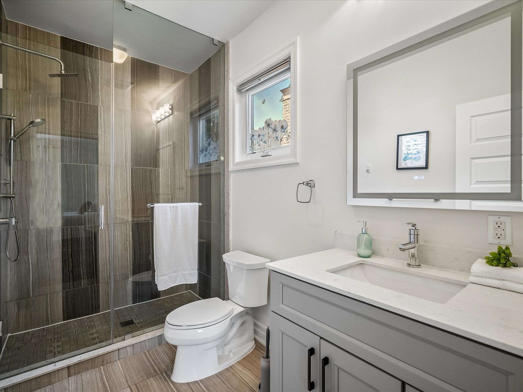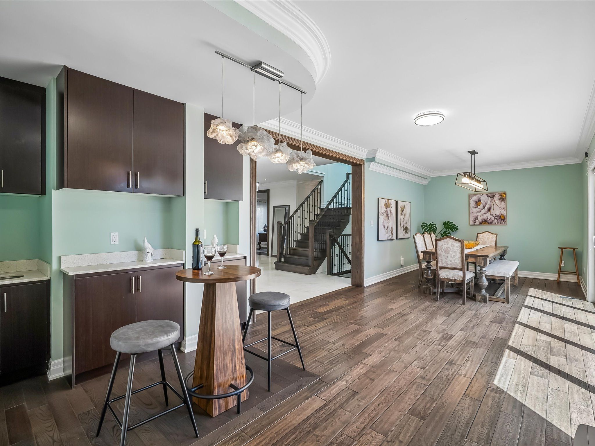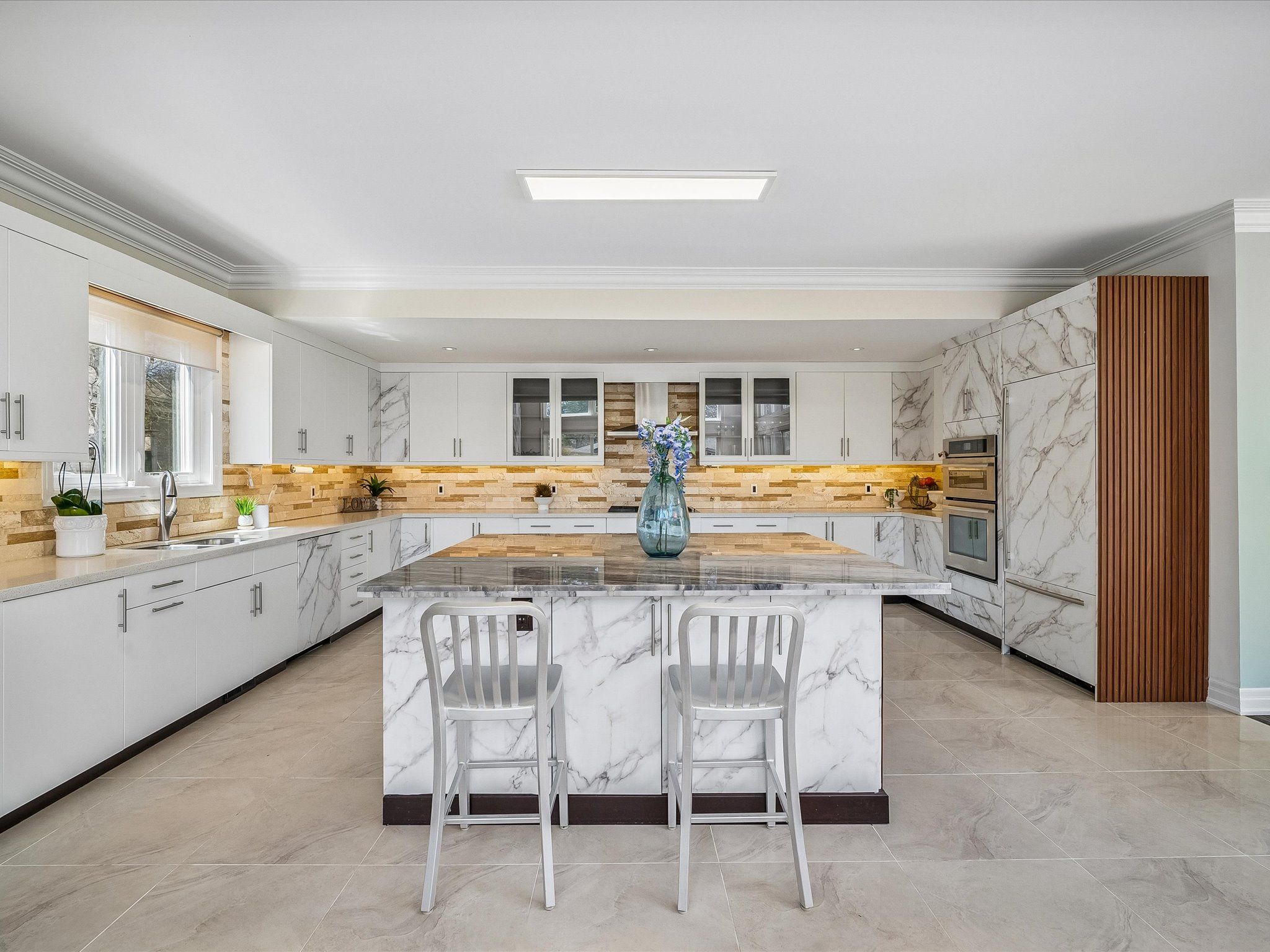 Nestled in the heart of highly sought-after morrison, this exceptional custom-built executive home offers over 4,403sf above grade(as per mpac) or nearly 6,000 sf of refined luxury living space, set on a rare 100 x 150 ft south-facing premium lot. Thoughtfully designed with a contemporary aesthetic and impeccable craftsmanship, this residence seamlessly blends elegance with modern functionality. Featuring a versatile layout with 2 bedrooms on the main level and 2 on the upper level, all spacious and boasts its own private ensuites and spacious walk-in closets, offering ultimate comfort and privacy. The home showcases rich hardwood flooring throughout, complemented by custom slatted wood accent walls, extensive millwork, crown mouldings, and soaring ceilings that elevate the sense of space and sophistication. The heart of the home is the breathtaking double-height family room, highlighted by floor-to-ceiling windows, a striking book-matched calacatta marble fireplace, and a dramatic walnut slatted feature wall-creating a true architectural statement. Walk out to a 650 sq. Ft. Oversized deck, perfect for seamless indoor-outdoor entertaining. The designer kitchen is a chef's dream, featuring premium cabinetry, granite countertops, and top-of-the-line appliances, flowing effortlessly into the principal living spaces. A dedicated main floor office adds convenience for modern living. The professionally finished lower level offers expansive recreation and entertainment areas, ideal for family gatherings or hosting guests. Outdoors, enjoy beautifully landscaped front and rear gardens with a full sprinkler system, interlocking stonework, and a private backyard retreat bathed in southern sunlight. Located just steps to top-ranked schools (oakville trafalgar high school, maple grove public school) and the lake, parks, and downtown oakville, this home represents a rare opportunity in one of oakville's most prestigious enclaves.