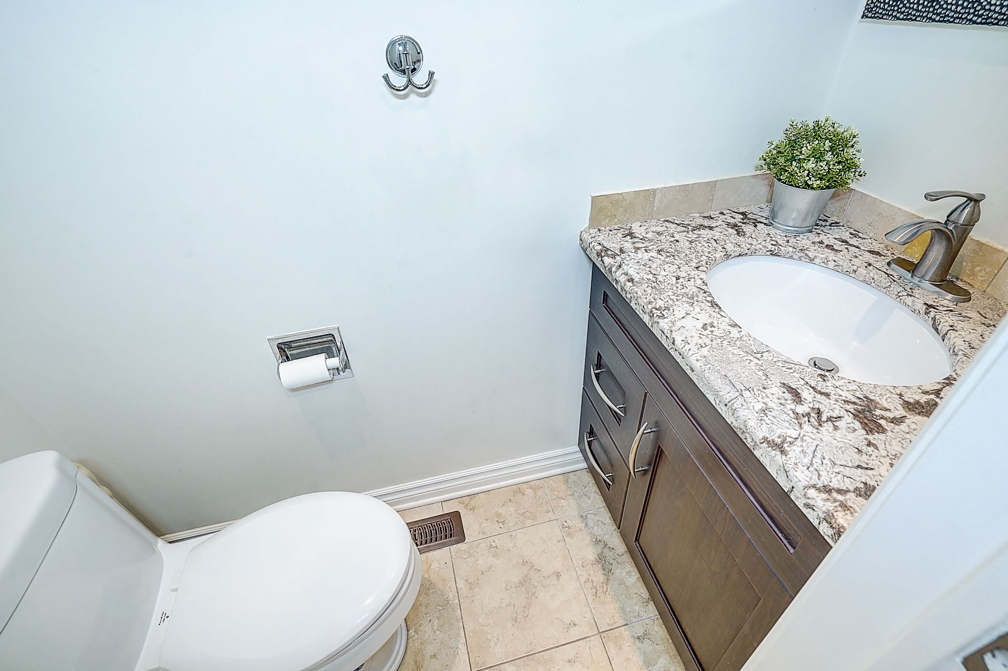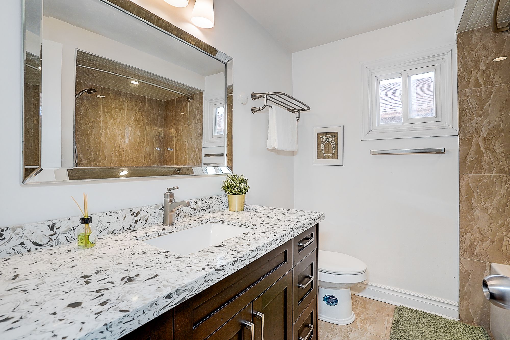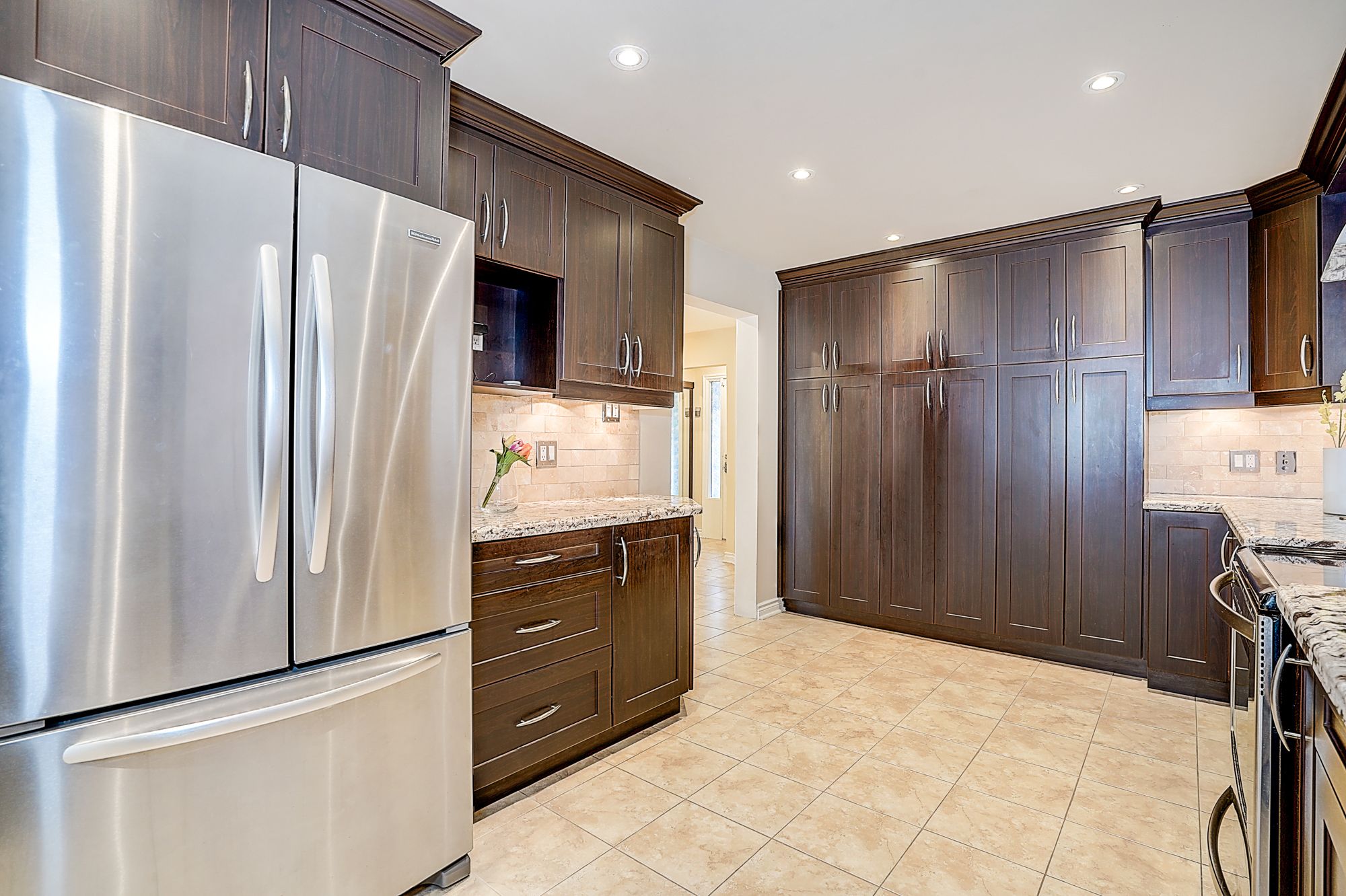 • Modern kitchen features granite counters and porcelain tiles.