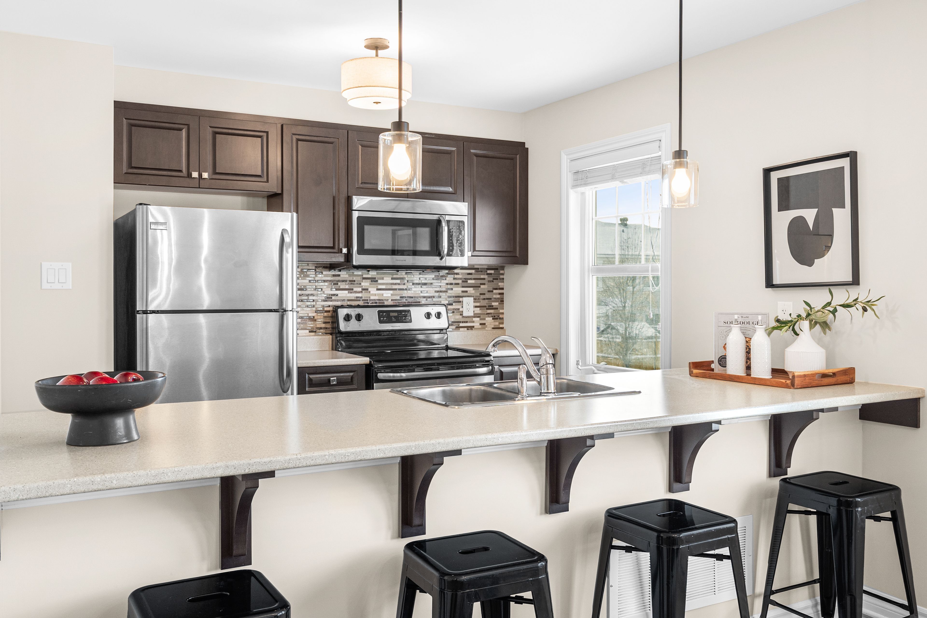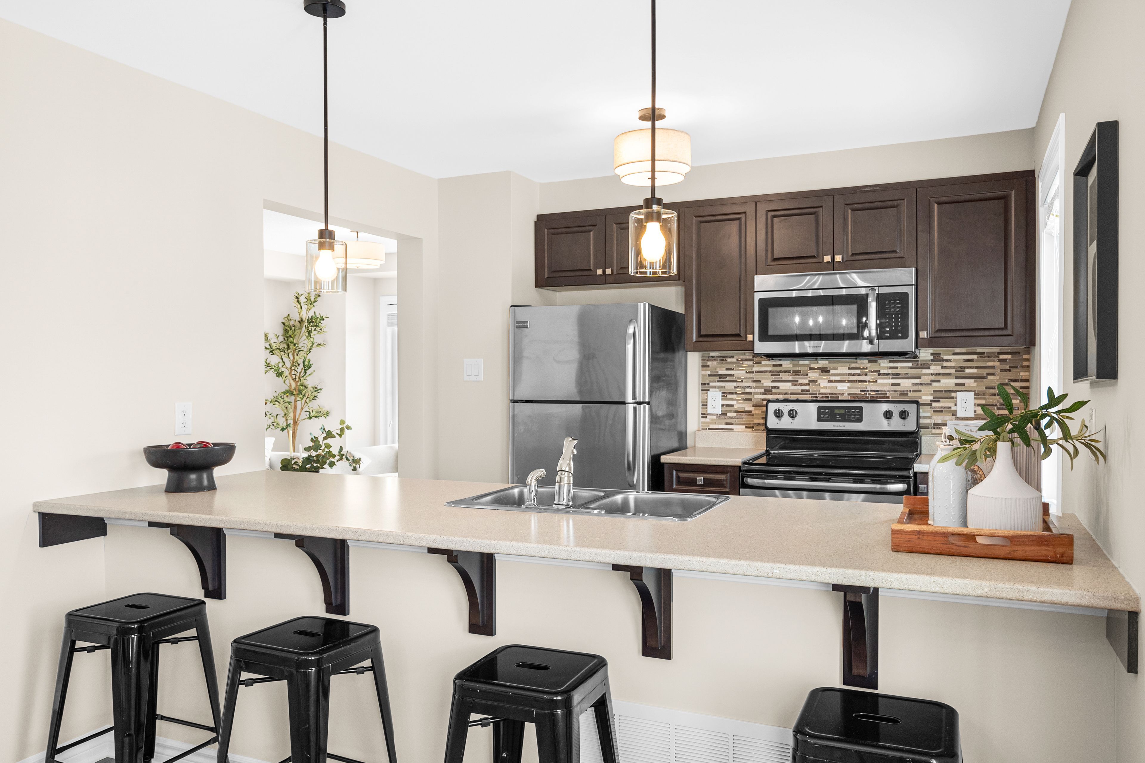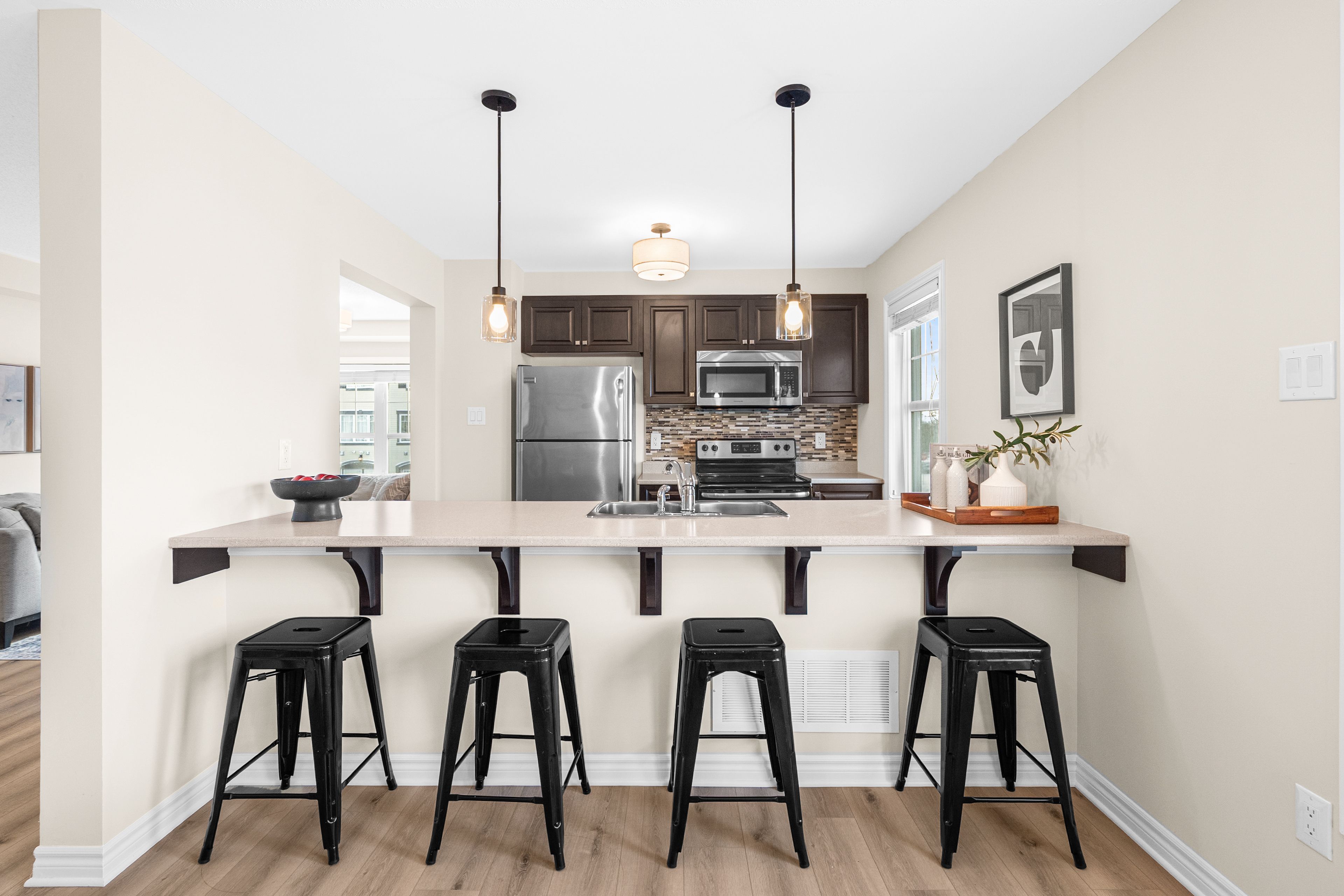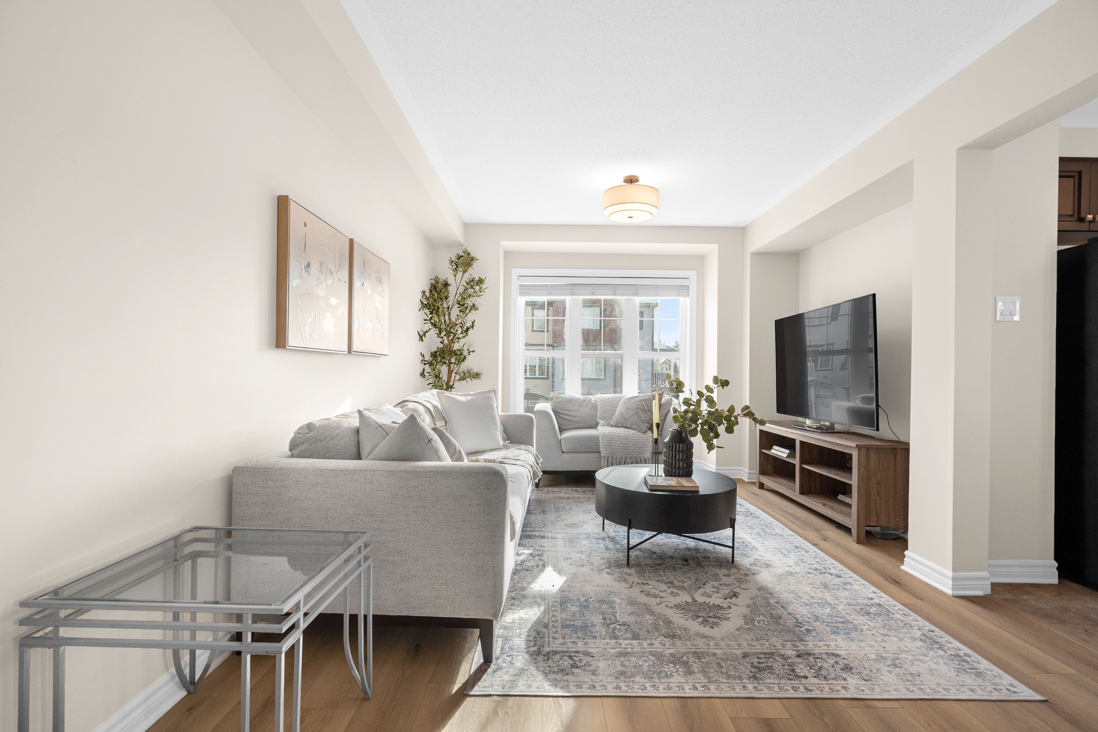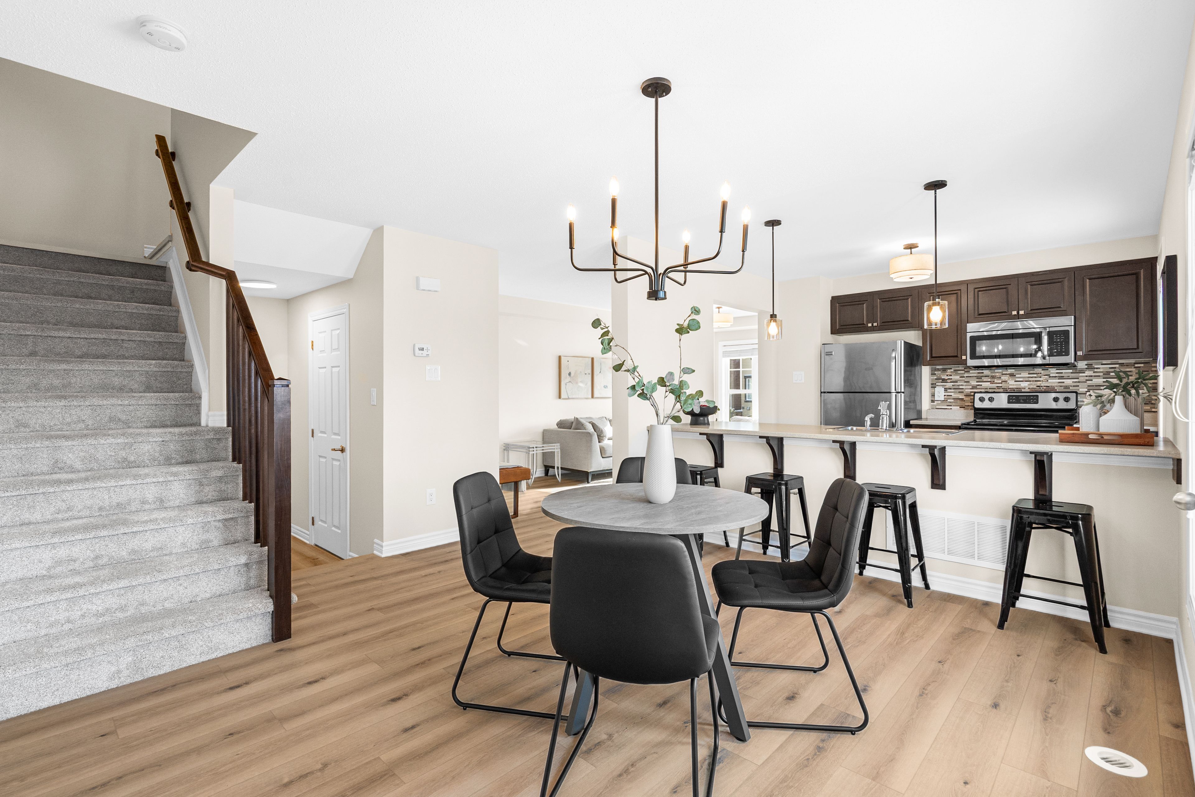 • Bright open living space with modern kitchen and stainless steel appliances.