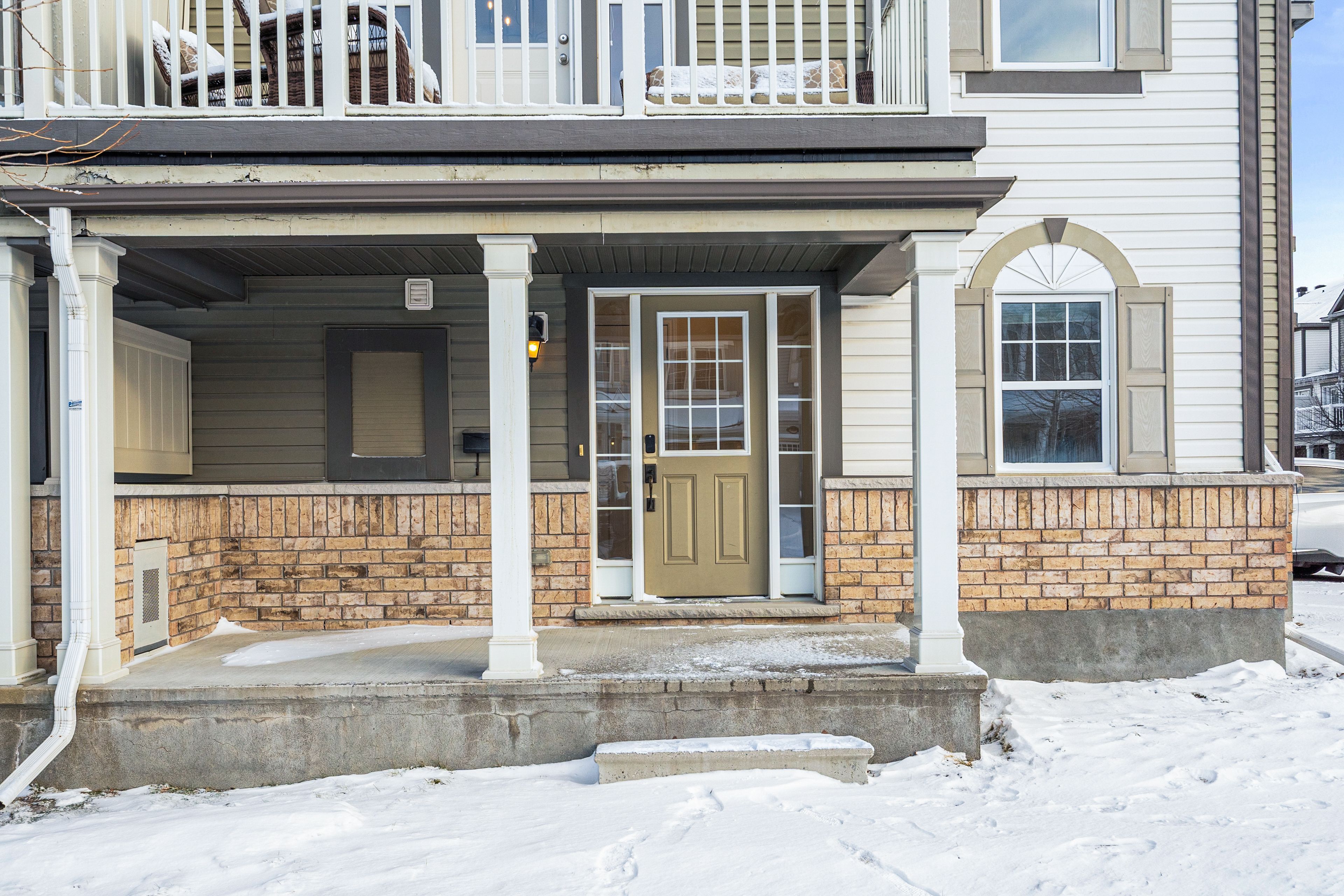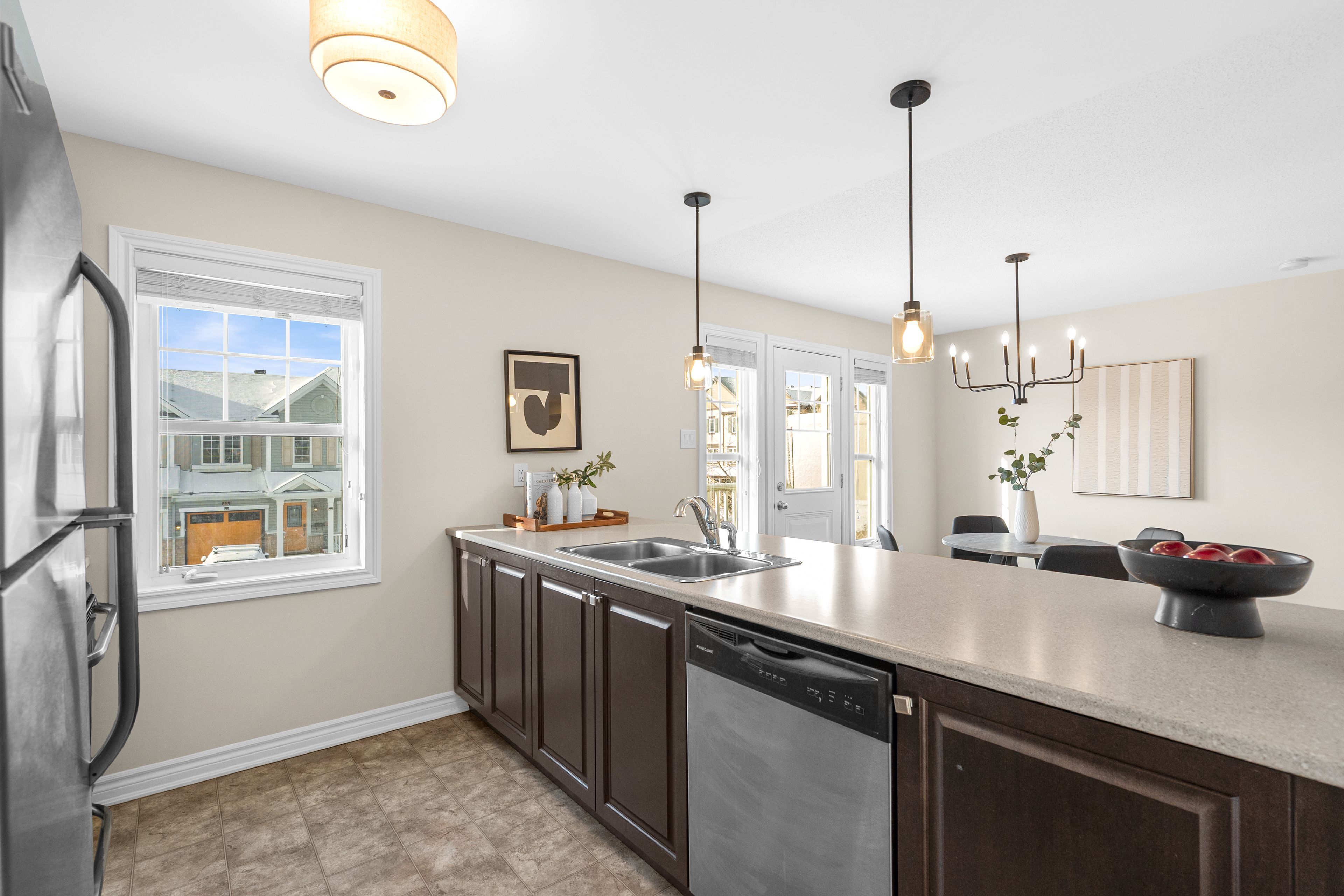 Beautifully maintained and well-appointed 3-storey end-unit townhome offering 2 bedrooms and 2. 5 bathrooms. Welcomed by a charming front porch, the main level features a versatile office space - perfect for working from home - along with convenient laundry space. The second level boasts a bright, open living space designed for both comfort and entertaining. The modern kitchen is equipped with stainless steel appliances, a large island, and flows seamlessly into the dining area with access to a private balcony. A spacious living room and a convenient powder room complete this level. The upper floor offers a thoughtfully designed layout with a generous primary bedroom featuring a walk-in closet and a private 3-piece ensuite. An additional well-sized bedroom and a full bathroom complete the level. Recent updates (2026) include furnace servicing, new flooring and carpets, professional painting throughout, and updated lighting. Ideally located close to schools and parks, this property is perfect for professionals, small families, or investors alike.