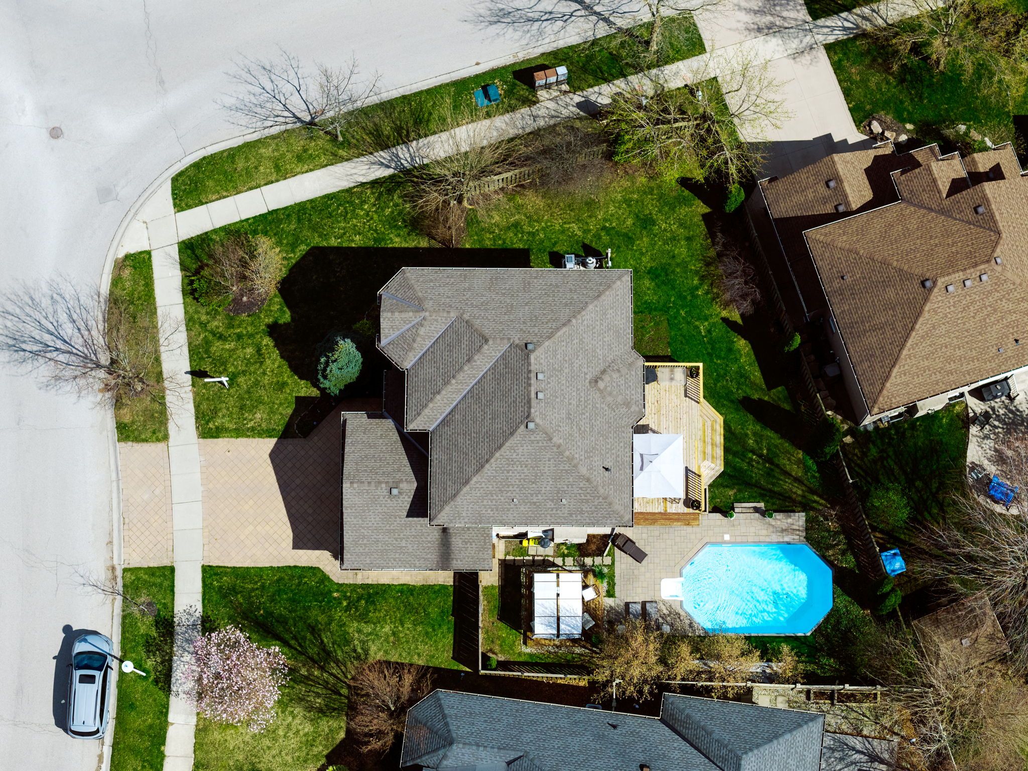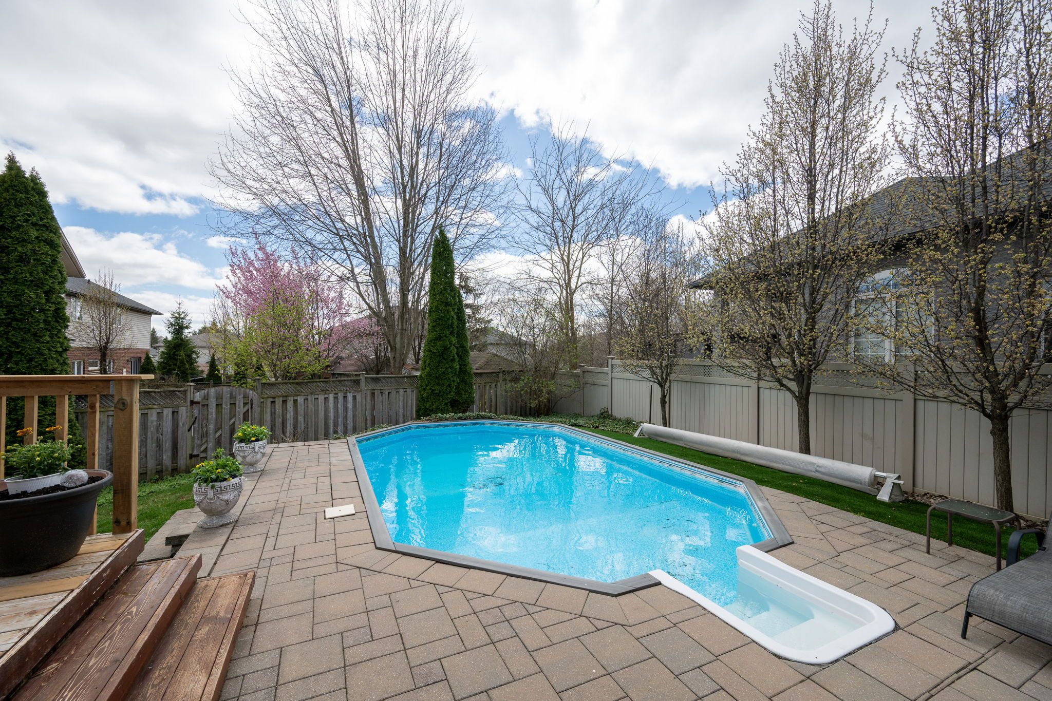 • Private backyard with pool, deck, patio, and mature gardens.
