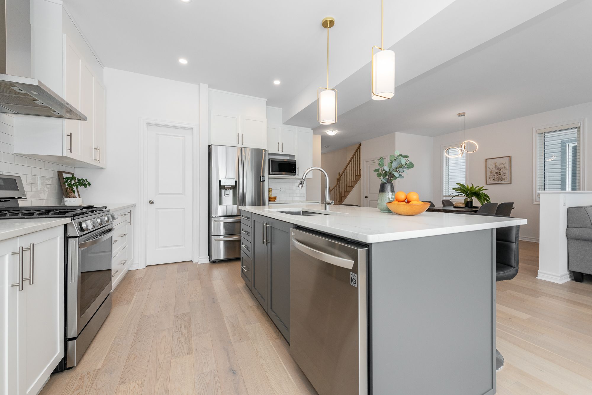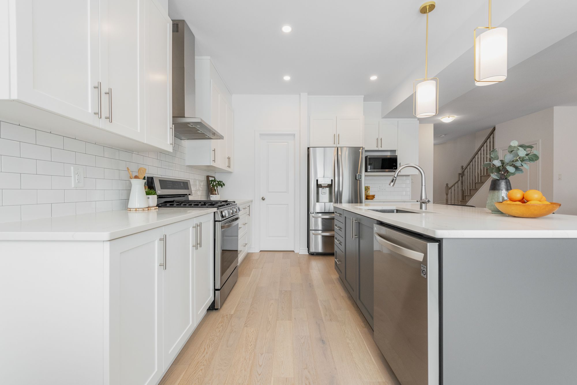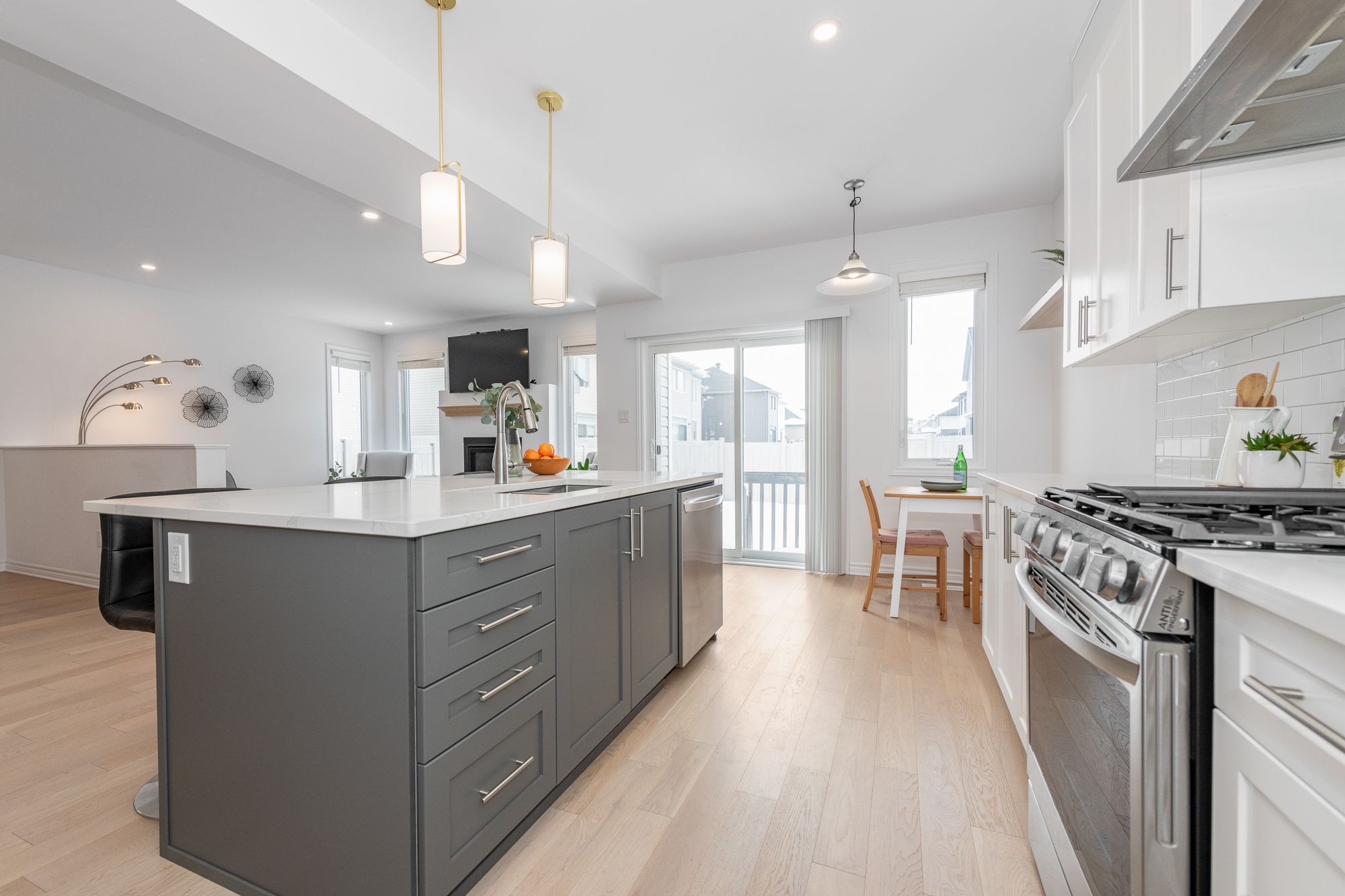 • Modern kitchen featuring quartz island, gas stove, and stainless steel appliances.