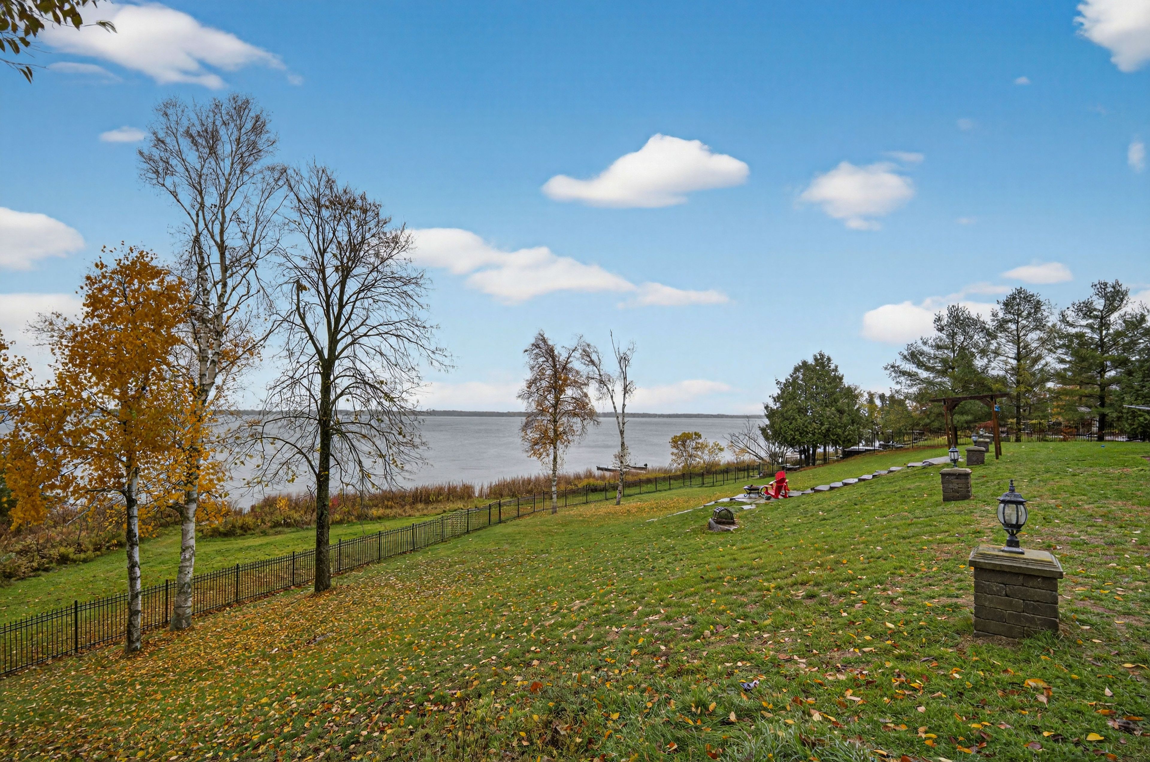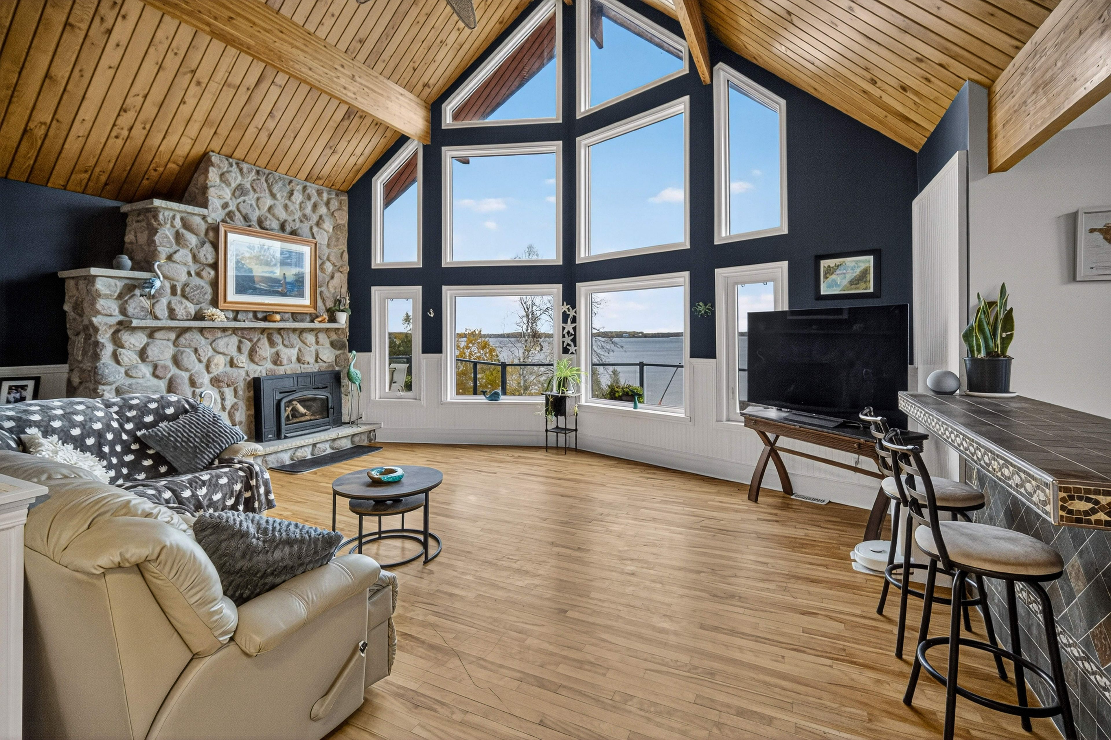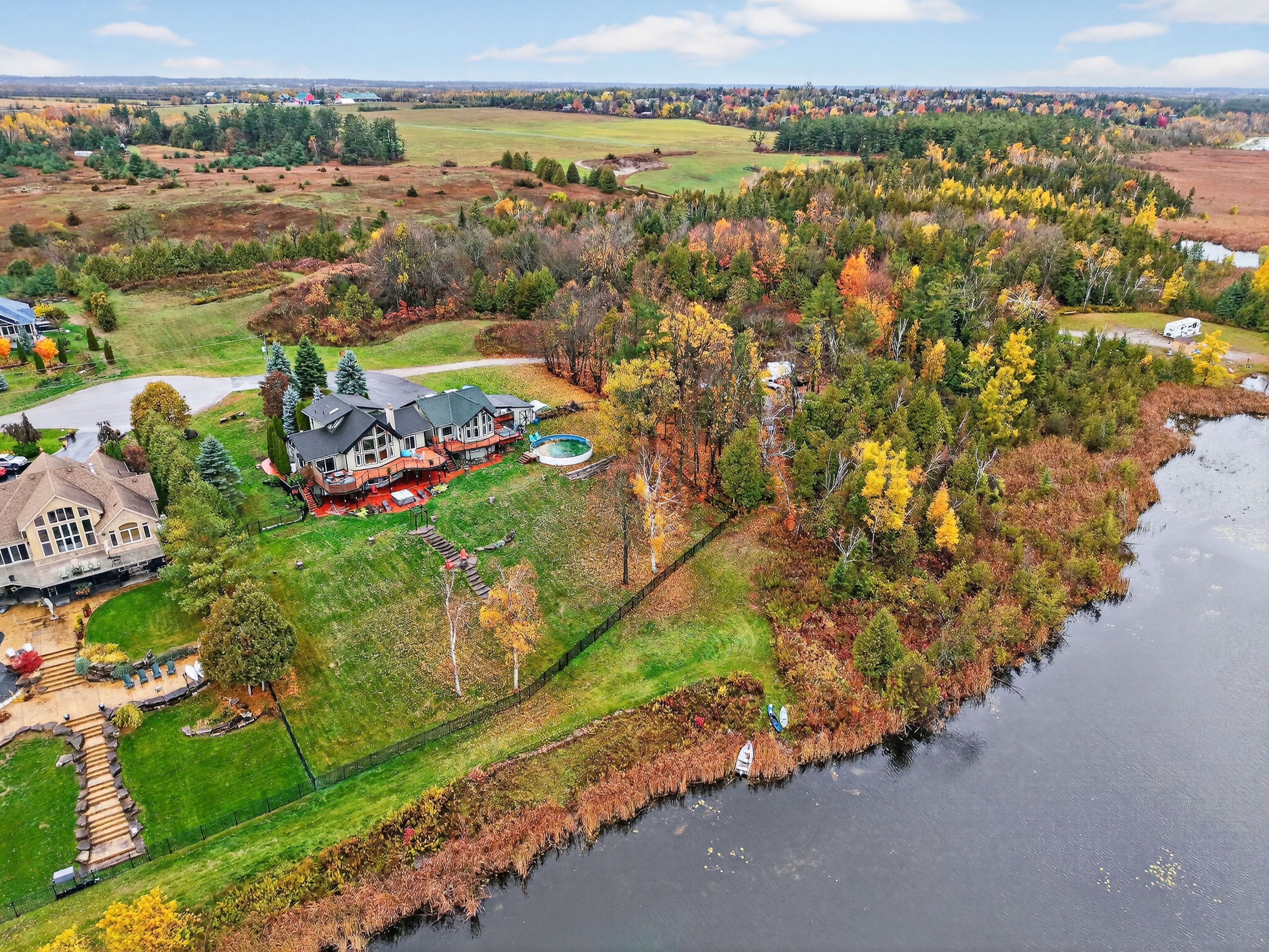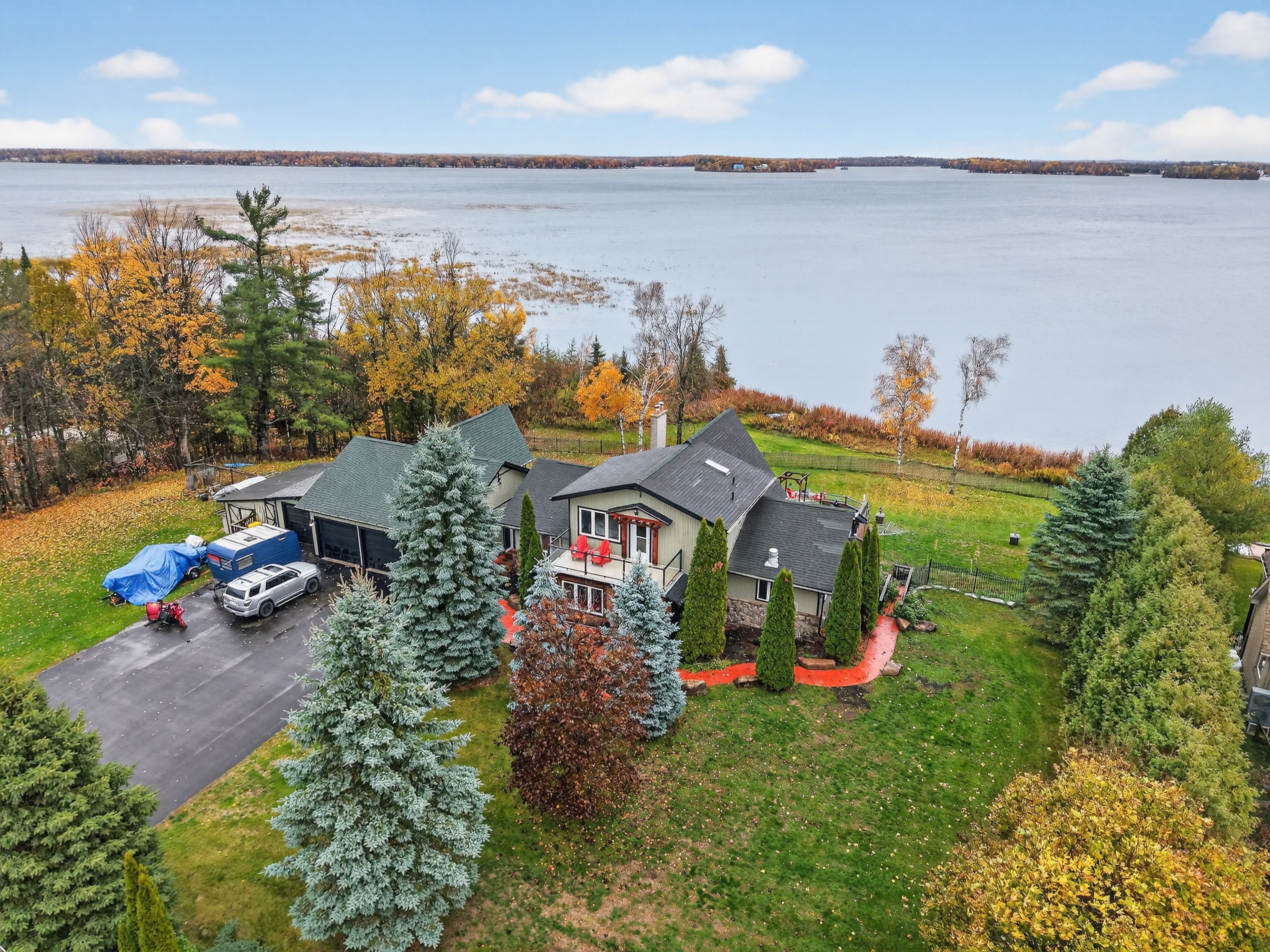 Welcome to 151 peller court, an exceptional custom-built estate in the prestigious rolling hills estates community, just minutes south of bobcaygeon on pigeon lake-part of the renowned trent-severn waterway. Nestled on a private 4. 8-acre lot surrounded by mature trees, this stunning property offers unparalleled privacy & breathtaking sunrise views over the lake. Boasting over 3,200 sq. Ft. Of beautifully finished living space across three levels, plus a separate 359 sq. Ft. In-law suite, this home is designed for both luxurious living & effortless entertaining. Open-concept main floor features a chef's dream kitchen with high-end appliances, abundant wood cabinetry & a large central island, all flowing seamlessly to an expansive deck overlooking the lake. The kitchen opens into a spectacular dining & living area highlighted by soaring cathedral ceilings, rich hardwood flooring, a striking stone fireplace & floor-to-ceiling windows that capture incredible lake views. The spacious primary suite offers a beautiful en-suite & separate soaker tub room as well as a private balcony-perfect for enjoying peaceful sunsets-while three additional bedrooms & three bathrooms provide ample space for family & guests. The fully finished lower level is an entertainer's dream, complete with two large rec rooms, a stone fireplace, wet bar & multiple walkouts to a lower patio with serene lake views. Outdoors, enjoy a beautifully landscaped setting with a fenced area ideal for children & pets, plus install your own dock on pigeon lake. The property also features an oversized detached triple-car garage with a paved driveway, a fourth bay workshop & multiple outbuildings for added functionality. Ownership includes a 1/17th share in the rolling hills estates association, granting access to the private boat launch, docking facilities, gazebo waterfront strip. Located on a municipally maintained road, this is a rare opportunity to enjoy luxury, privacy, and waterfront living at its finest.