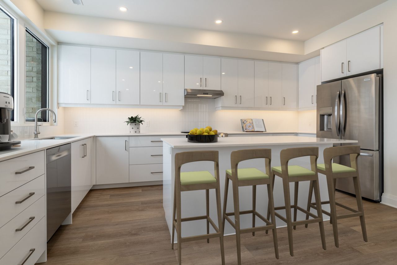 • Spacious kitchen with stainless steel appliances and under-cabinet lighting.