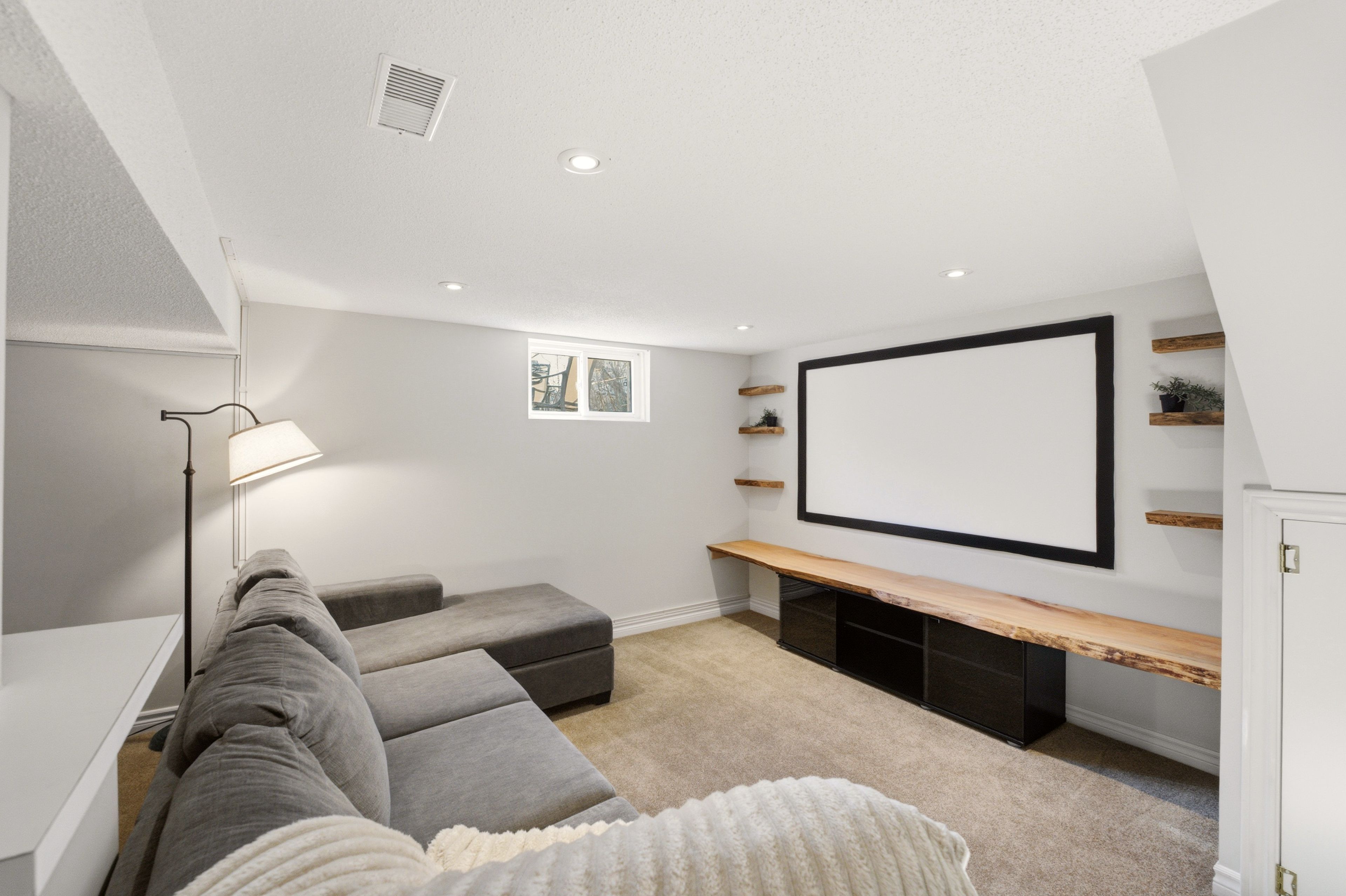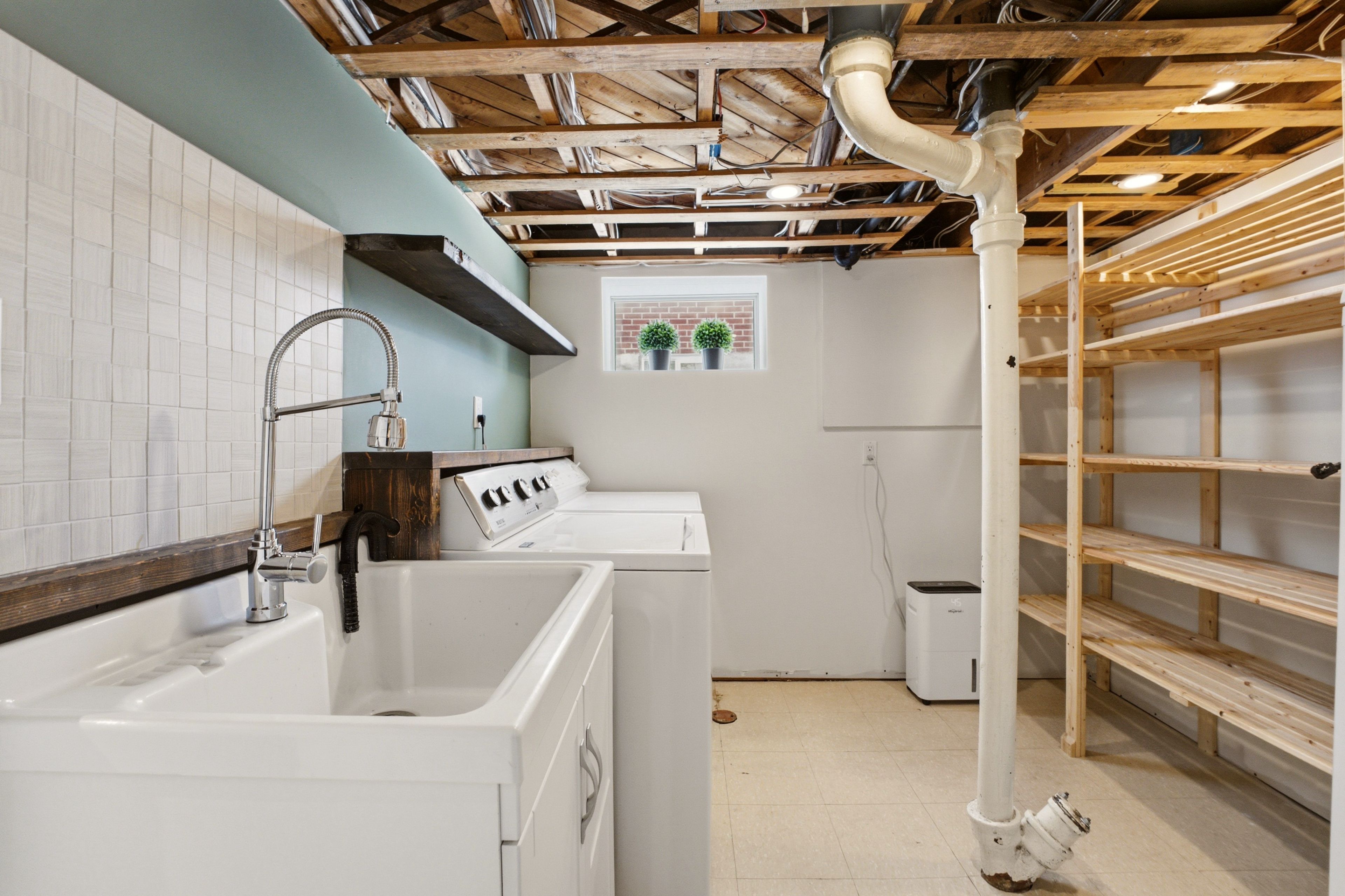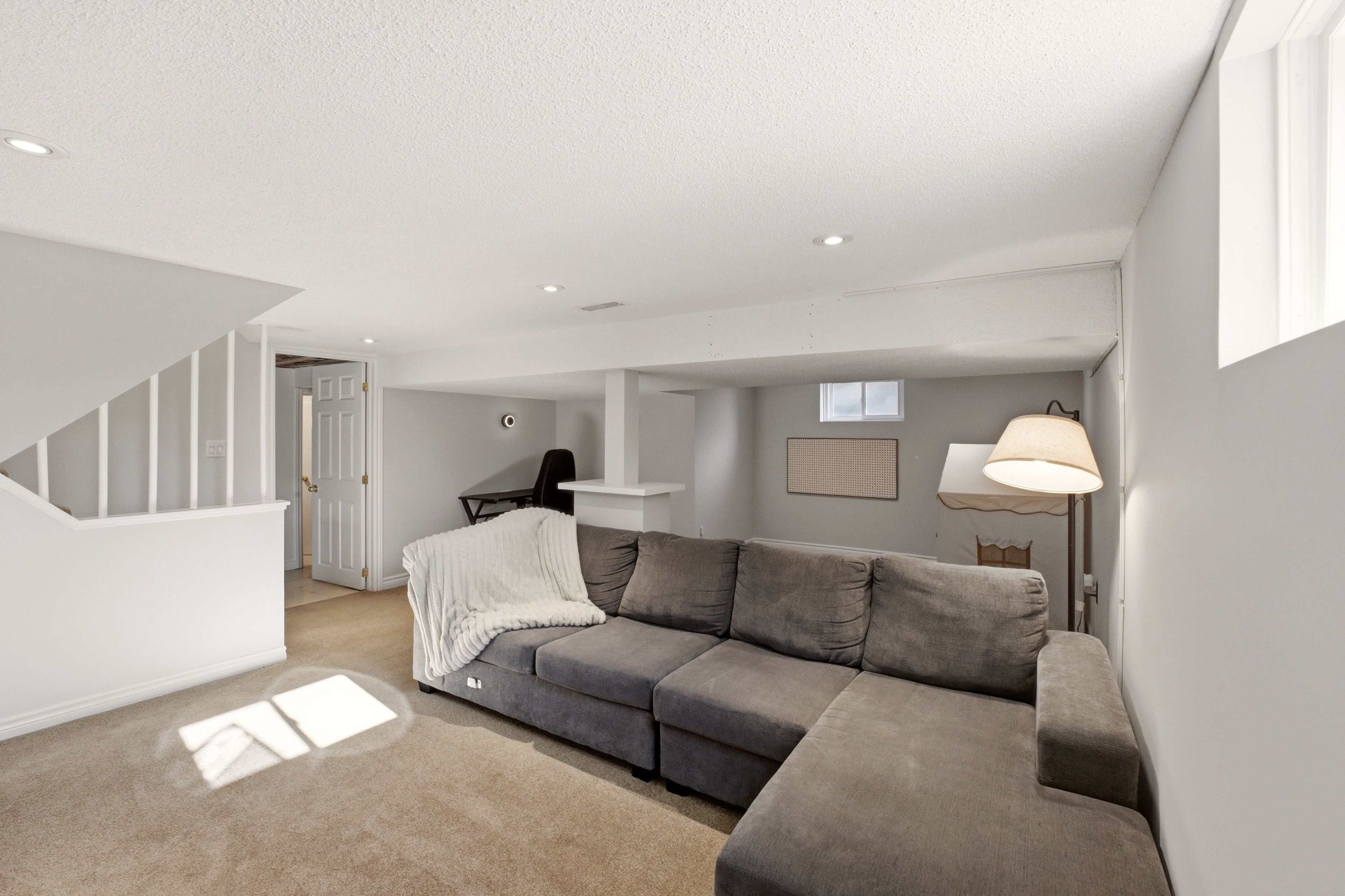 • Finished basement includes recreation room, laundry area, and extra storage.
