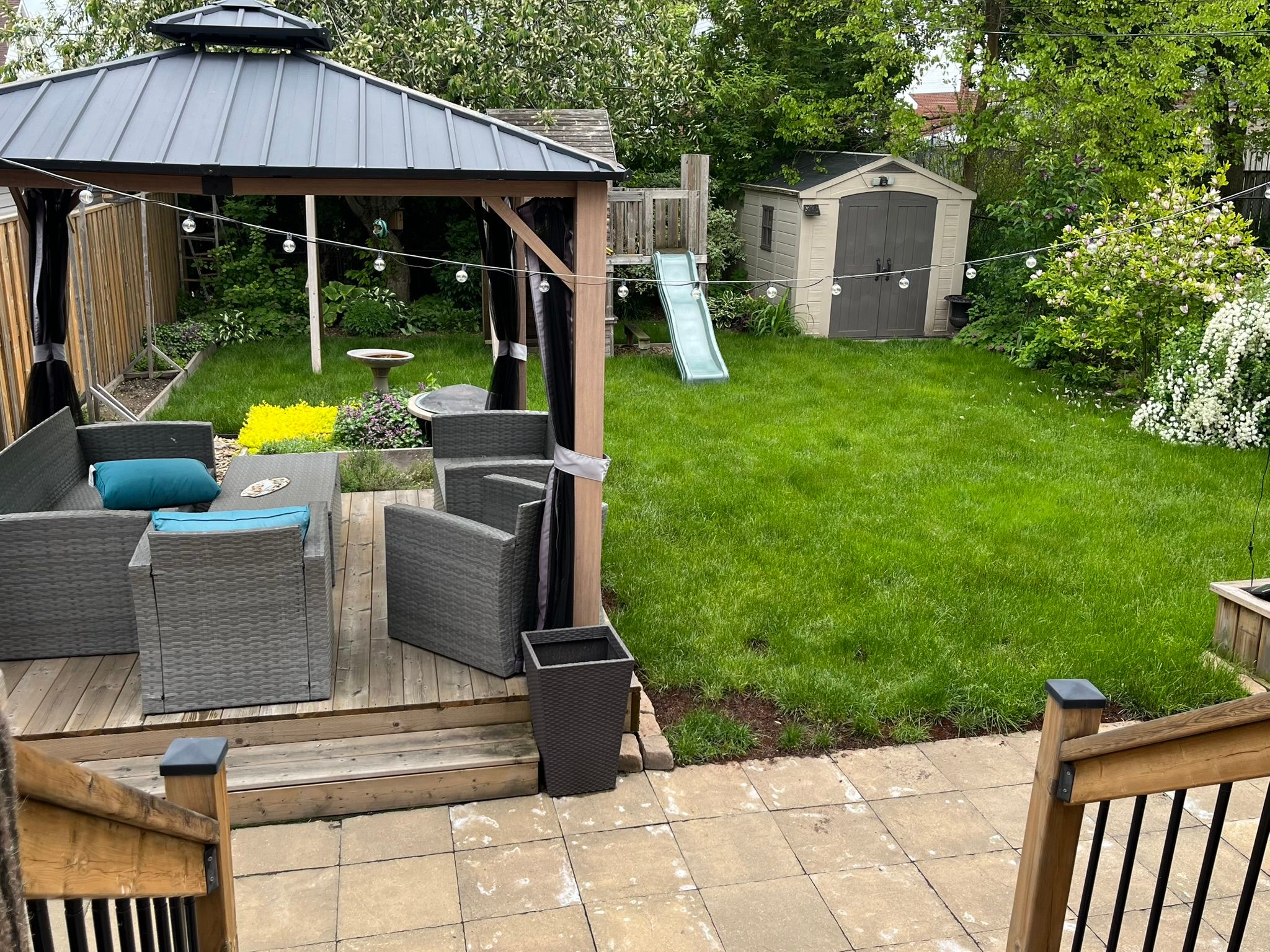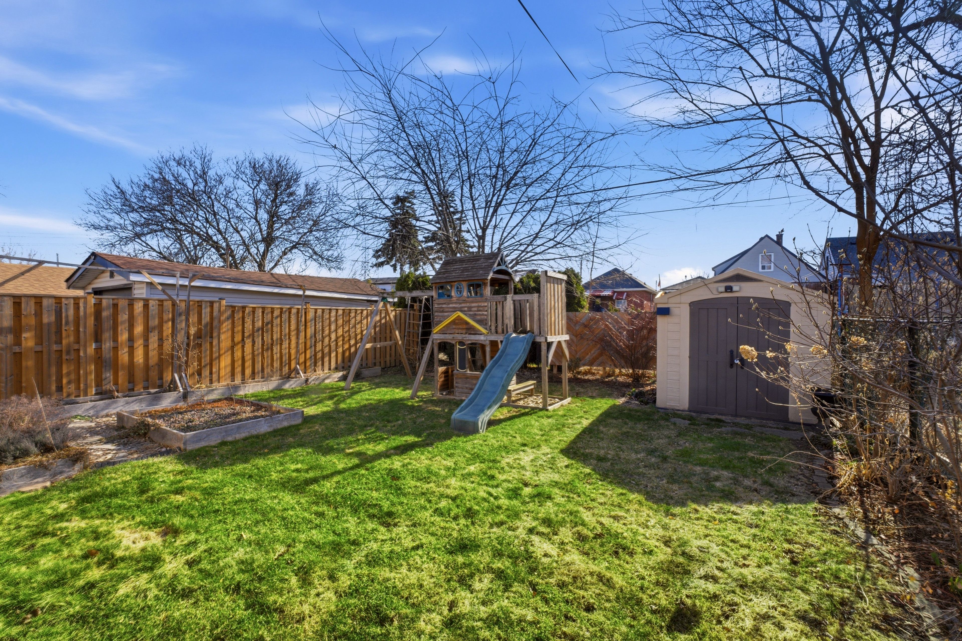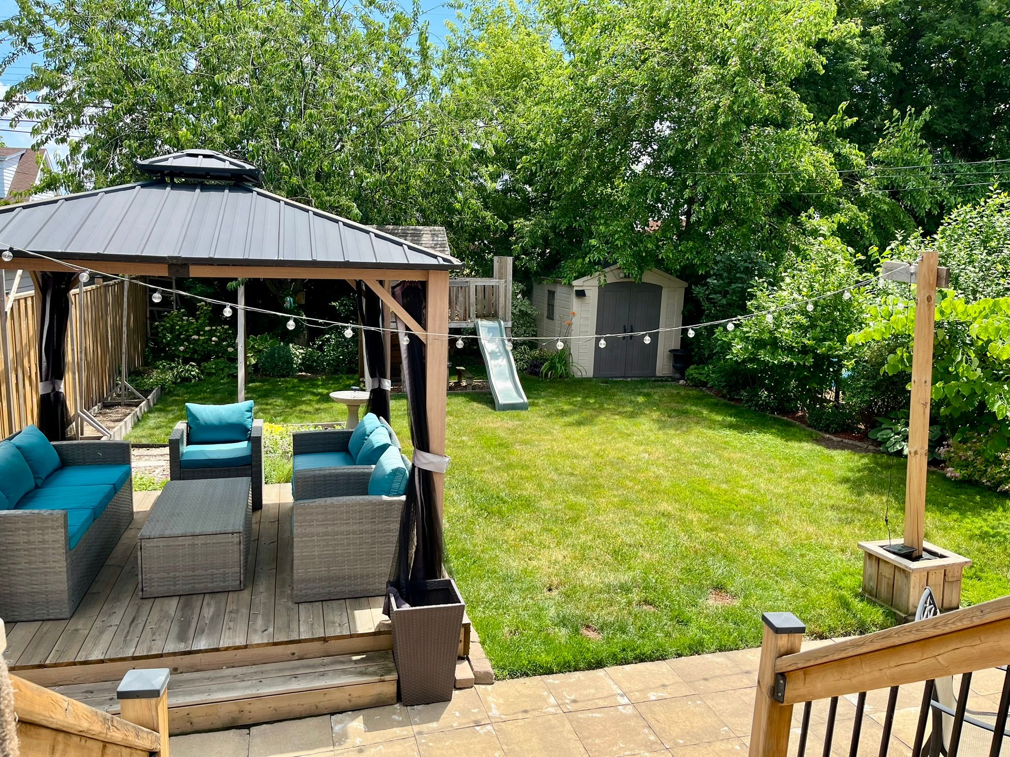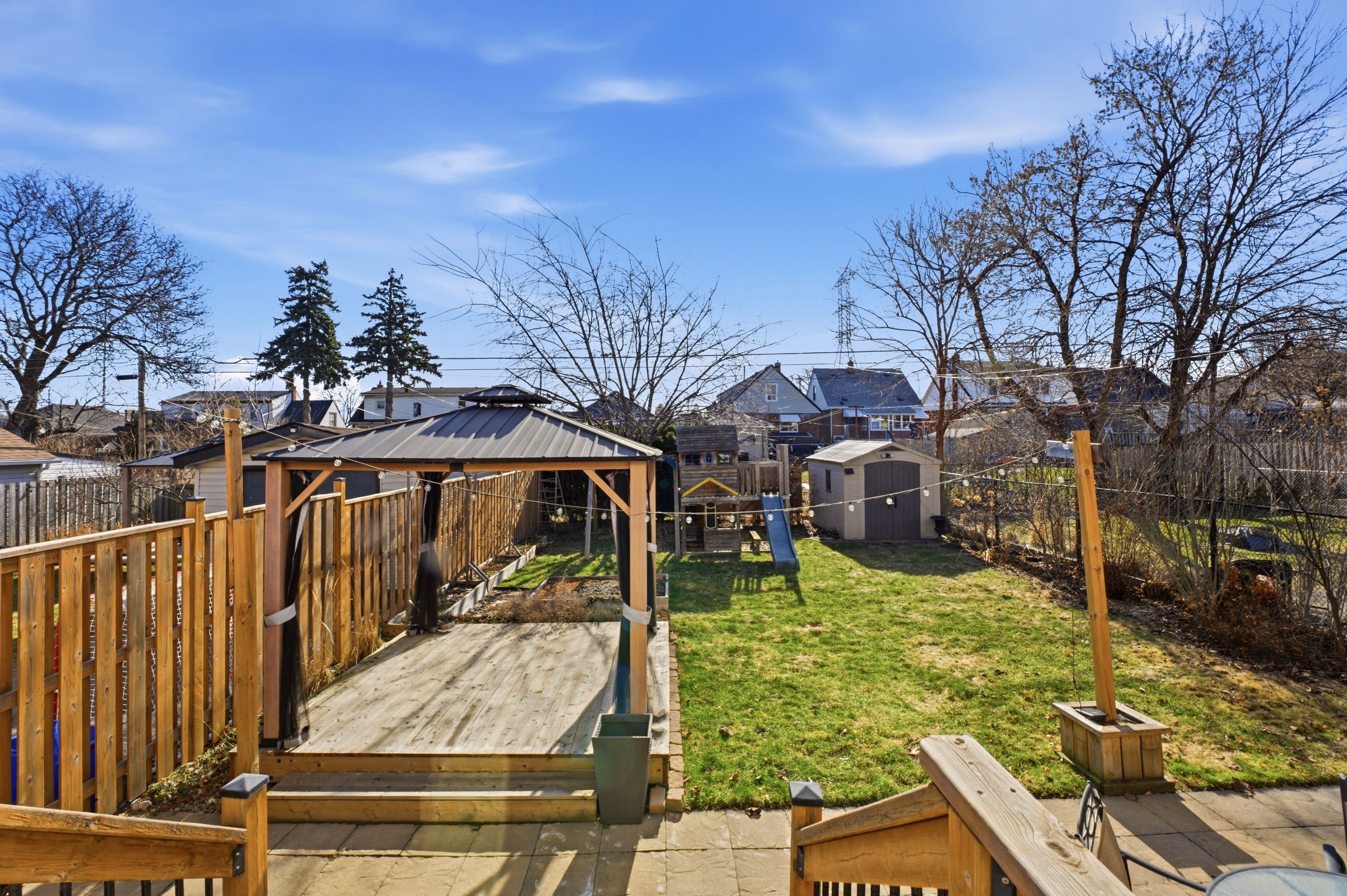 • Large, fenced backyard with gazebo, shed, and play structure.